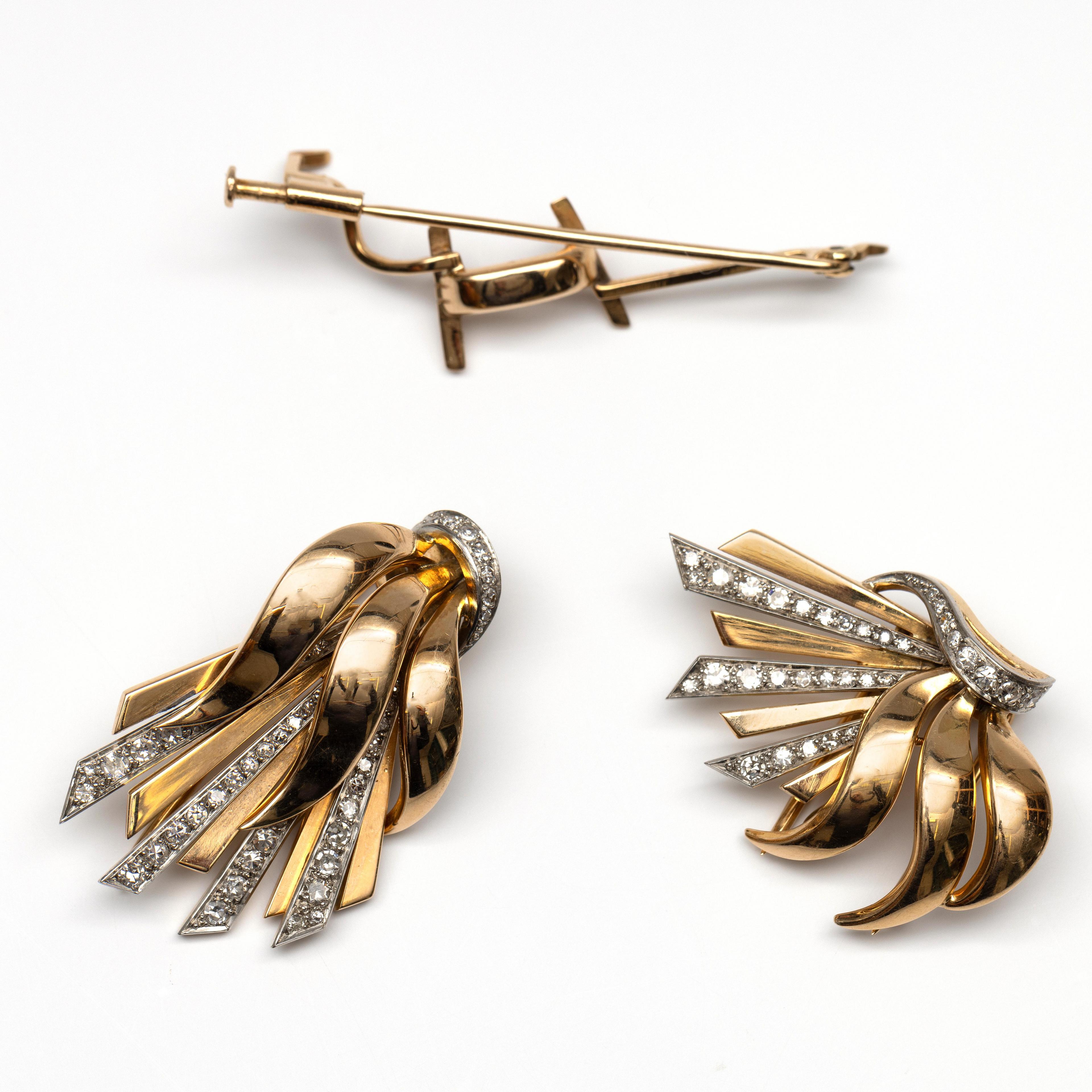 14 kt. Gouden met platina dubbele clipbroche, Retro.