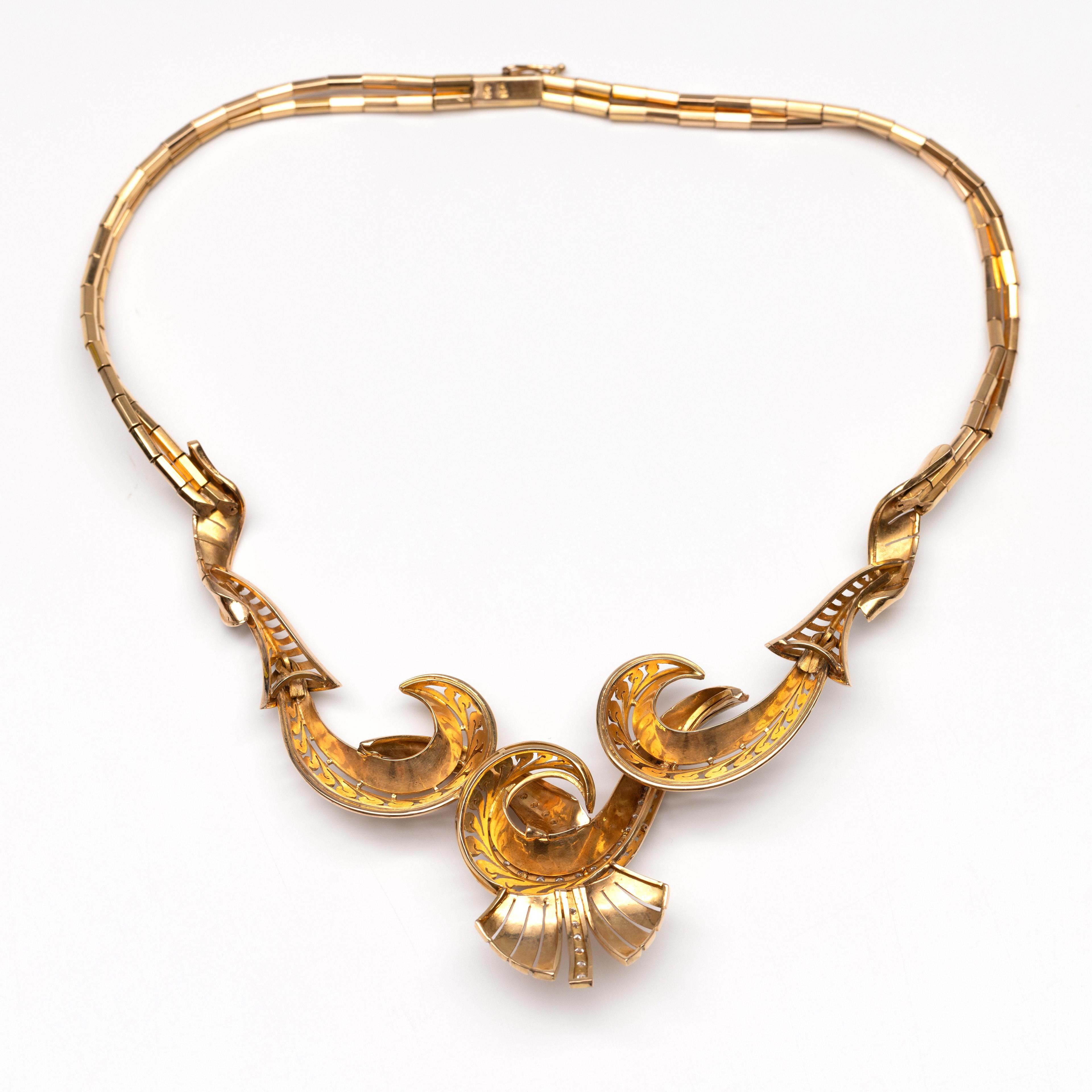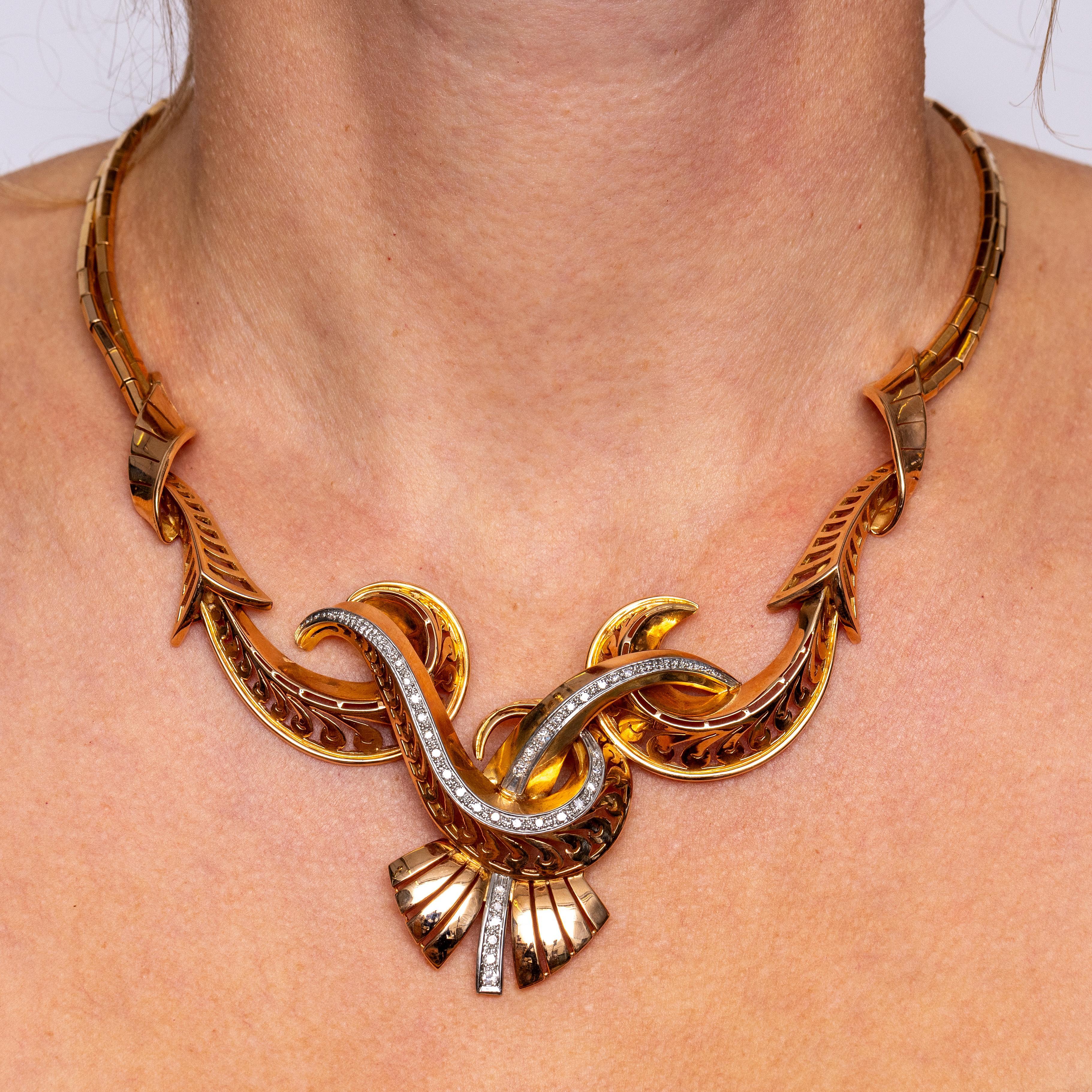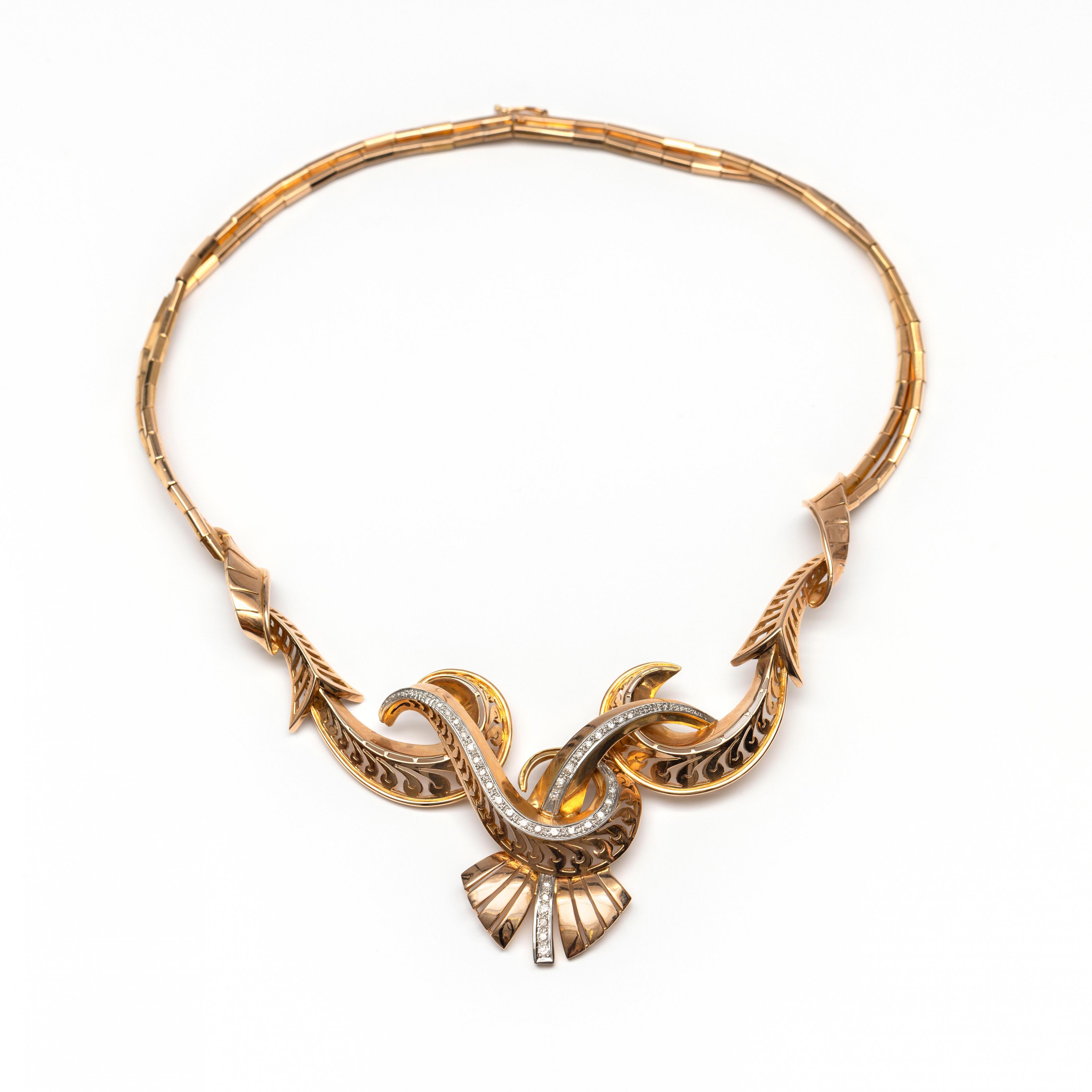 18 k. Gold and platinum necklace, Retro. The front is asymmetrical with a swirling design.Set with single-cut diamonds weighing approximately 0.50 ct in total. Attached to a double string of cylindrical links.