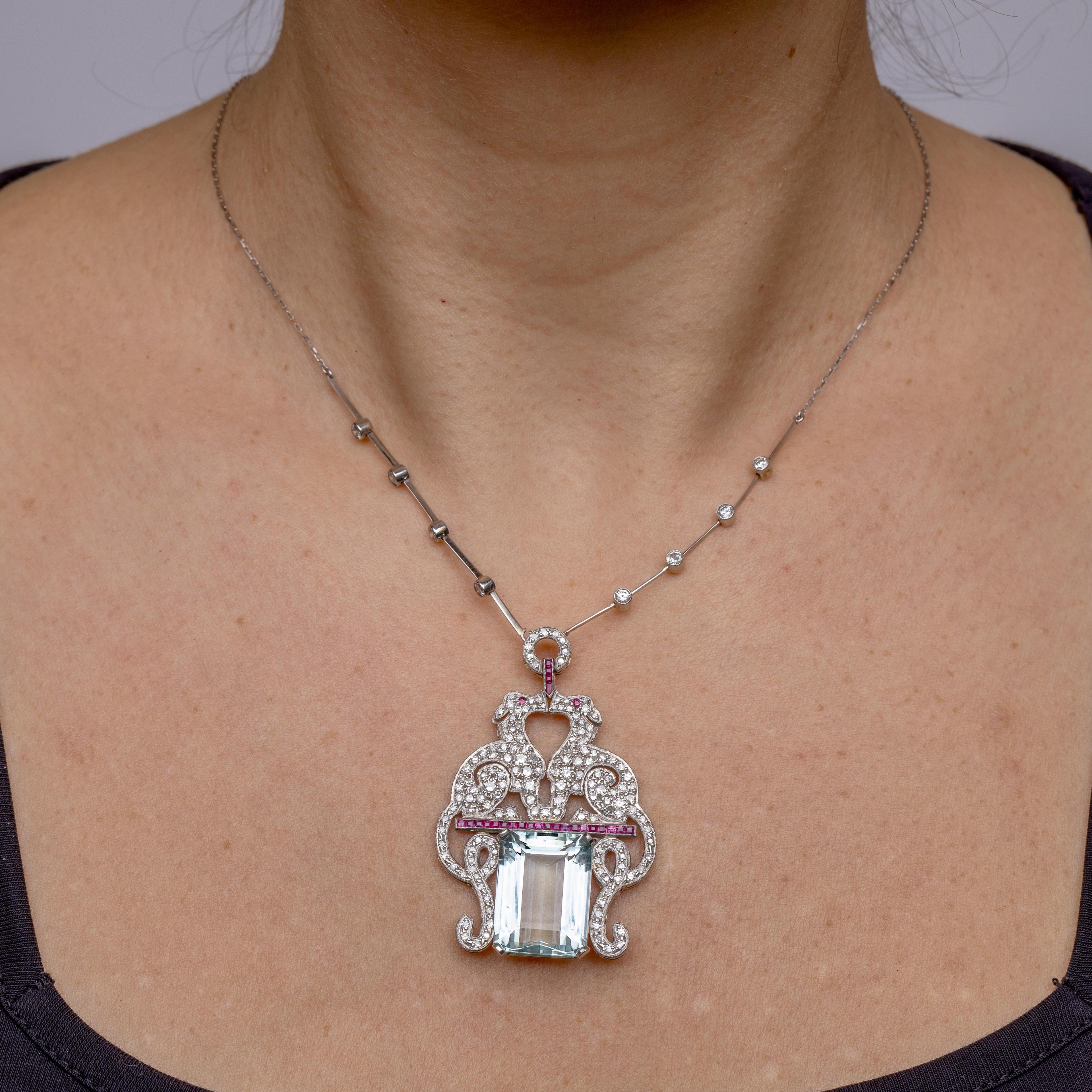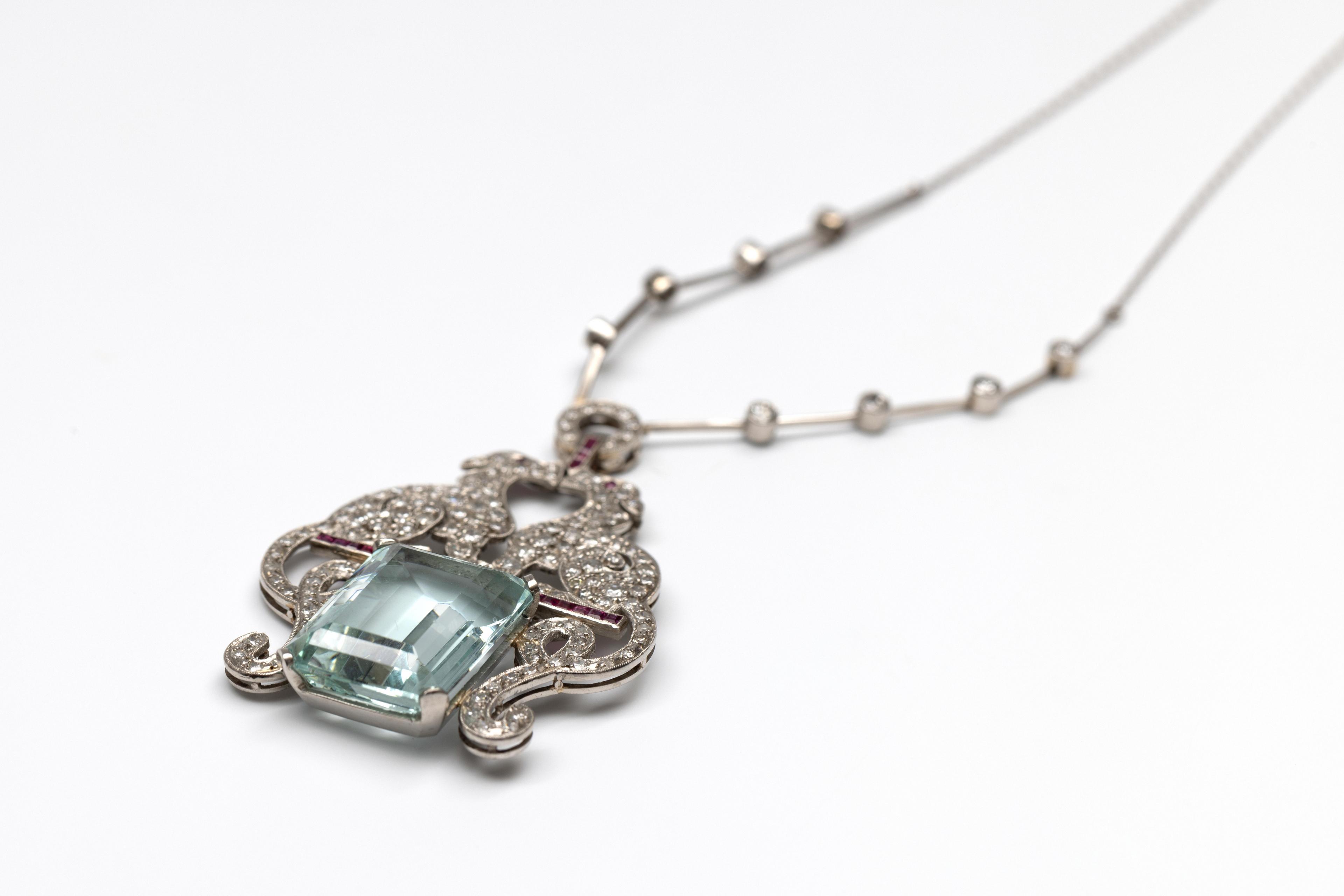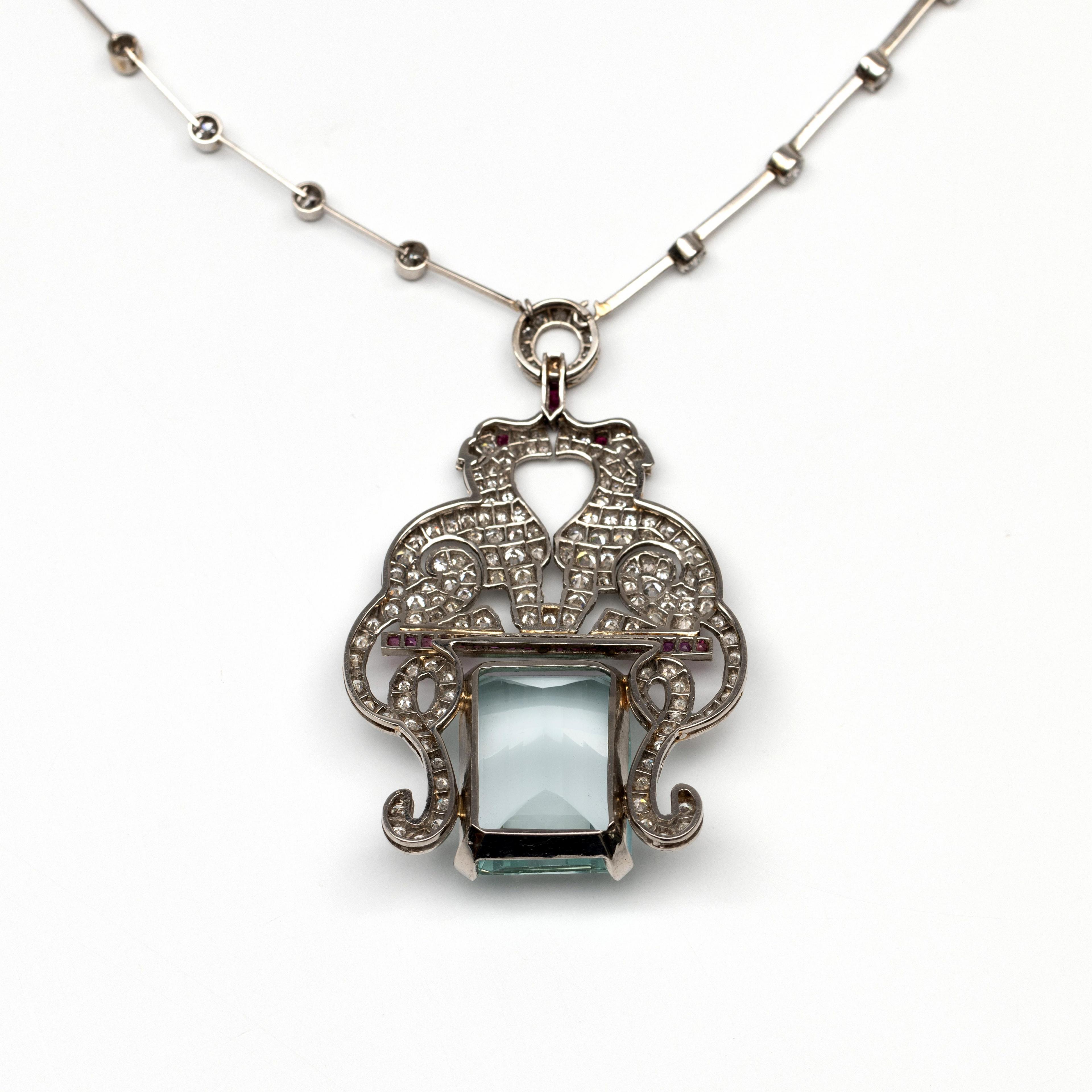 Platinum necklace in Art Deco style. The pendant on the front in the shape of two single-cut diamond-studded greyhounds with long curly tails perched on a calibrated ruby bar, with an emerald-cut aquamarine of approximately 20.7 ct (approx. 19.9 x 14.9 mm) below. Above the dogs a circle and a brilliant-cut diamonds connected by bars. Attached to a delicate cable-link necklace. Total diamond weight approx. 1.40 ct.