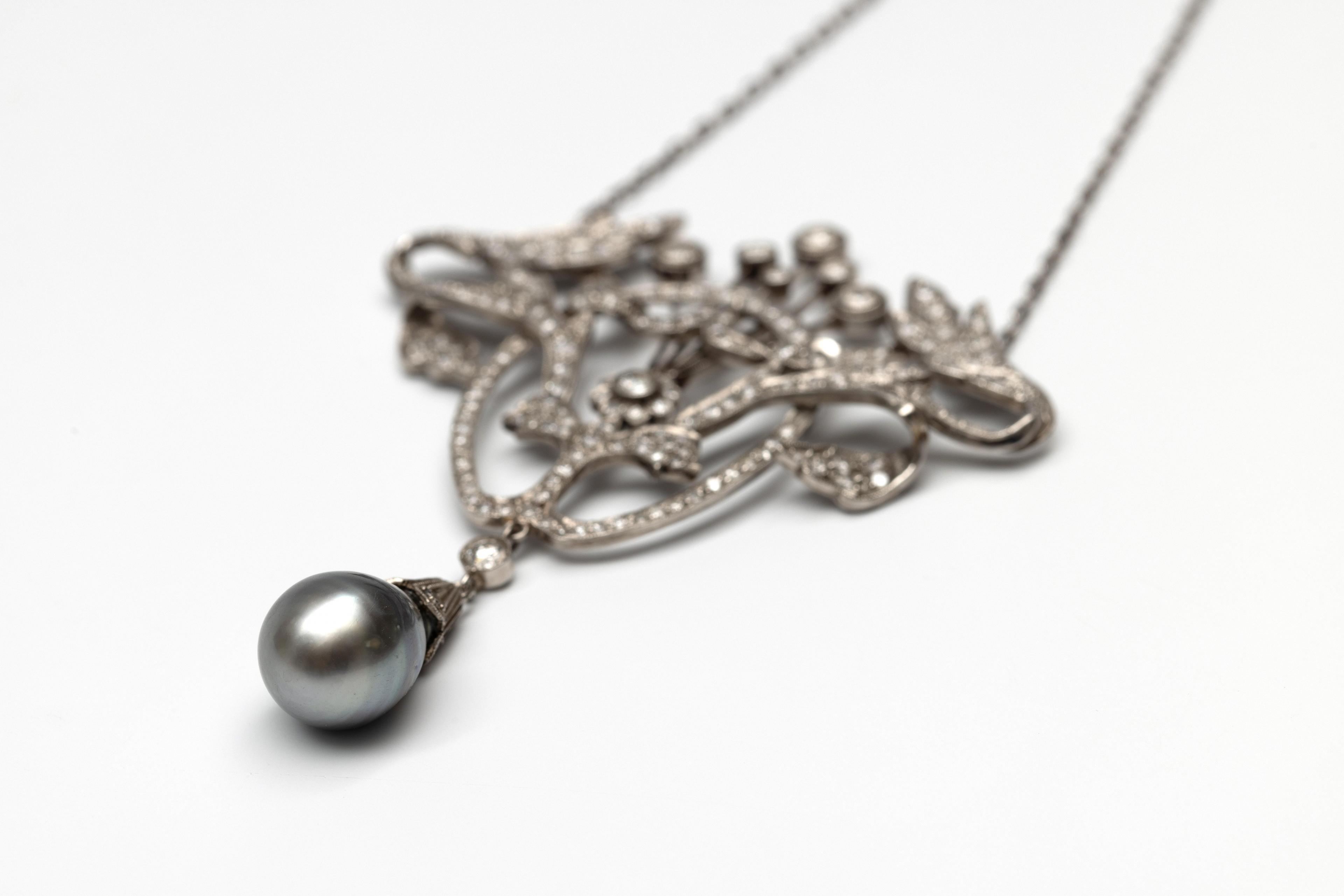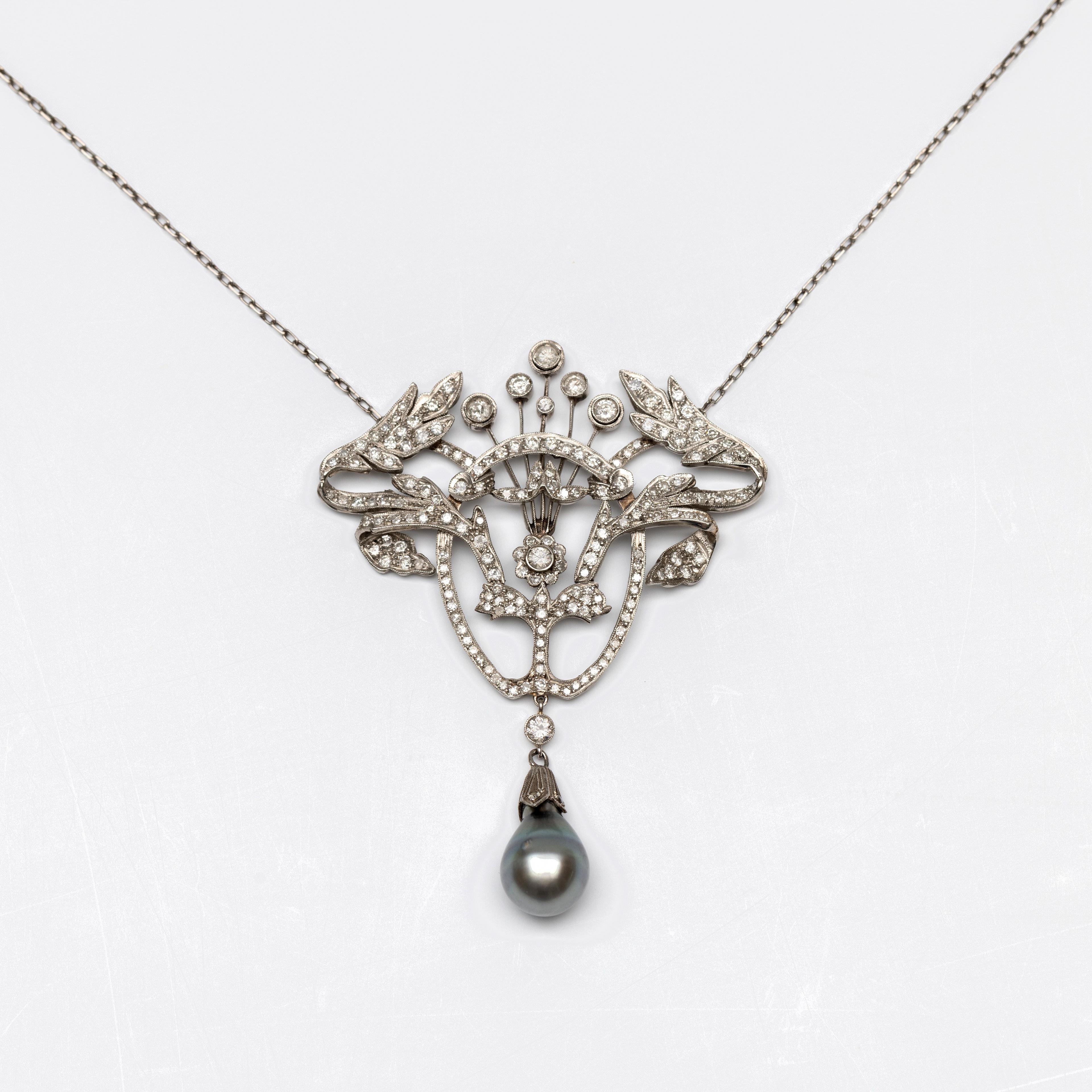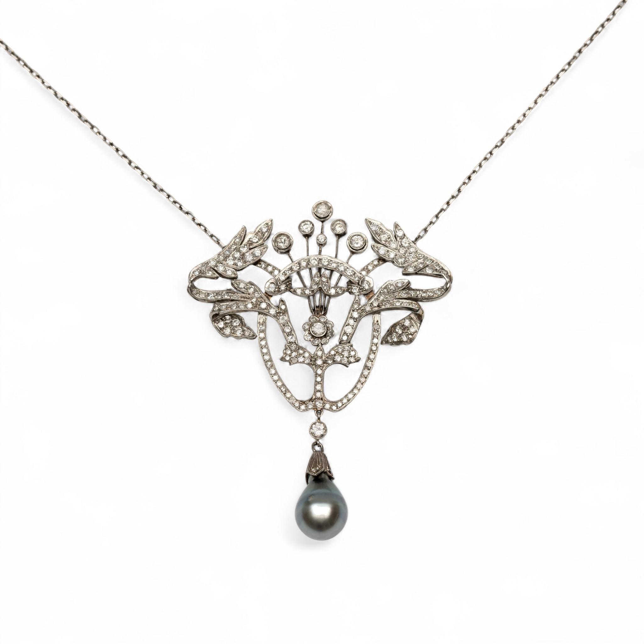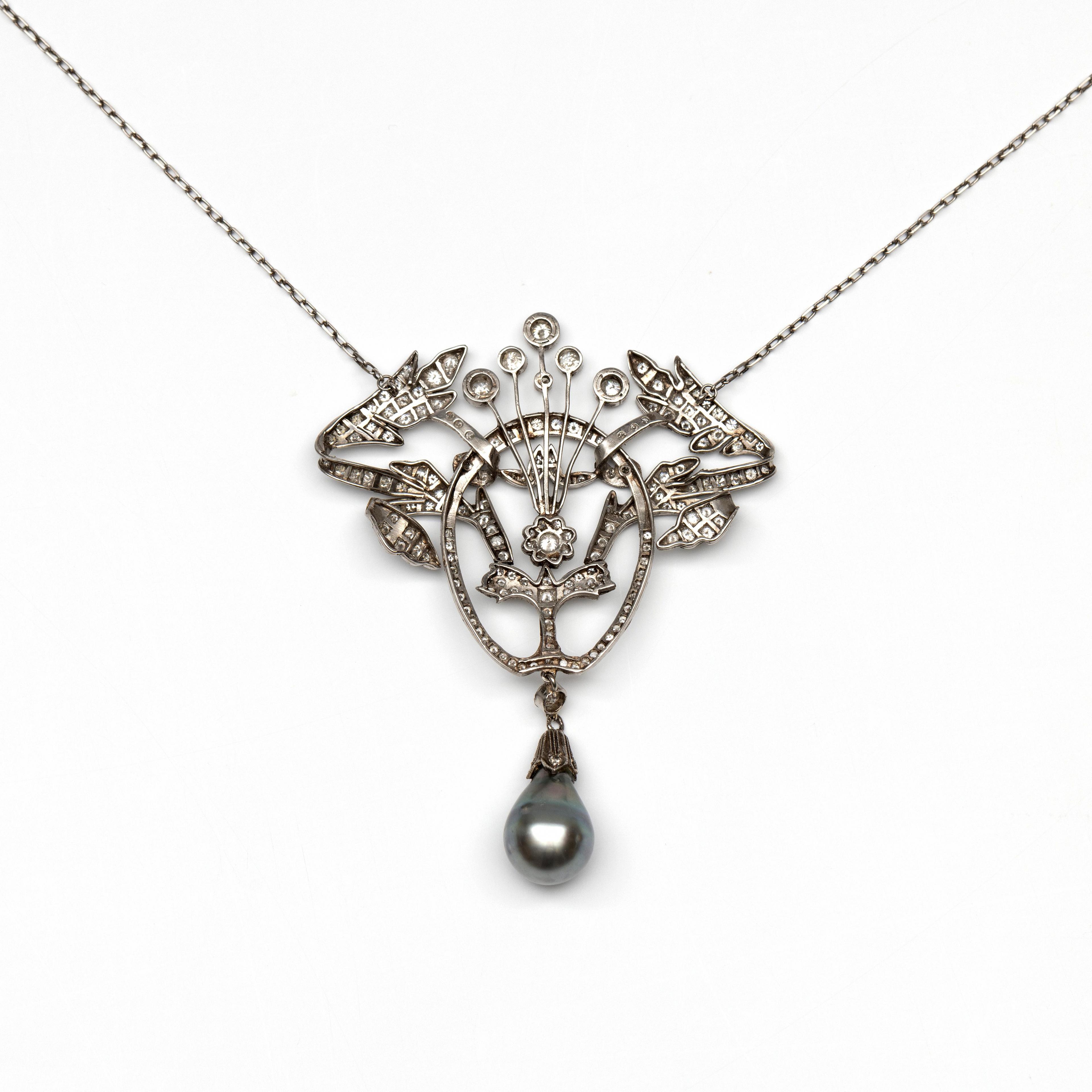 White gold necklace in Belle Epoque style. At the bottom, a large pendant with whiplash and floral motifs, trimmed with mille-grife and set with single and brilliant-cut diamonds weighing approximately 2.50 ct. A drop-shaped Tahitian pearl dangles freely at the bottom. Attached to a cable link necklace.