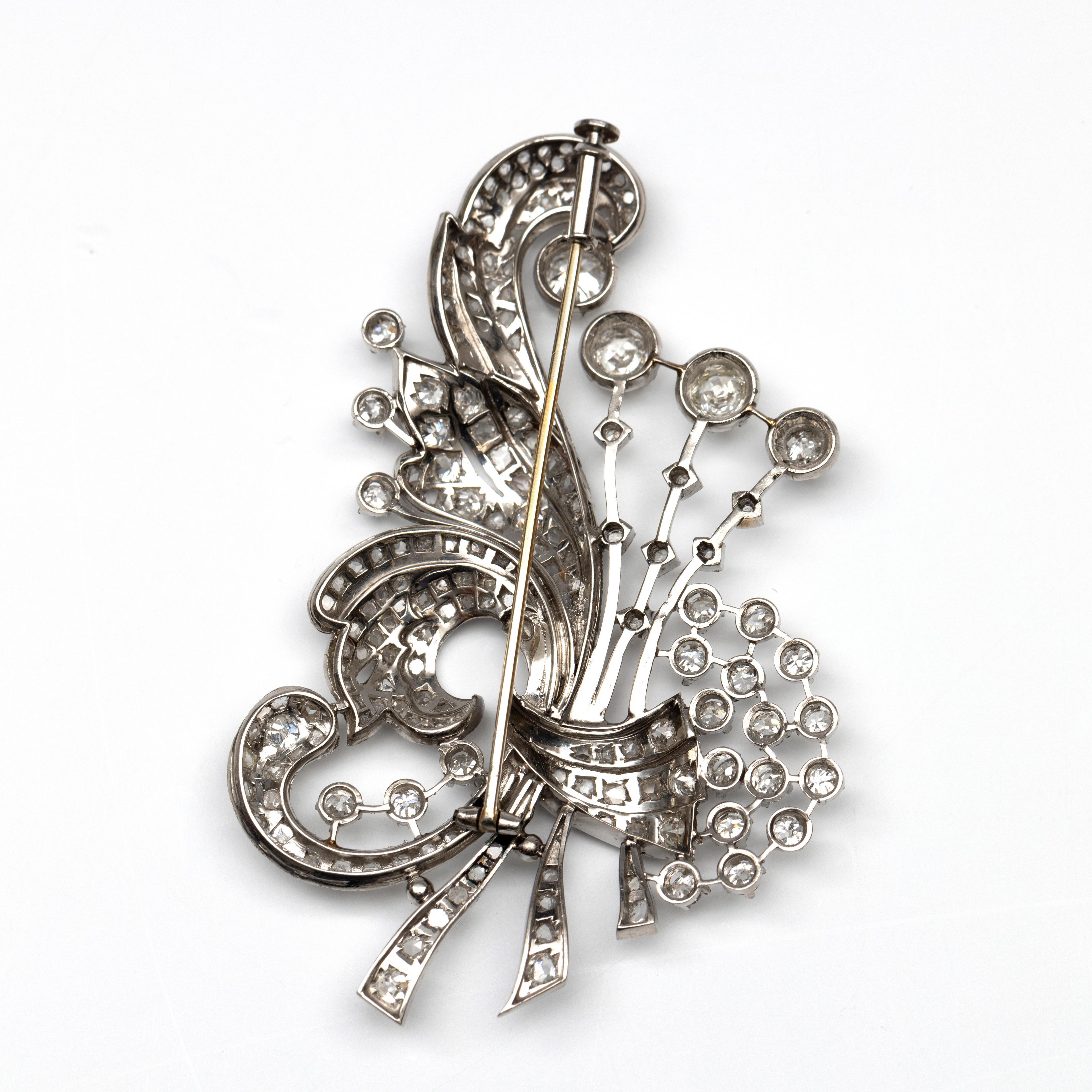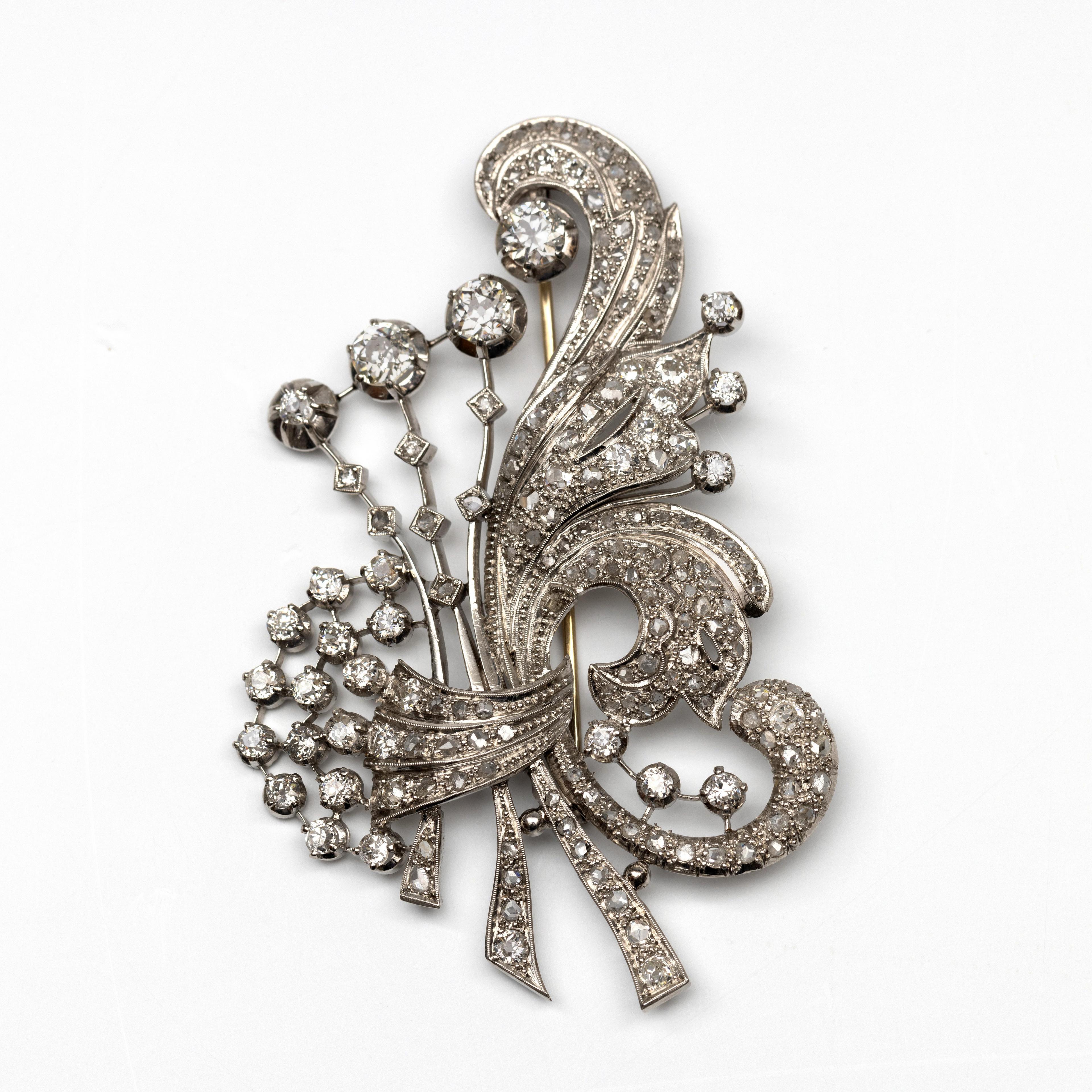 Met krulvormen en spijltjes, bezet met oud briljant en roosgeslepen diamant met een totaalgewicht van ca. 4.00 ct.