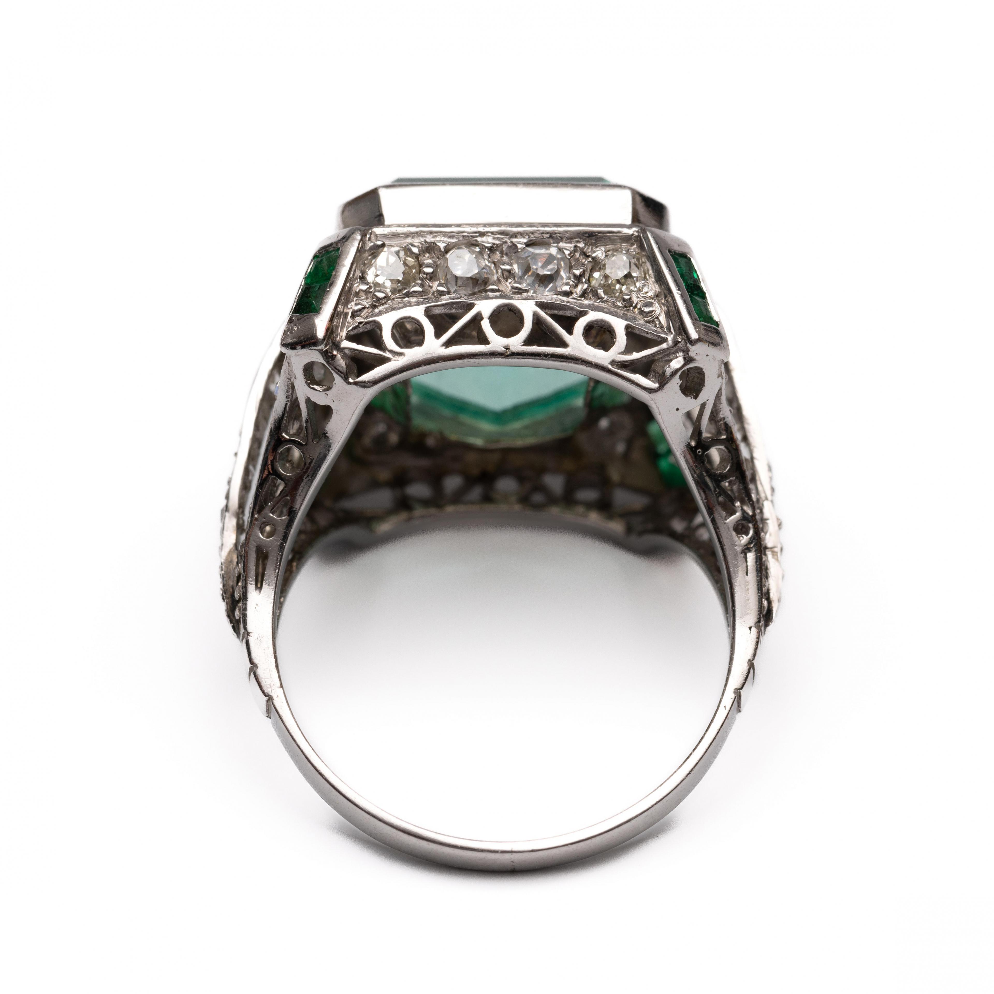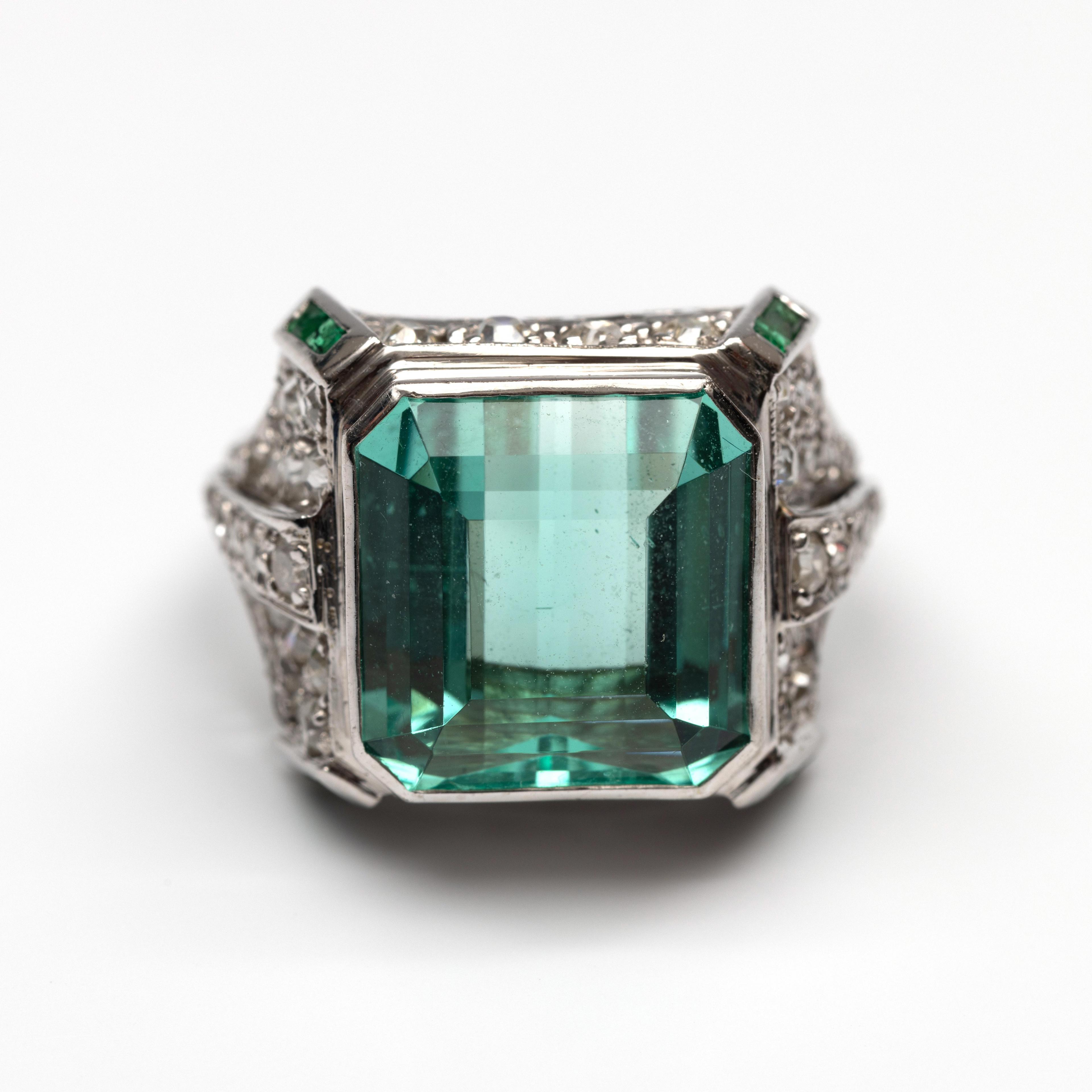 met achthoekige bovenzijde, bezet met een emerald geslepen heldere blauwgroene beryl van ca. 7.63 ct. (ca. 12 x 12.3 mm). De hoeken elk bezet met twee kalibré geslepen smaragden, de schouders en boven en onderzijde van de bovenkant pavé bezet met oud briljant geslepen diamant met een totaalgewicht van ca. 1.15 ct.