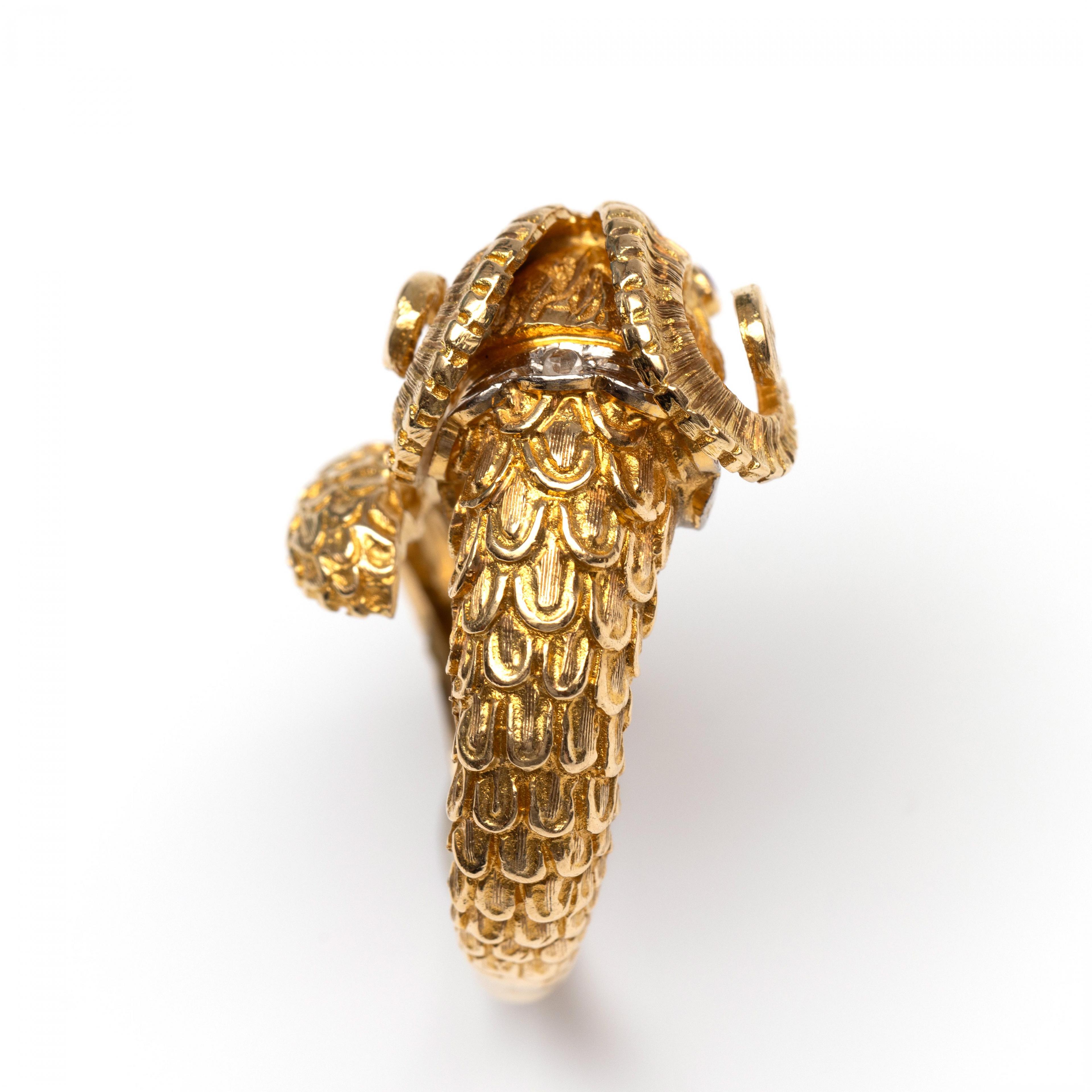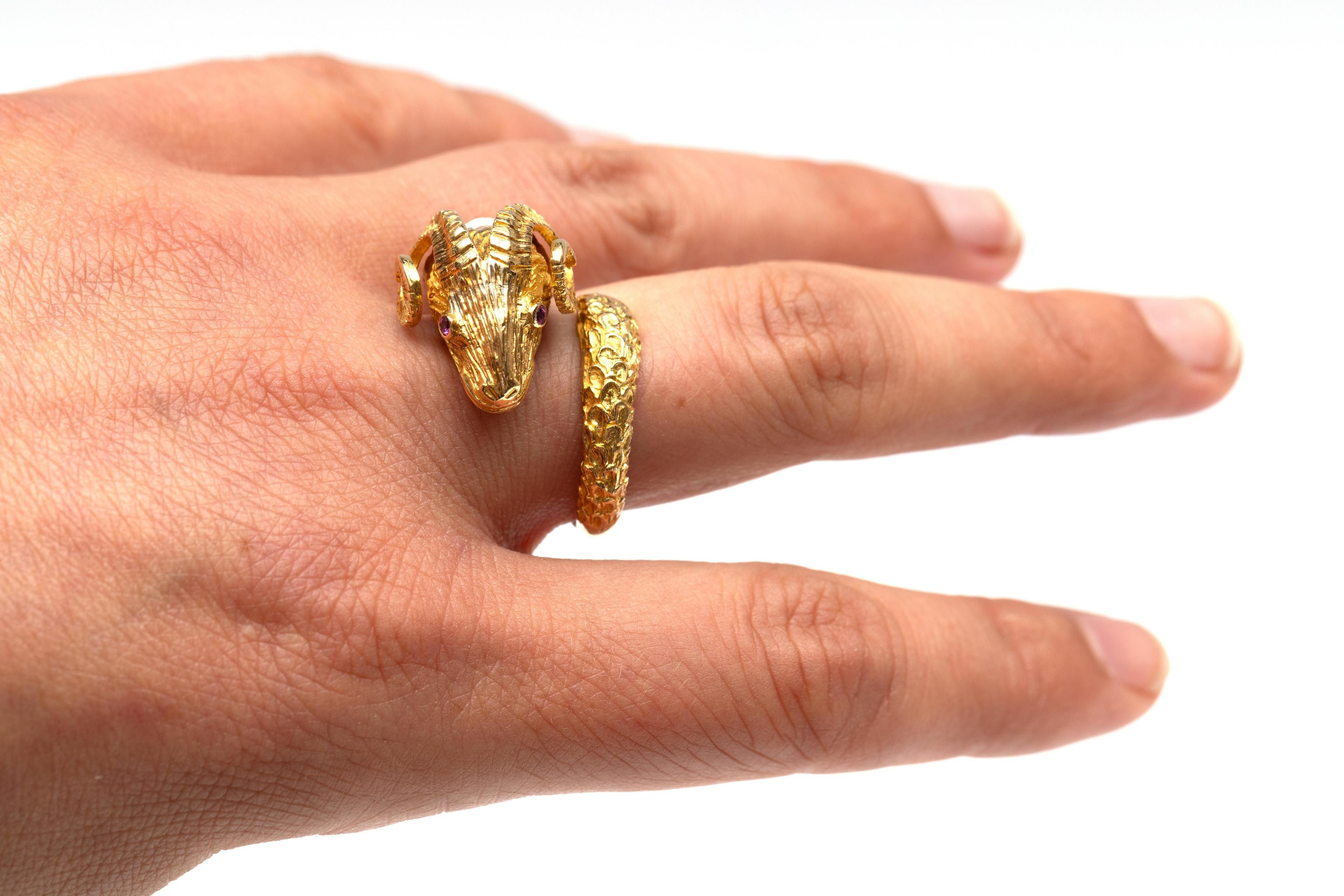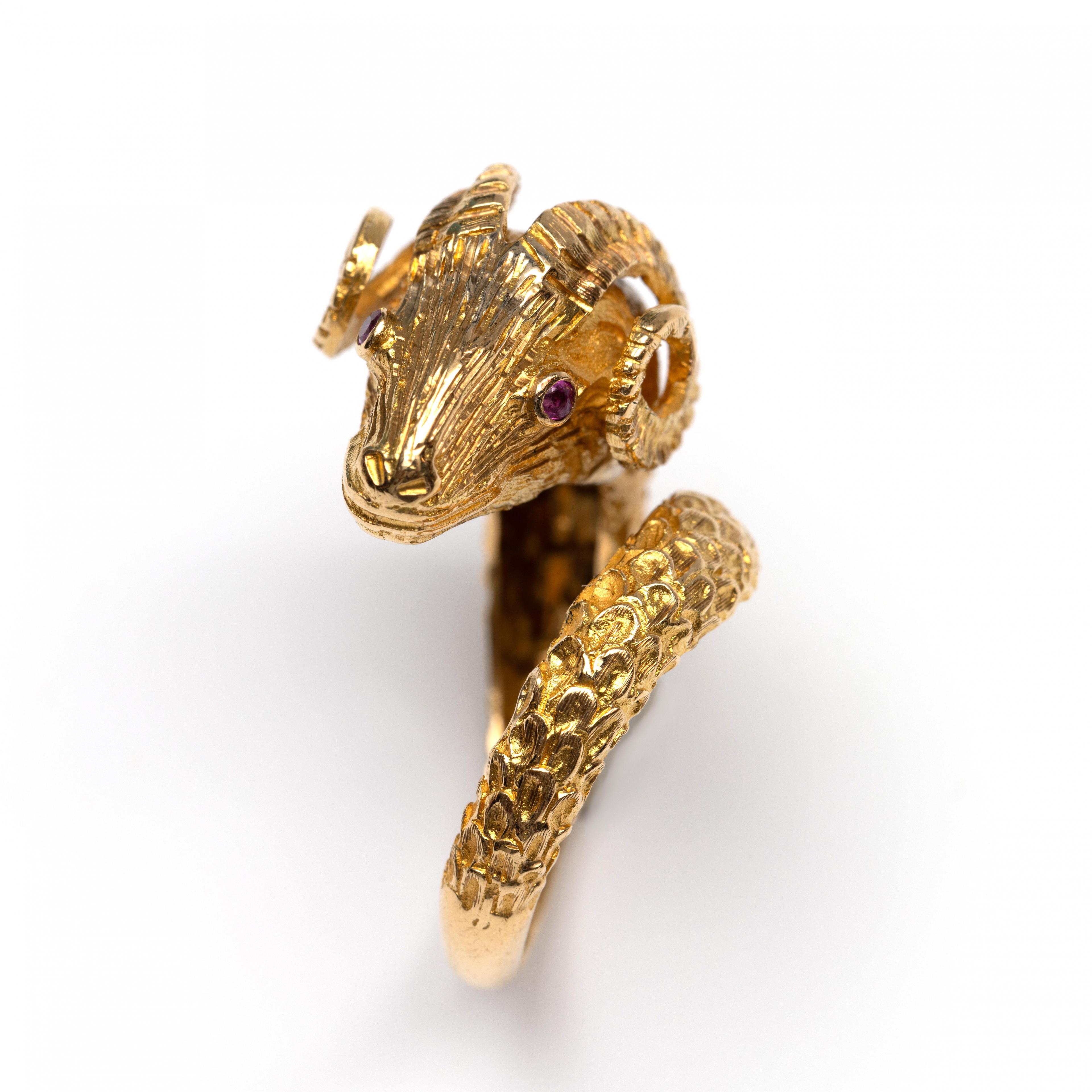 Greece, a curled 18 k. gold ring shaped like a ram's head with curved horns. The eyes are set with a small ruby, the collar is set with a rose-cut diamond.