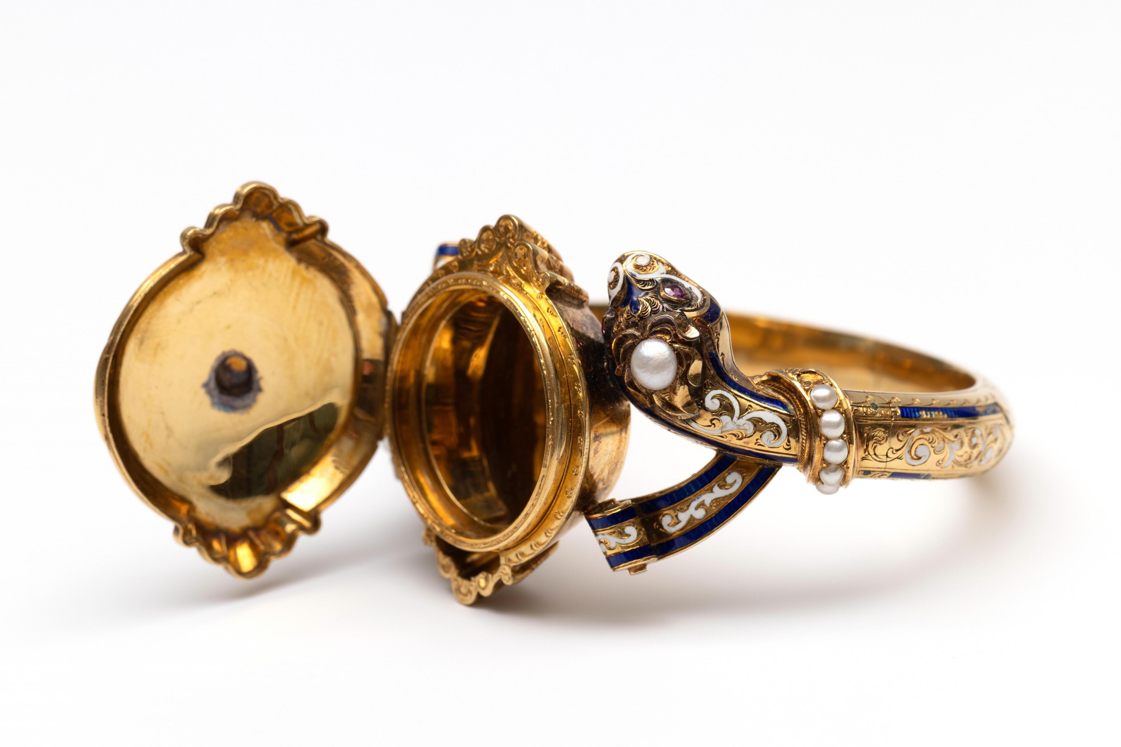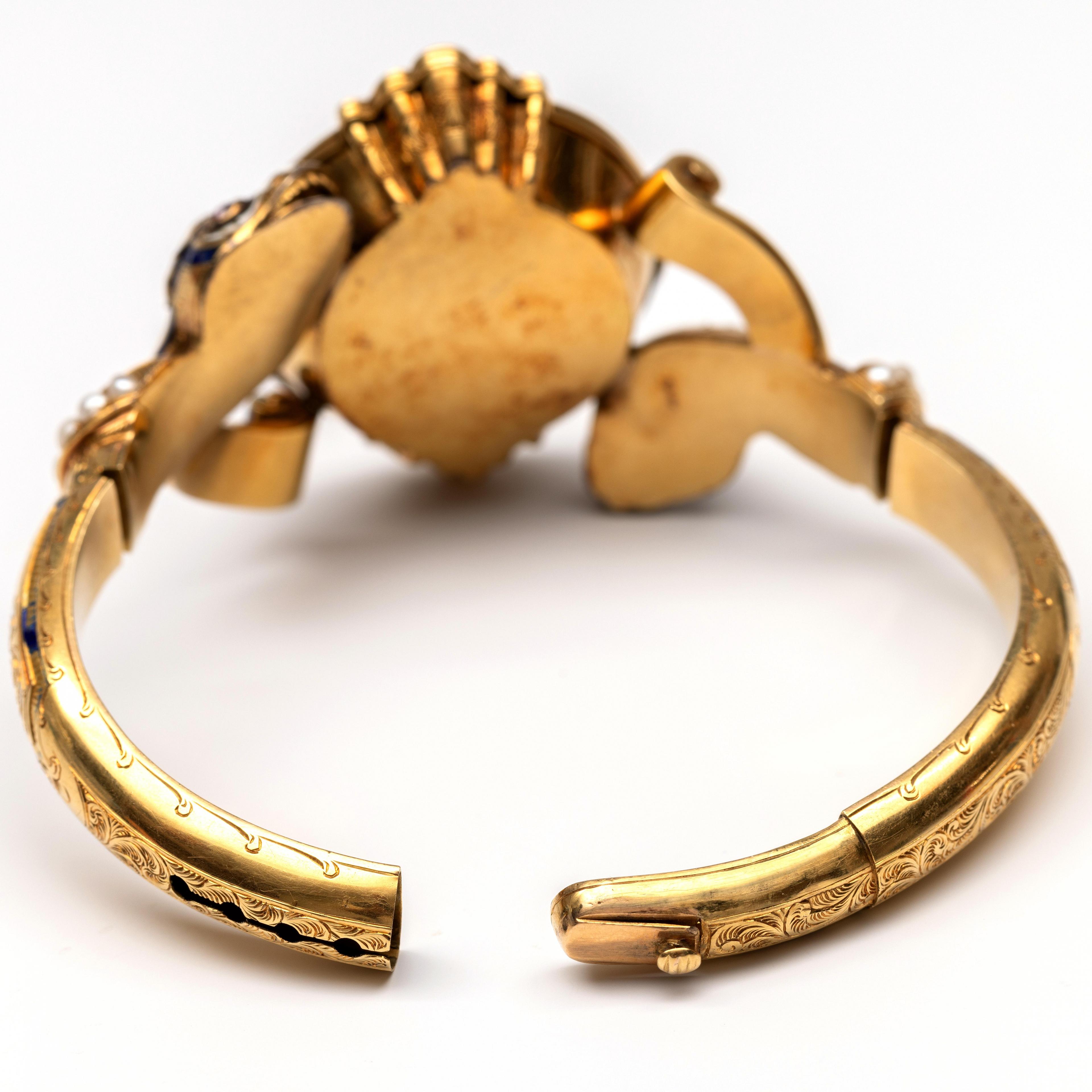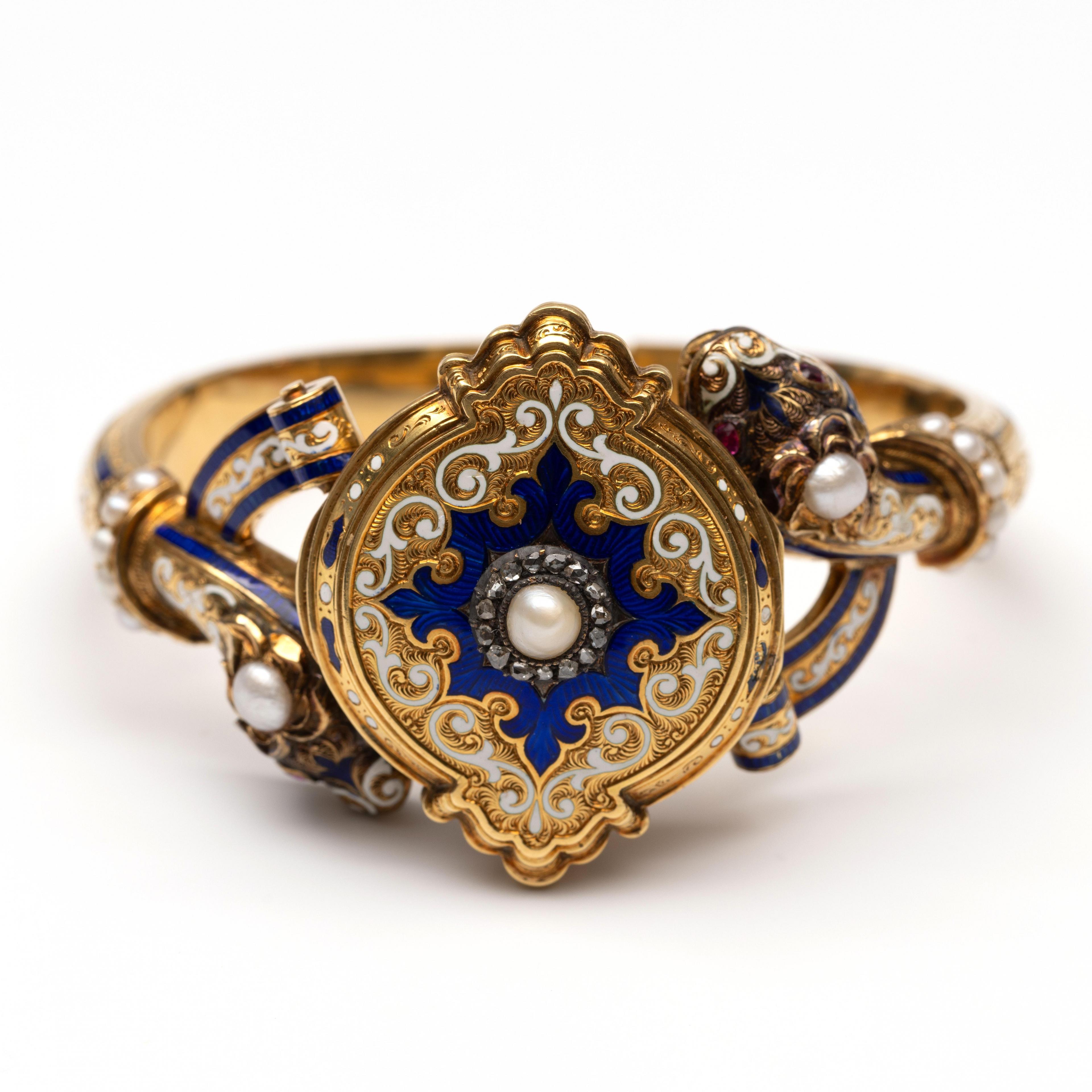 14 k. Gold bracelet, Biedermeier. With locket on top, originally containing a watch. The lid set with a presumably natural pearl surrounded by fine rose-cut diamonds. The shoulders are shaped like snakes and ribbons with eyes of faceted ruby, the head and collar set with half pearls, presumably natural. The entire bracelet richly decorated with engravings. The top also decorated with blue and white enamel. The bracelet can be worn in four sizes.
