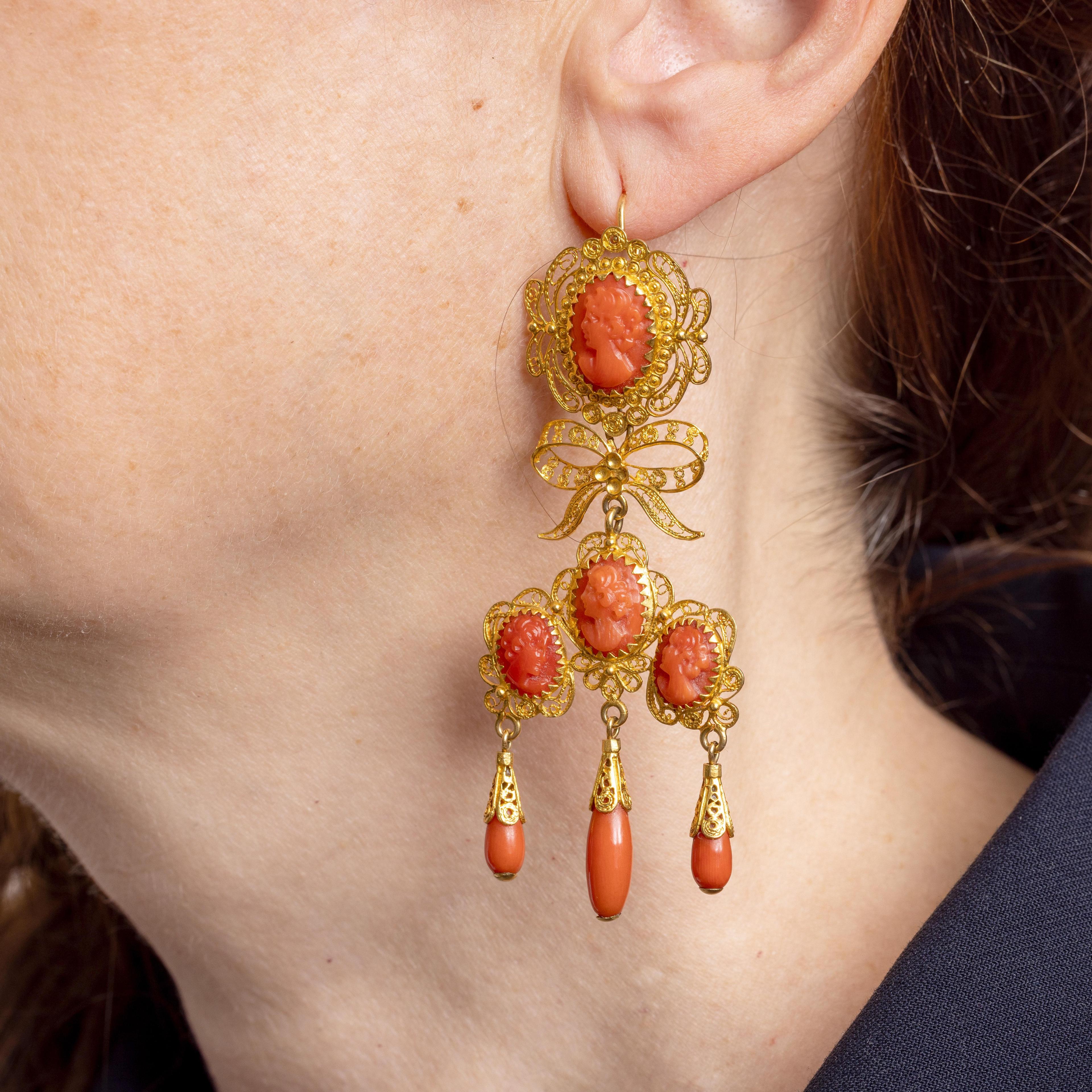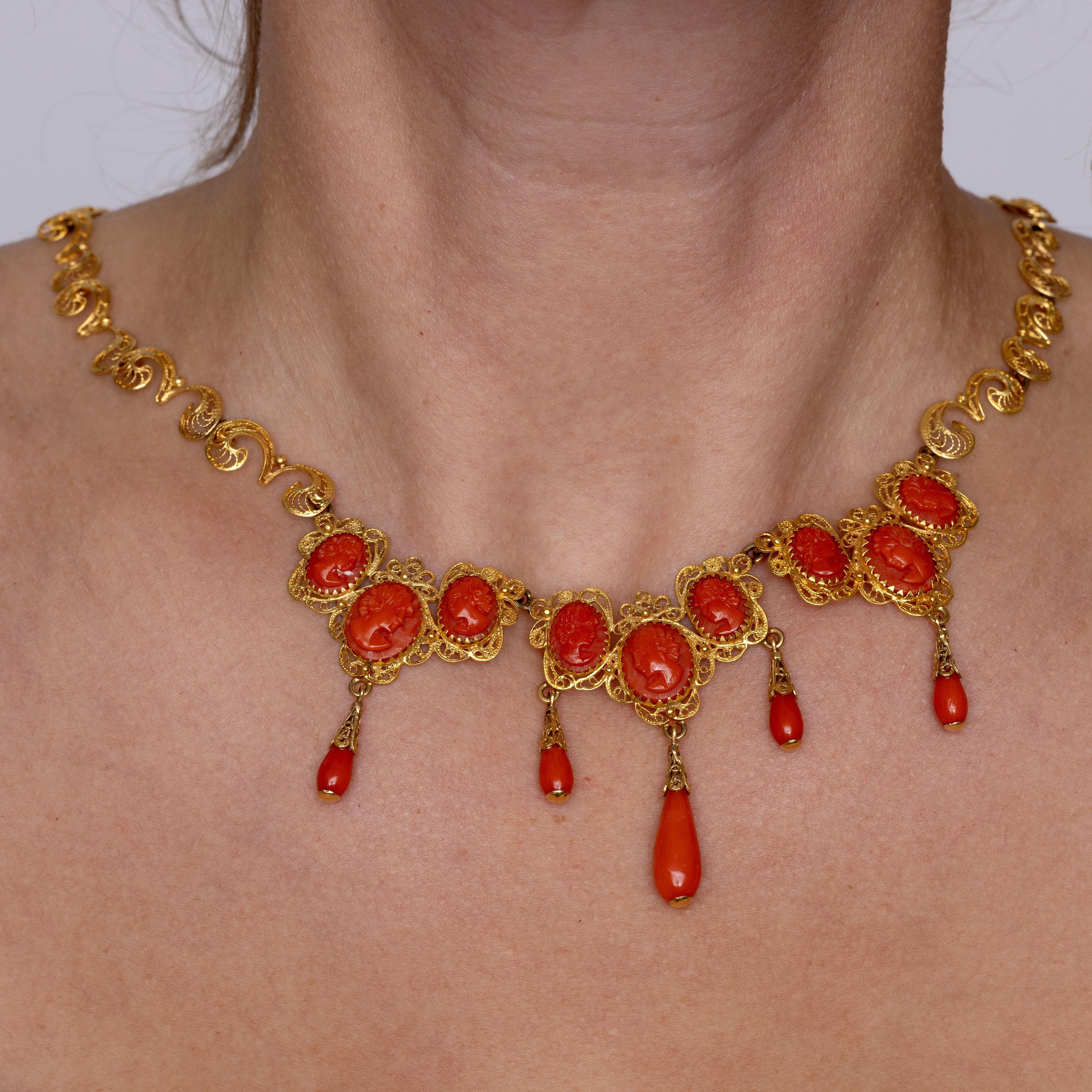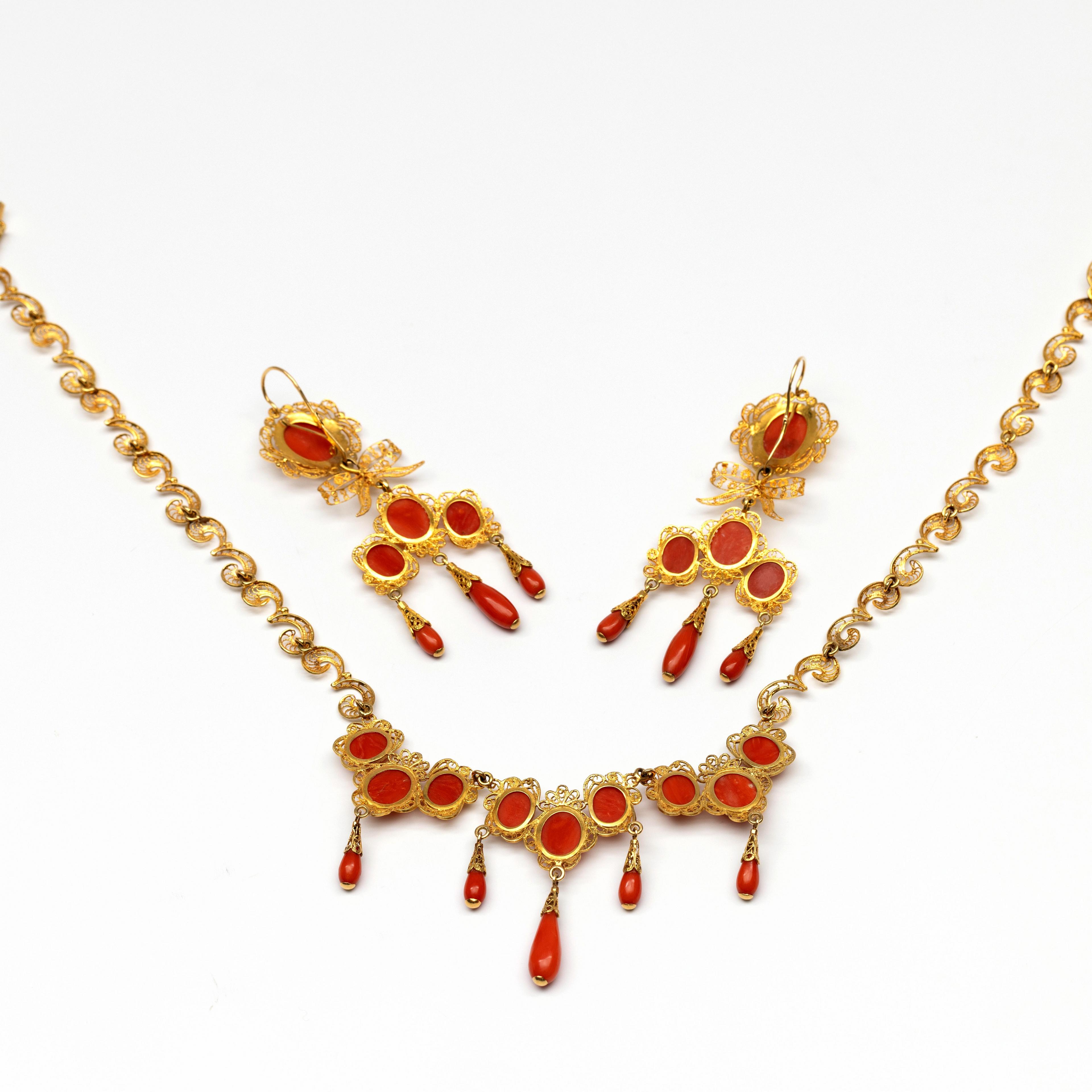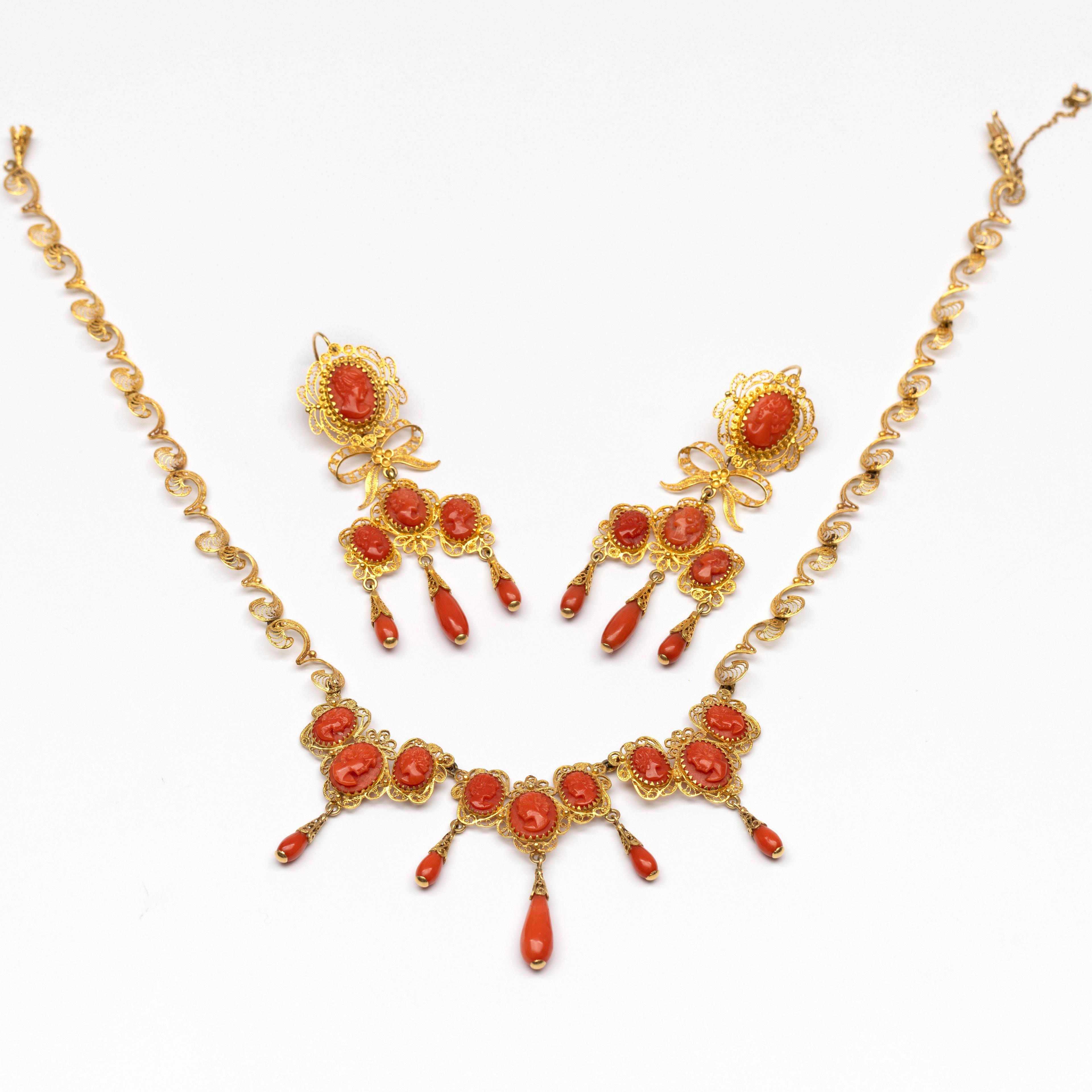 14 k. Gold girandole earrings and necklace. Set with oval red coral cameos depicting a lady 'en profil'. The bottom with coral drops. Both made of filigree and decorated with scroll motifs. The earrings also with a bow.
