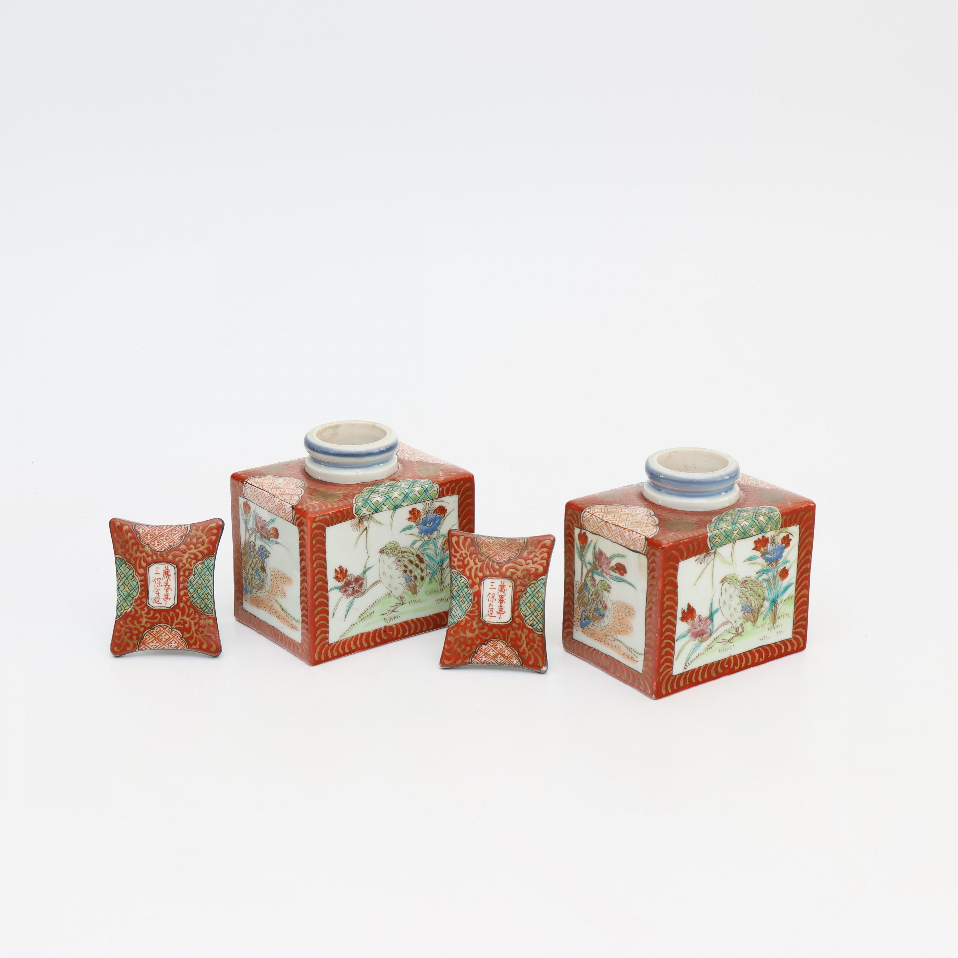 decorated in mother-of-pearl with flowers, birds and butterflies, the canisters painted with quails, the stoppers marked with characters
