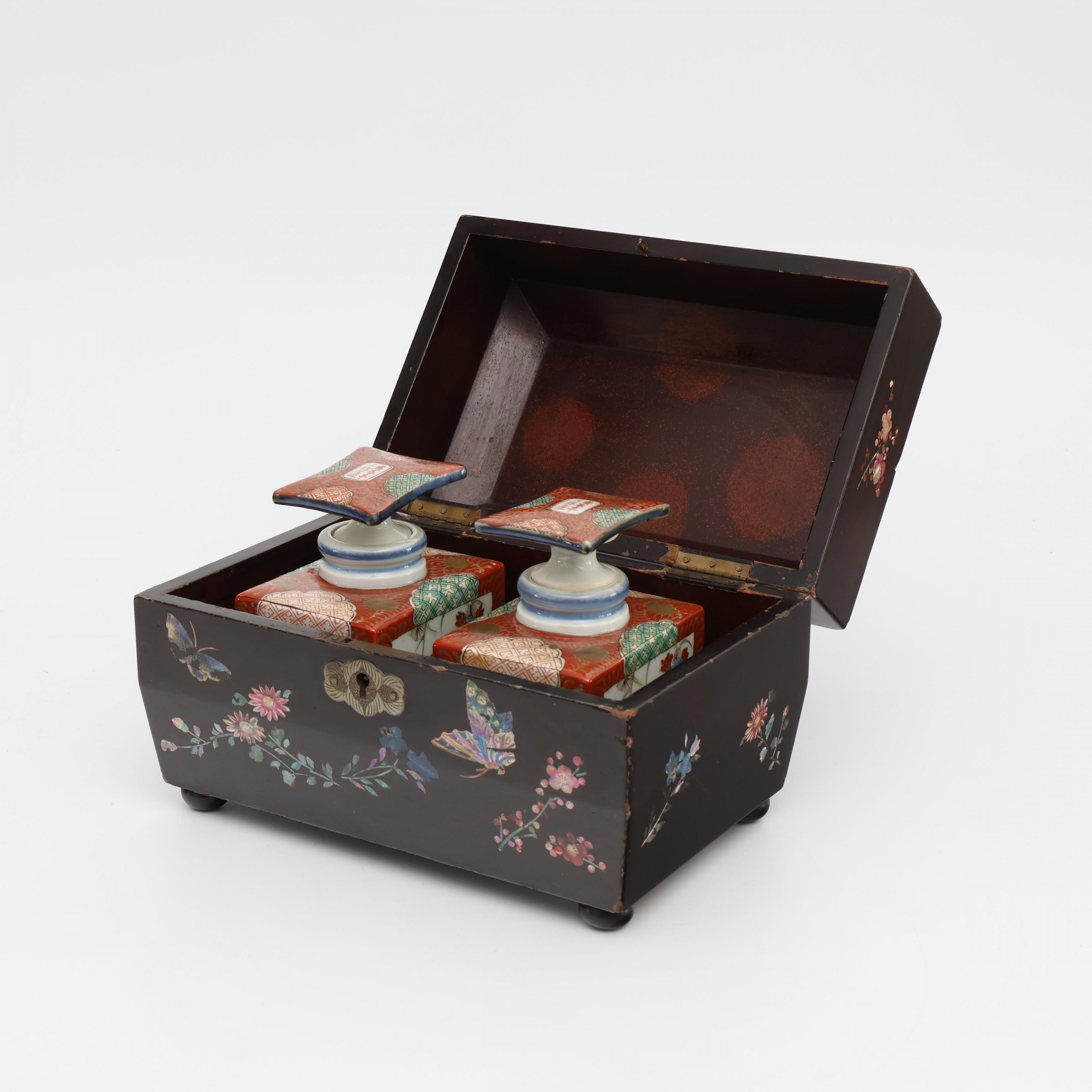 Japan, a black Nagasaki lacquered tea-caddy with porcelain canisters, Meiji period (1868-1912),