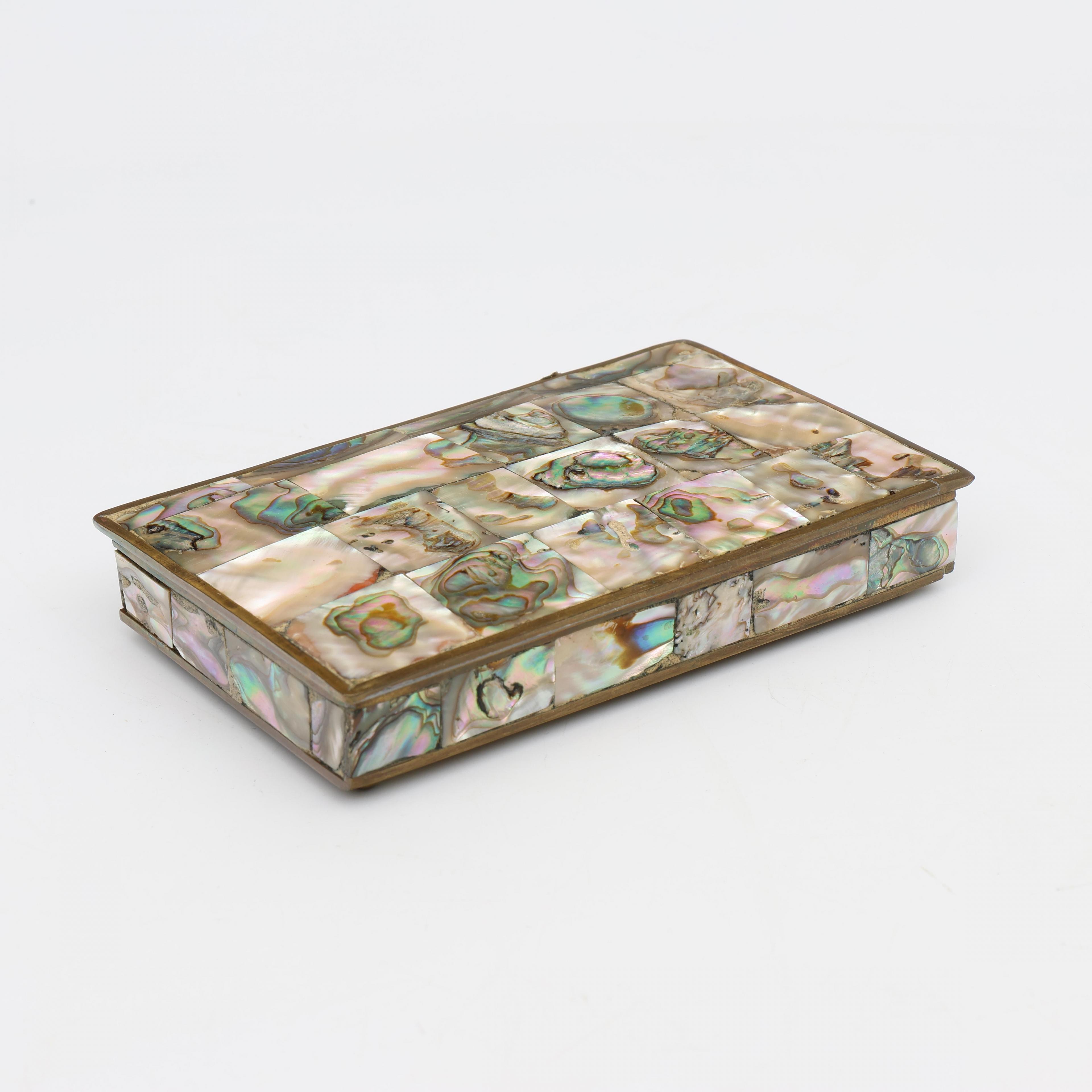 Mexico, met parelmoer opgelegd koperen lepeldoosje;