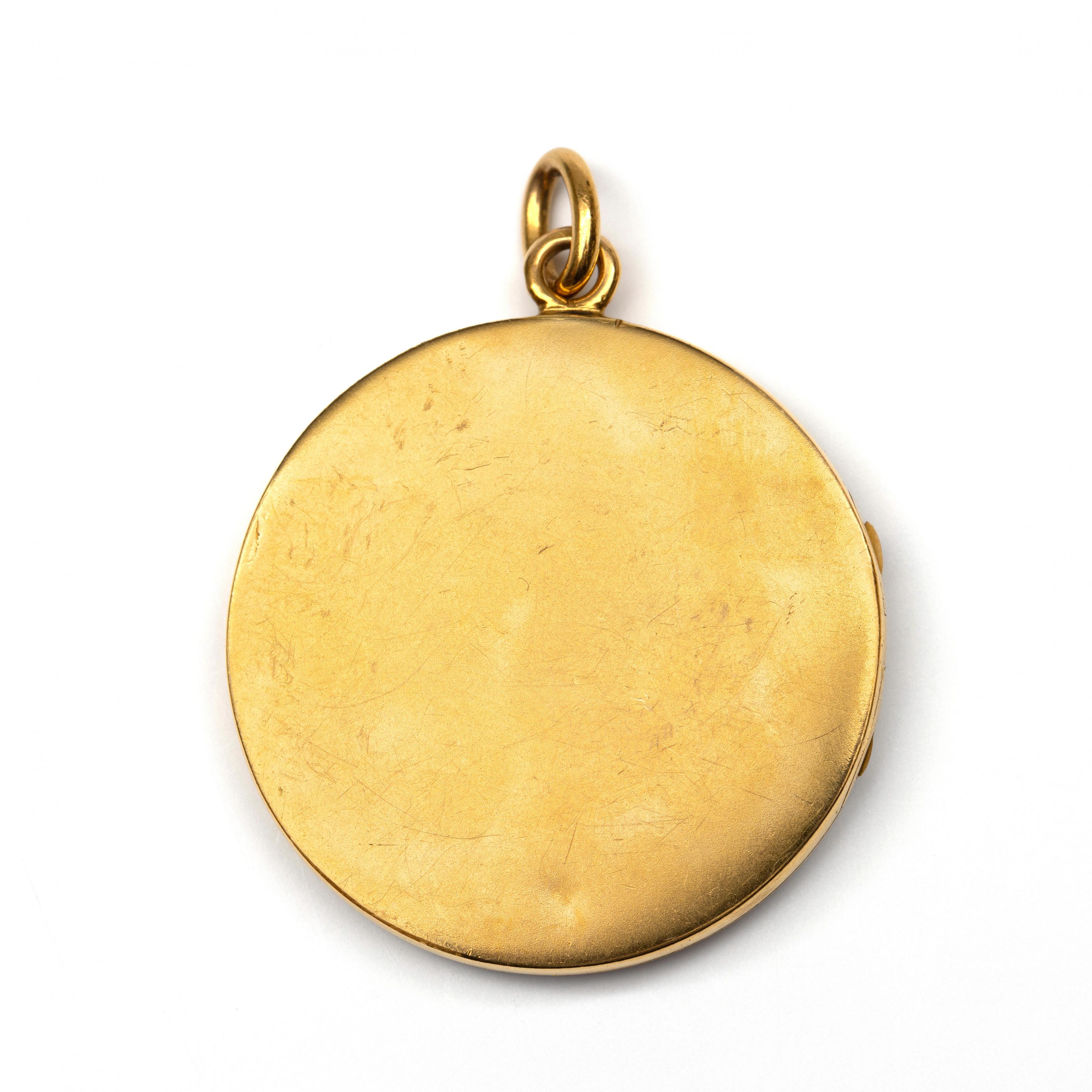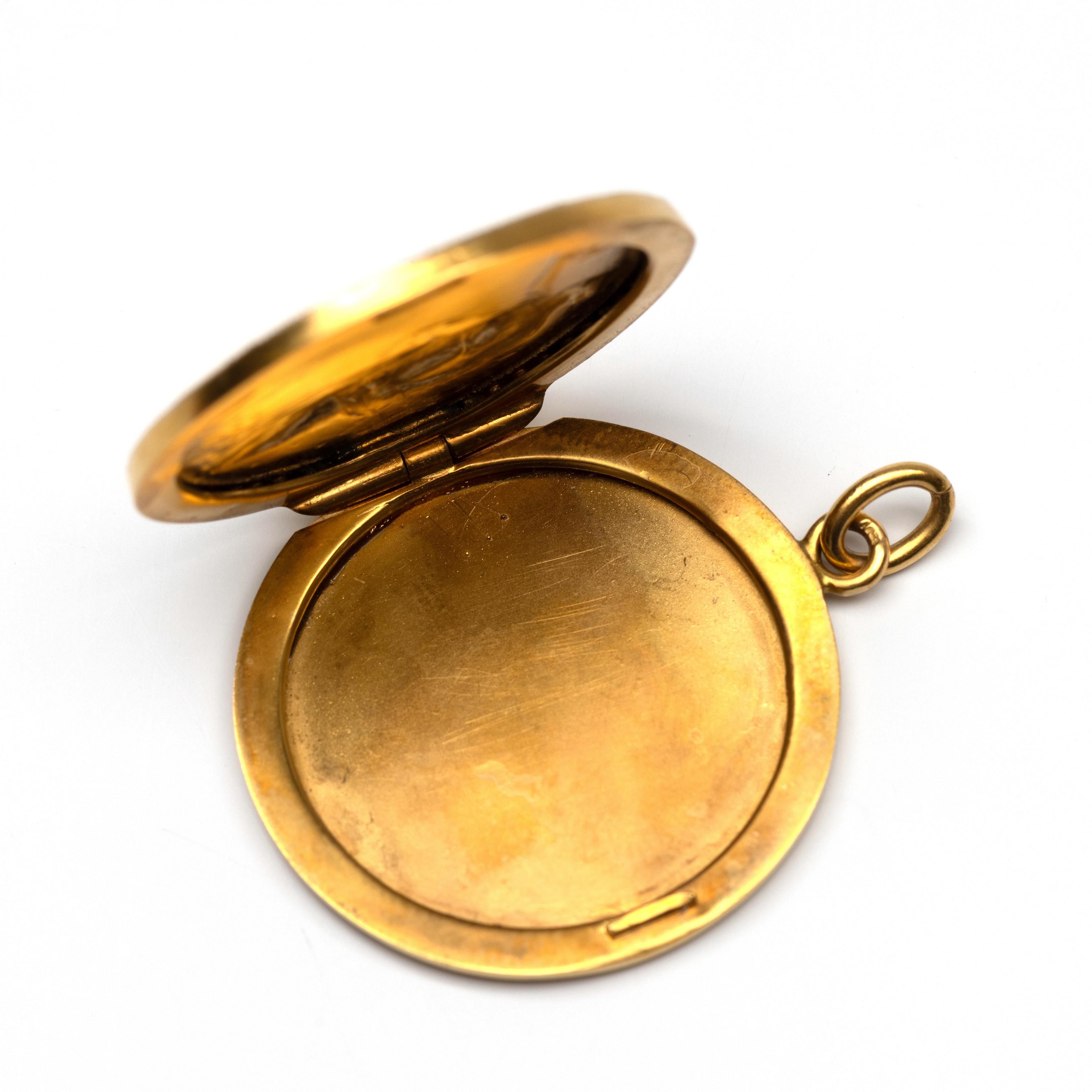 18 k. Gold medallion, Art Nouveau. Depicting the muse Clio. The border set with small rose-cut diamonds.