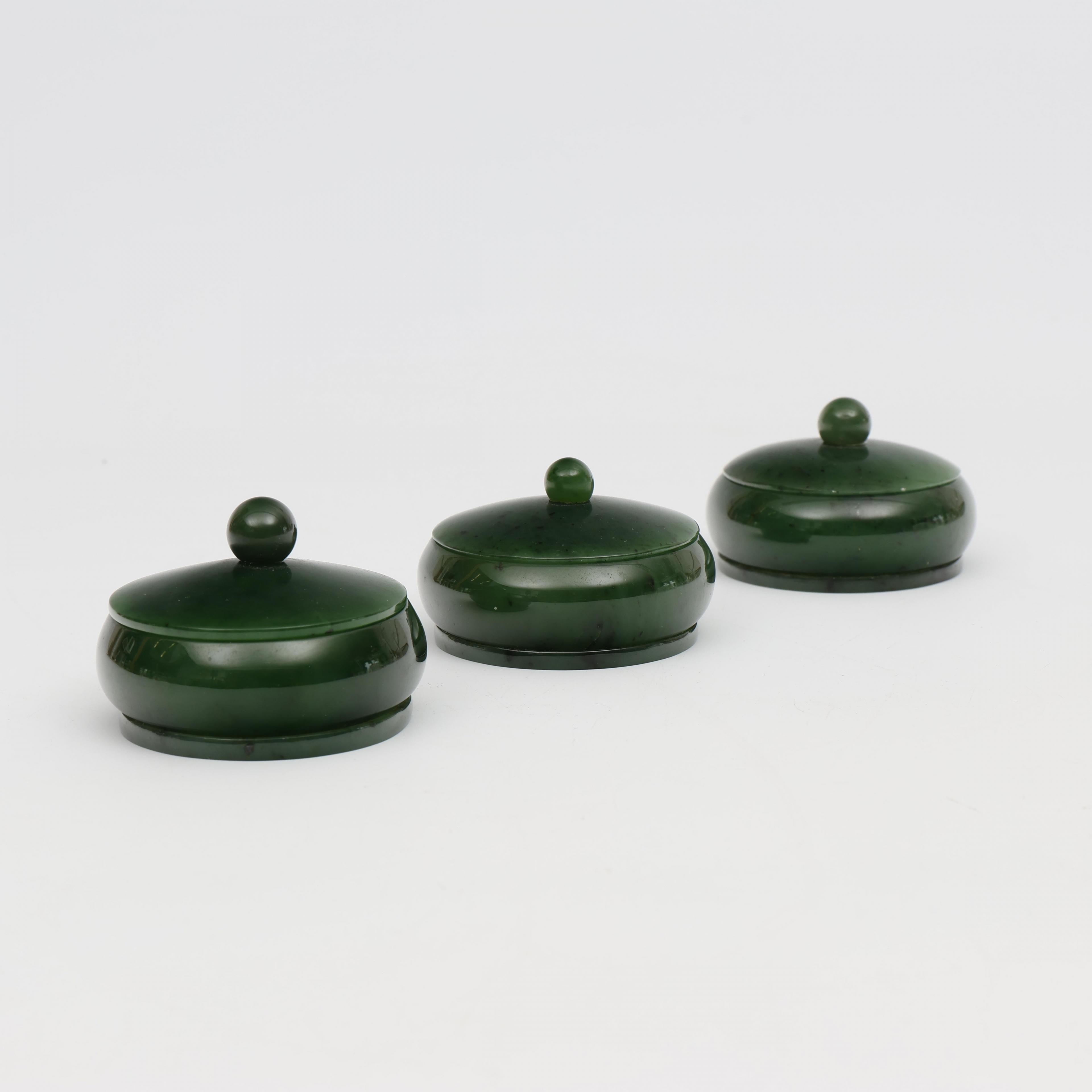Drie ronde jadeïet dekseldoosjes, 20e eeuw;