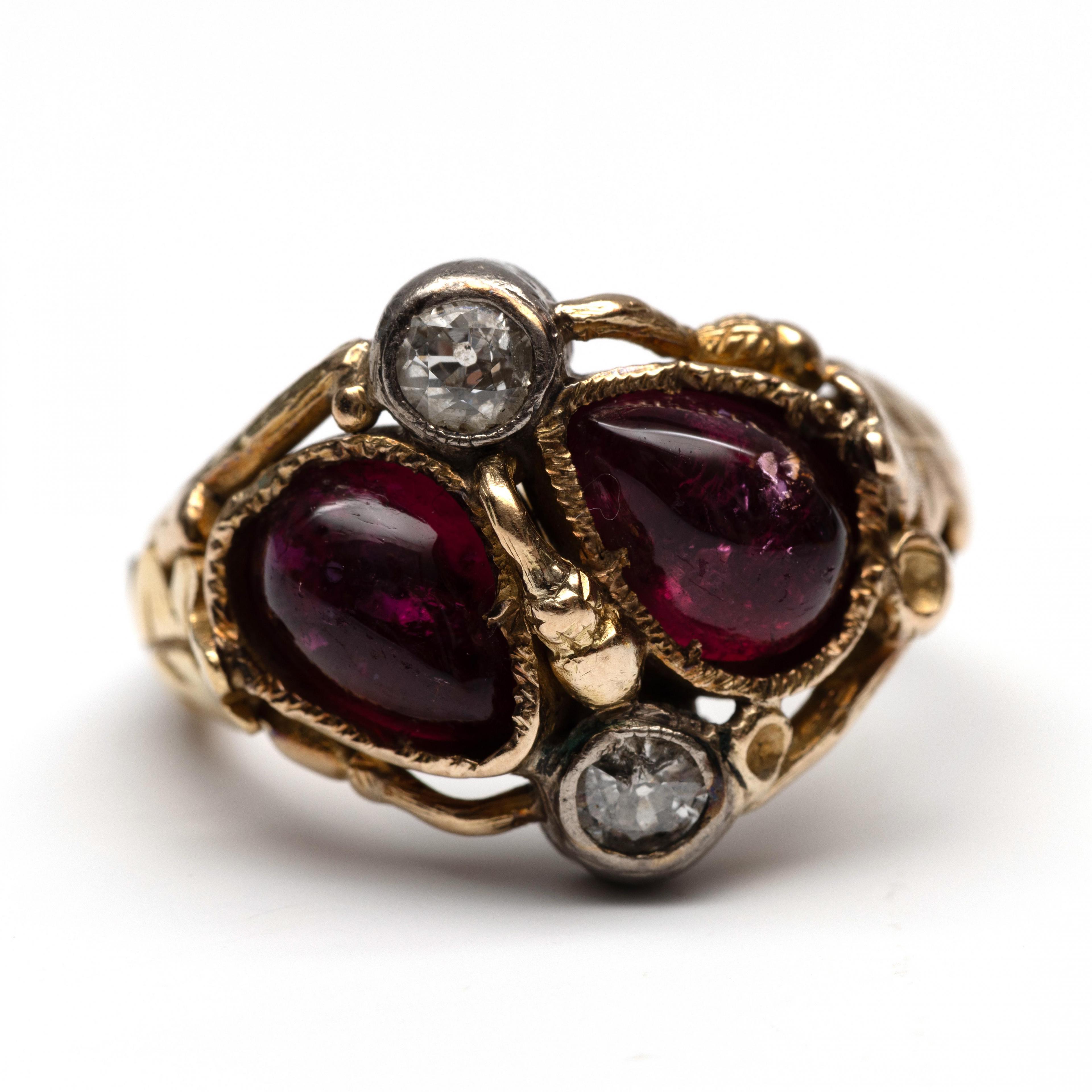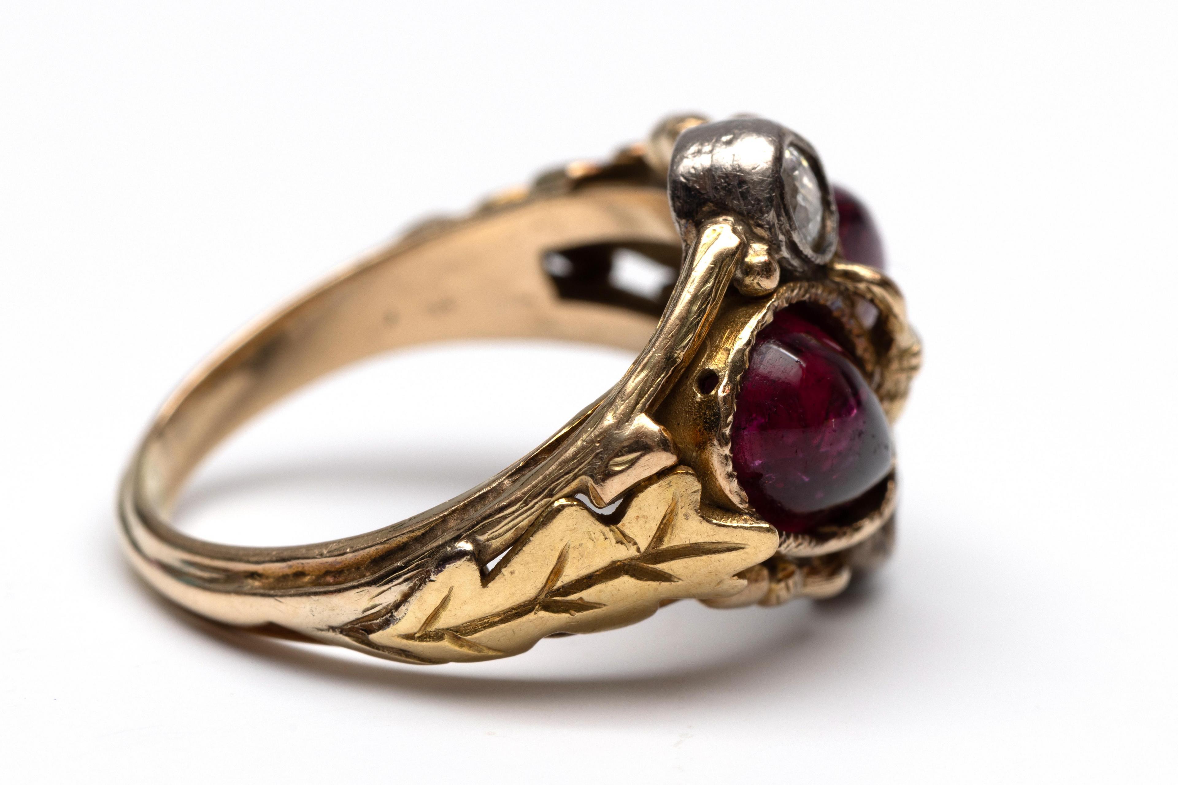 14 k. Gold ring, hunting trophy. Decorated with oak leaves and an acorn, set with cabochon-cut rubellite (originally grandels; deer canines) and old brilliant-cut diamond.