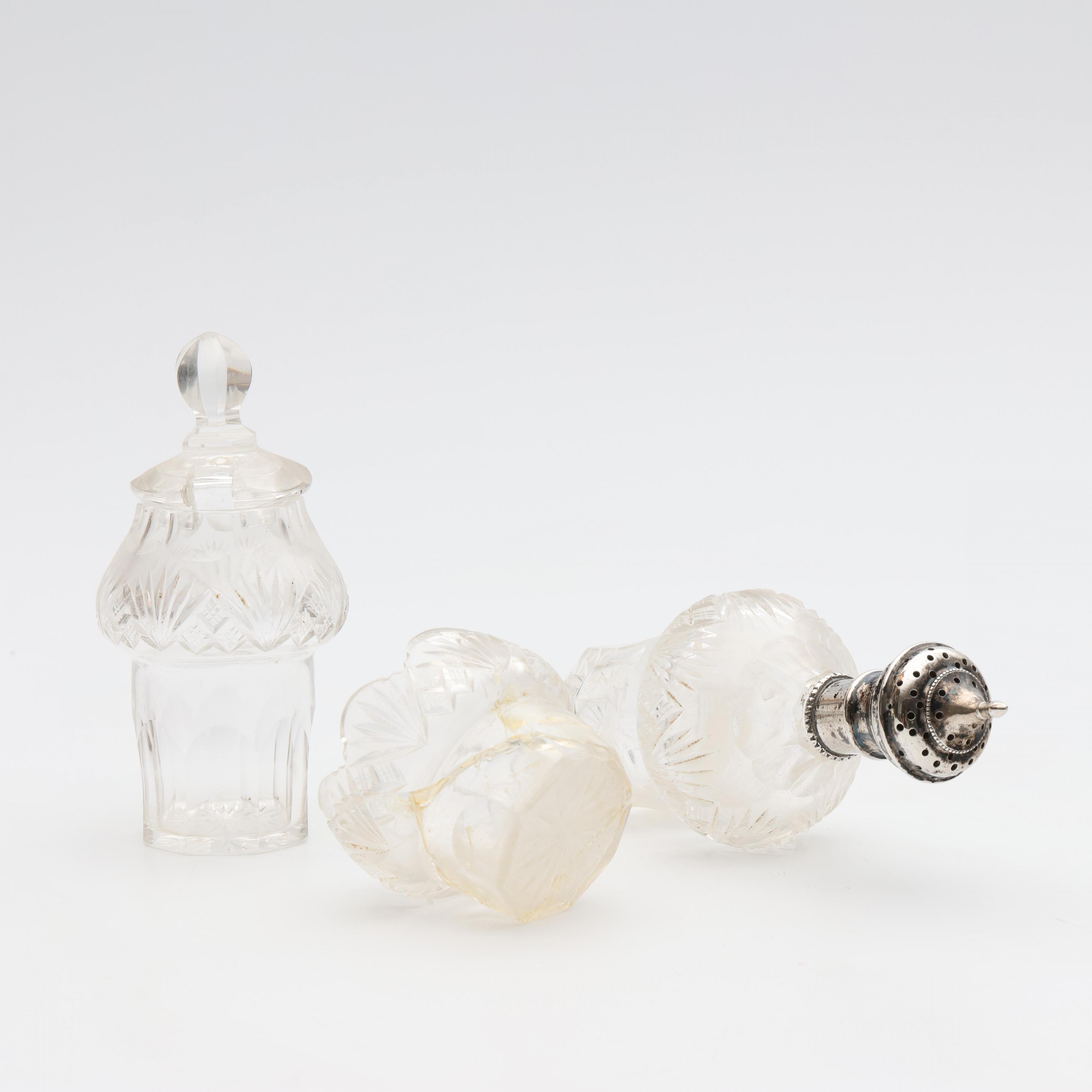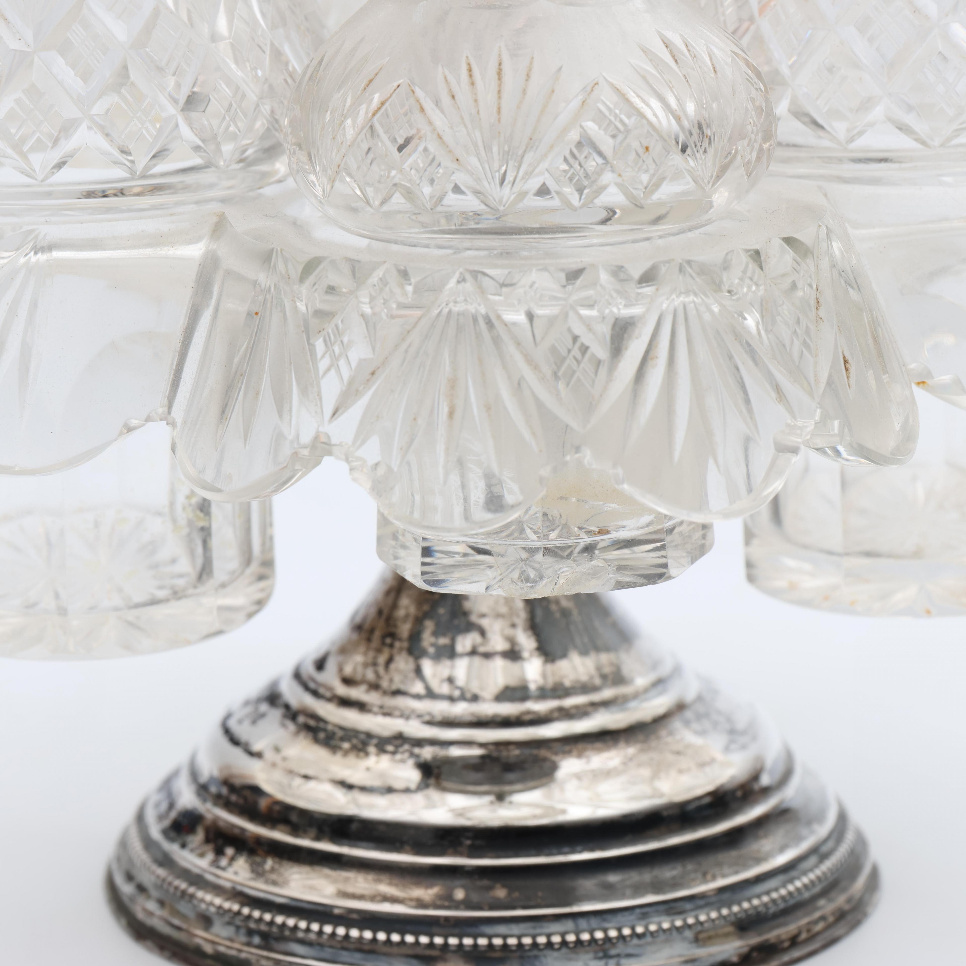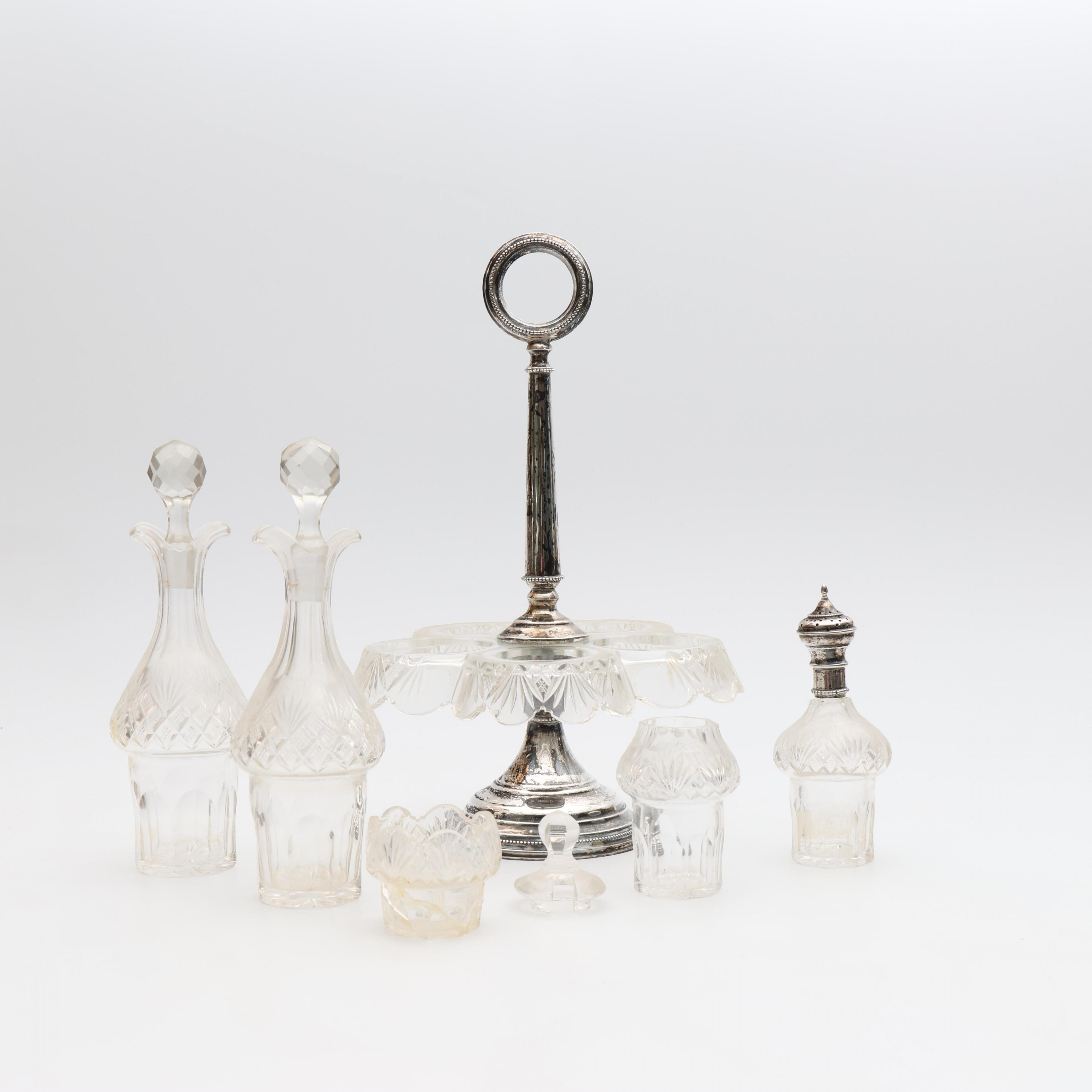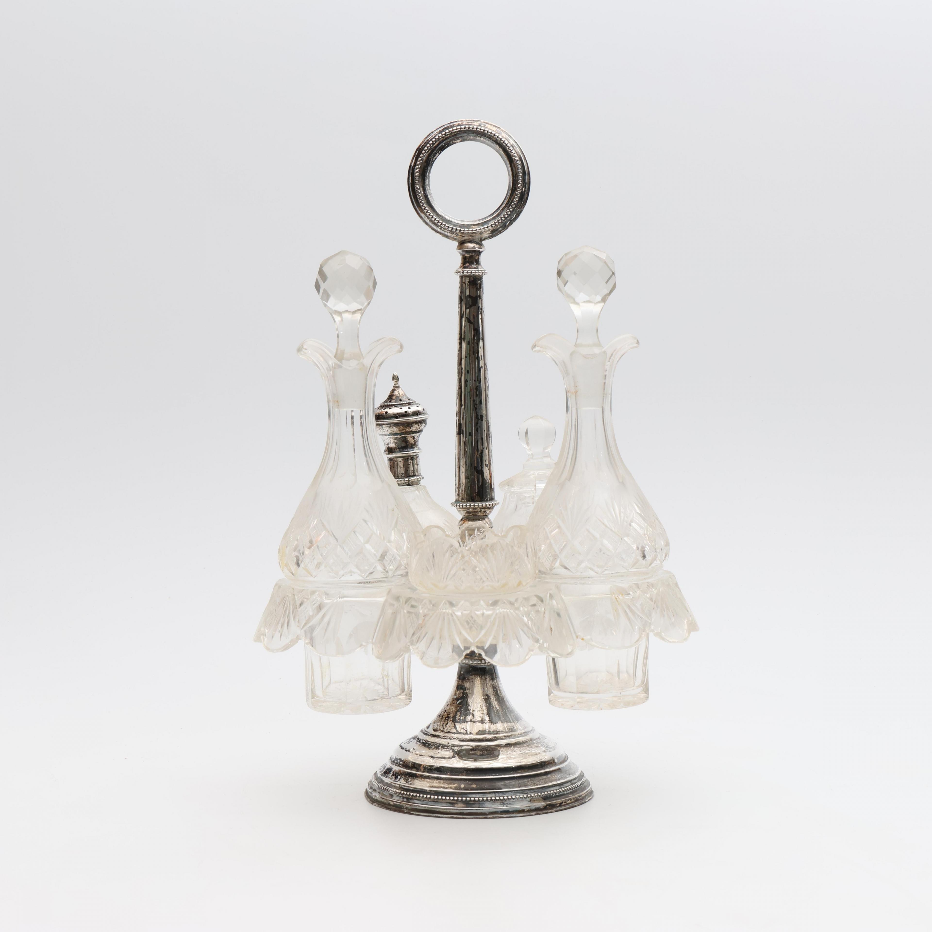 Kristallen olie en azijn stel met zilveren handgreep en voet, 19e eeuw;
