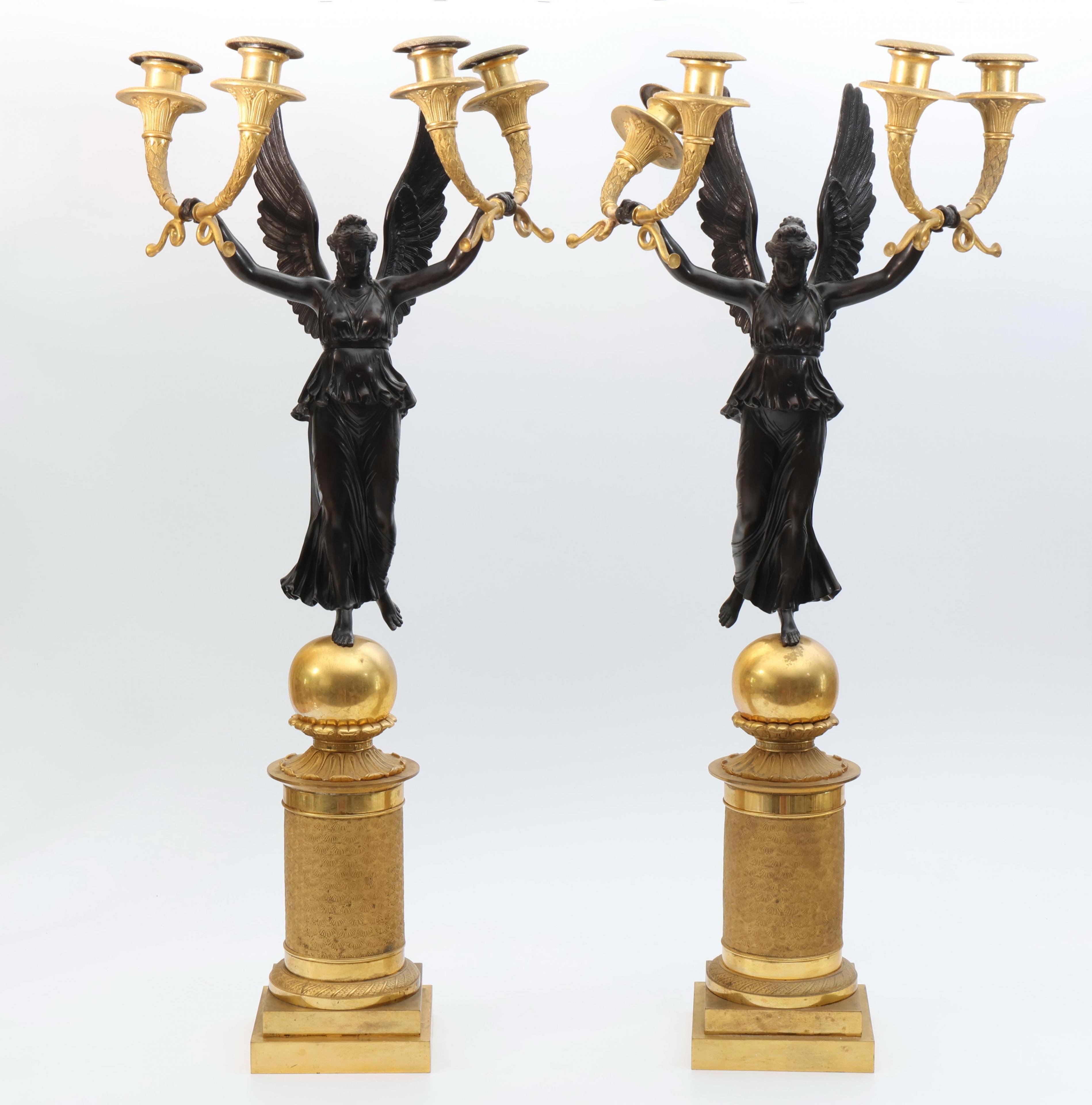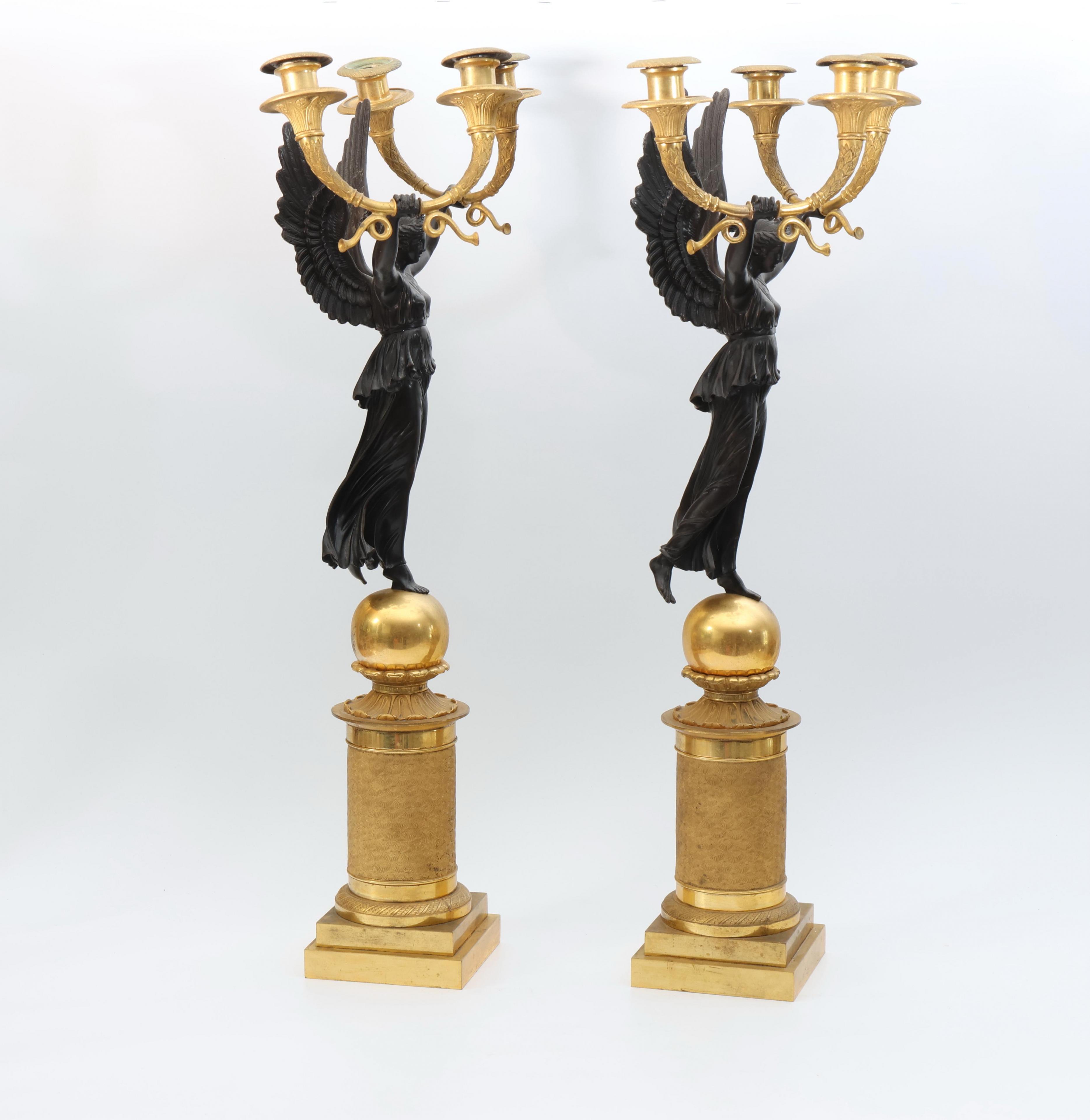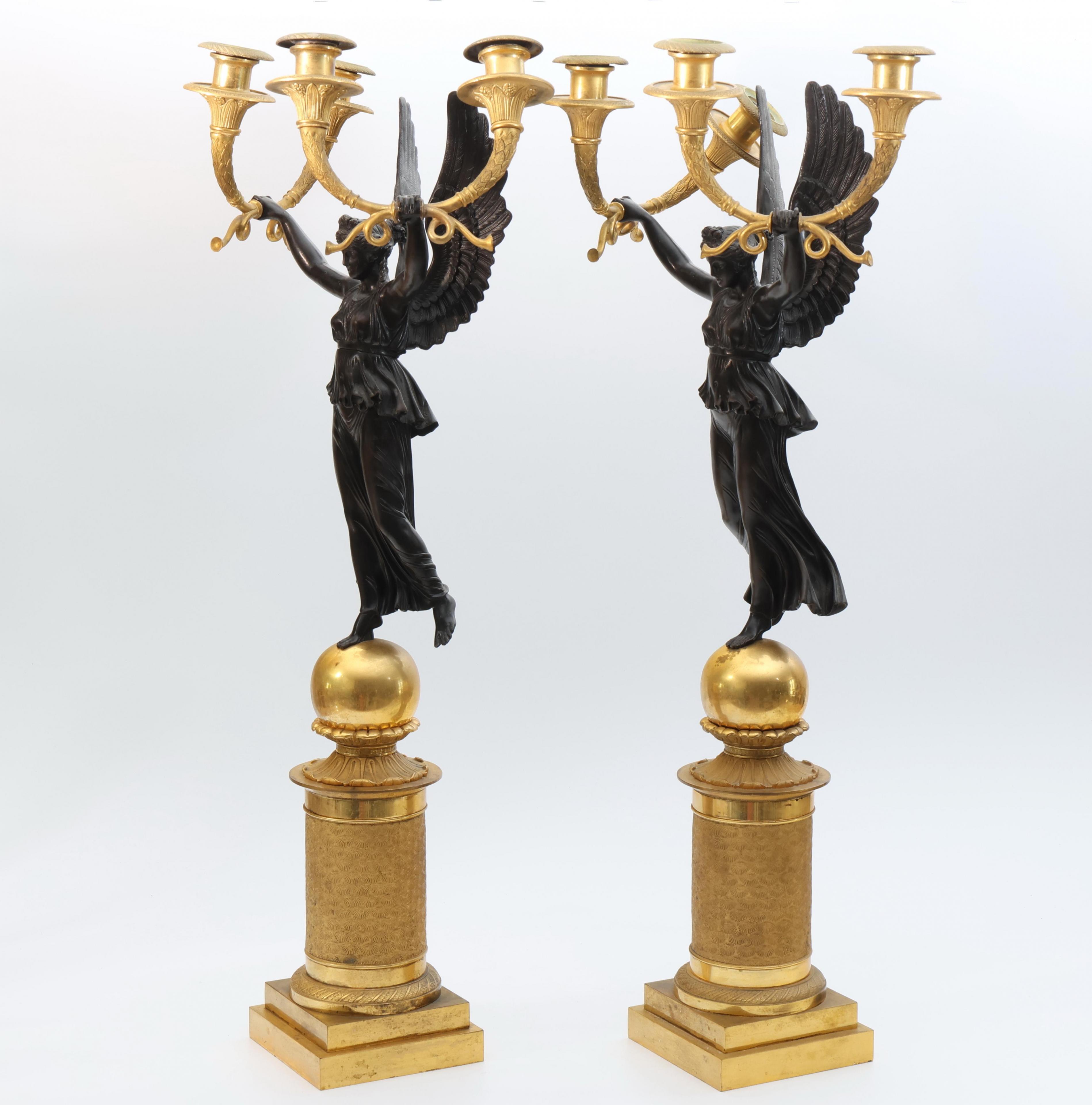 Frankrijk, paar vuurverguld en zwart gepatineerde bronzen vier lichts kandelaren, Empire, 19e eeuw;