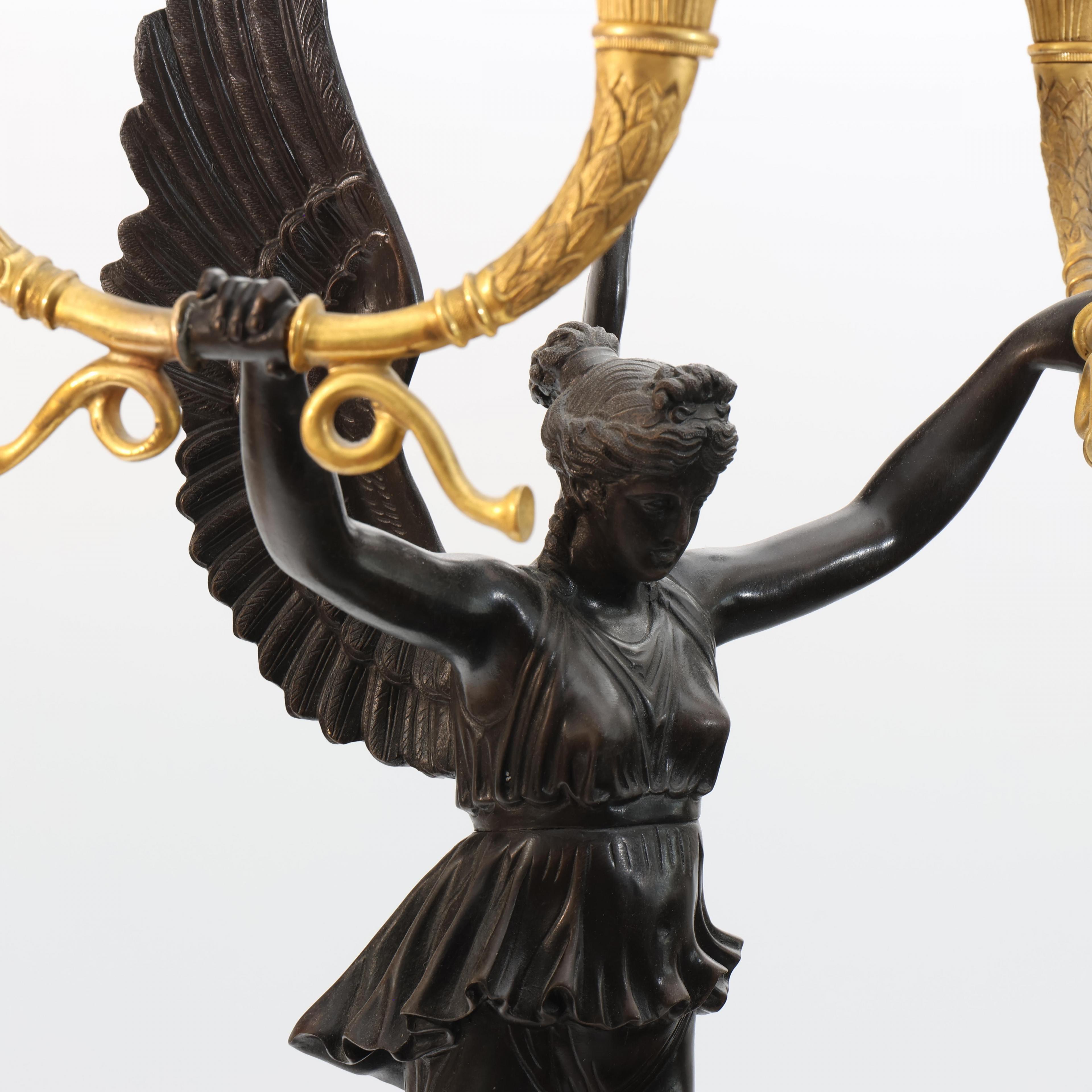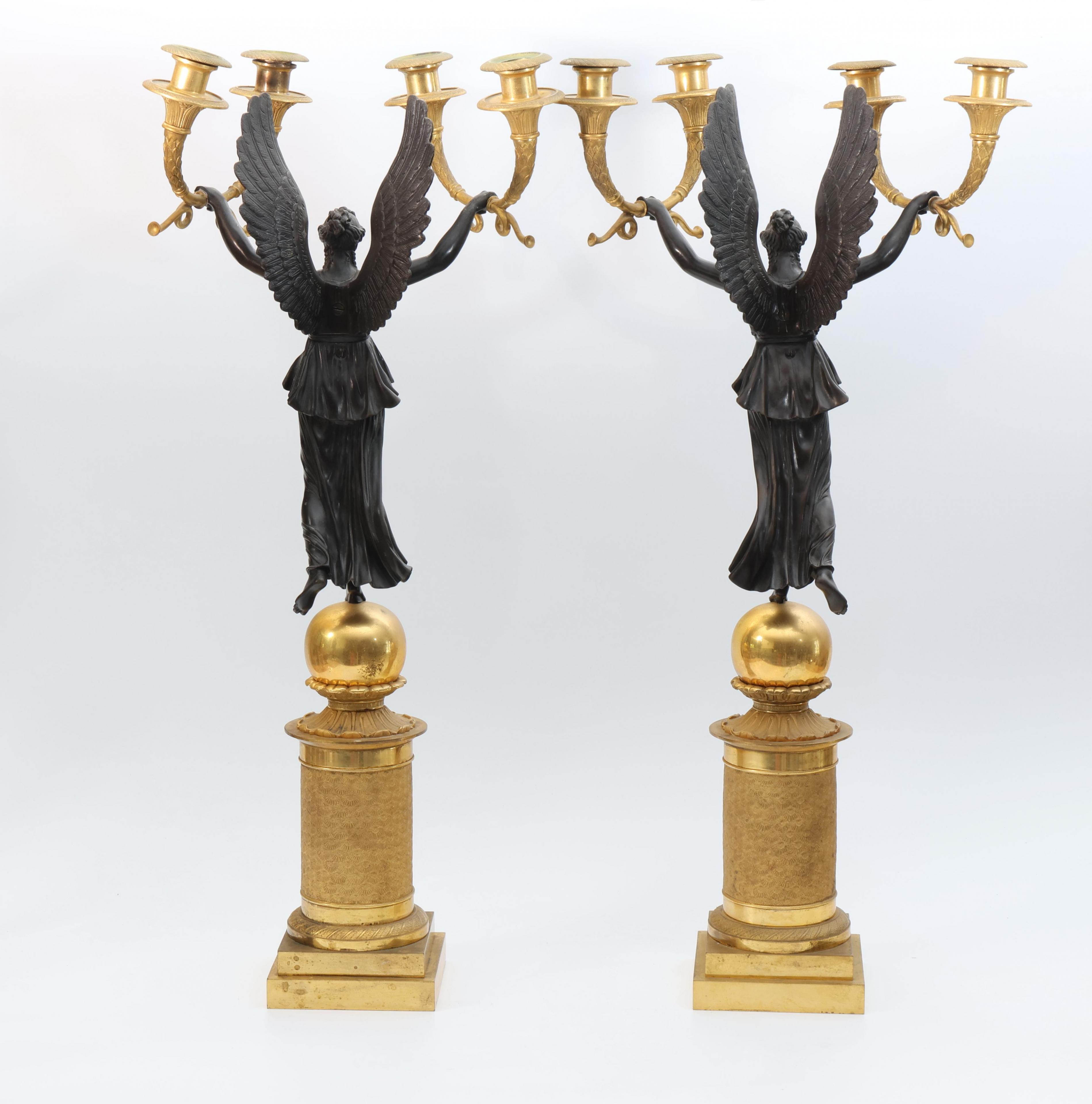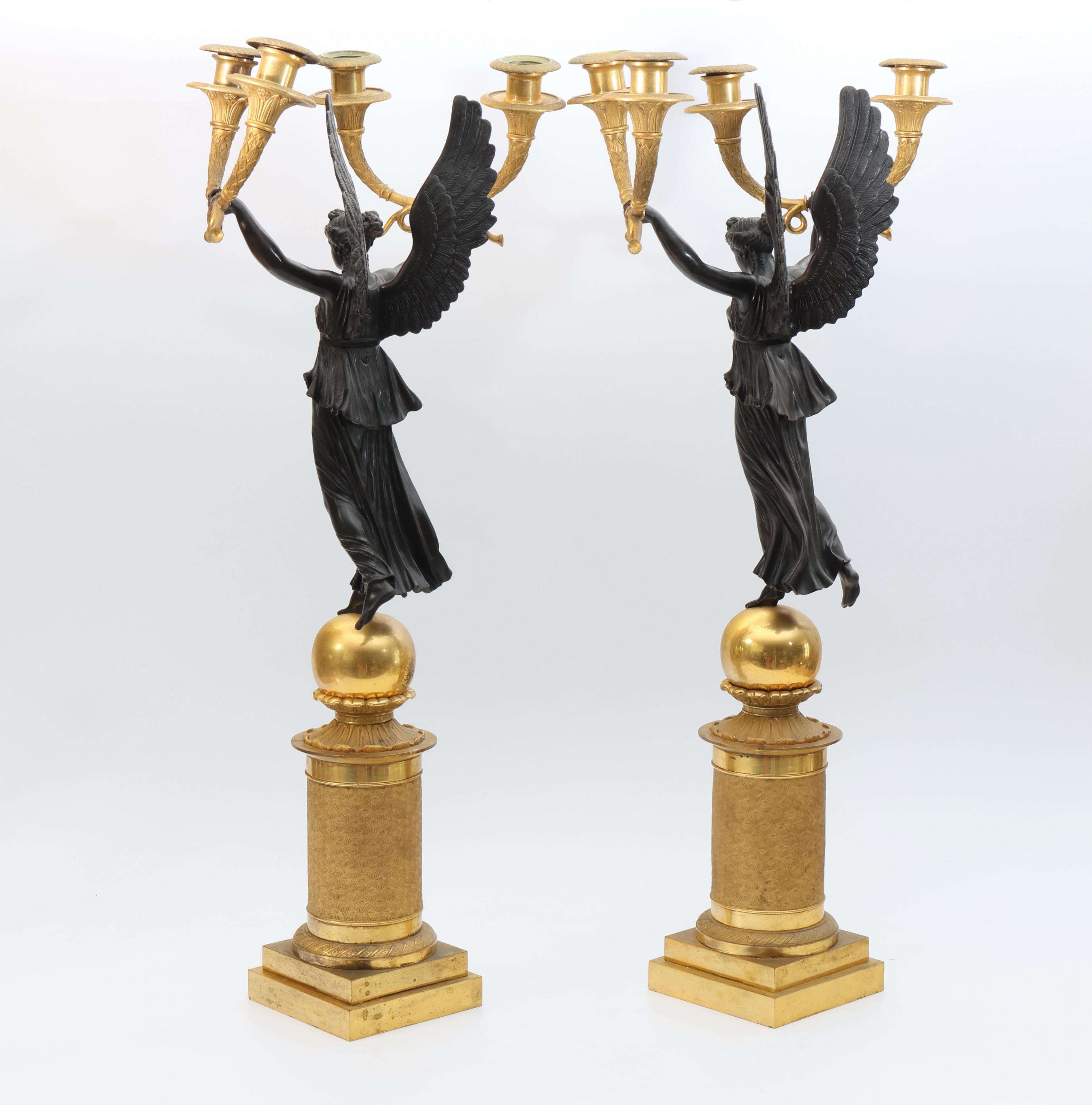 Frankrijk, paar vuurverguld en zwart gepatineerde bronzen vier lichts kandelaren, Empire, 19e eeuw;