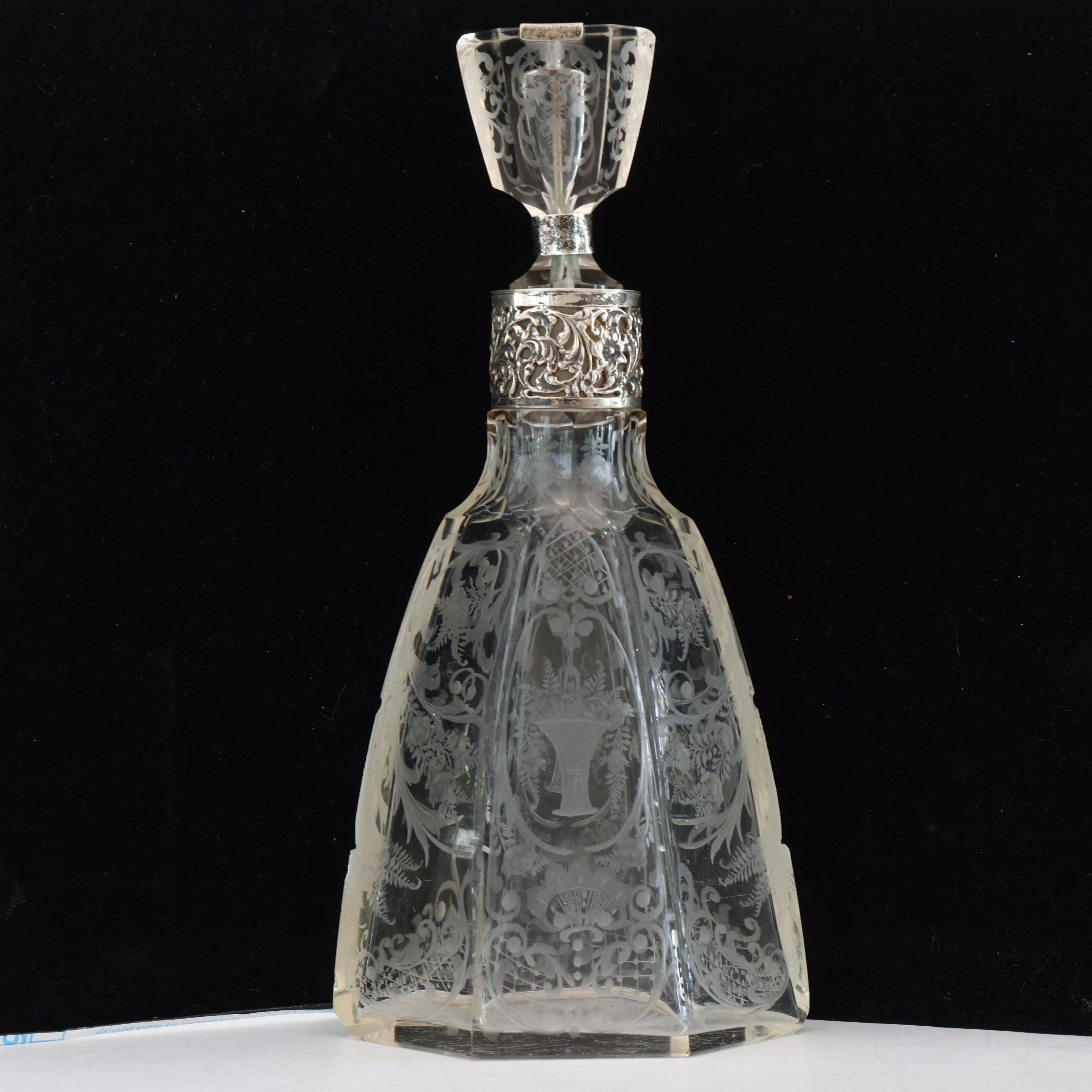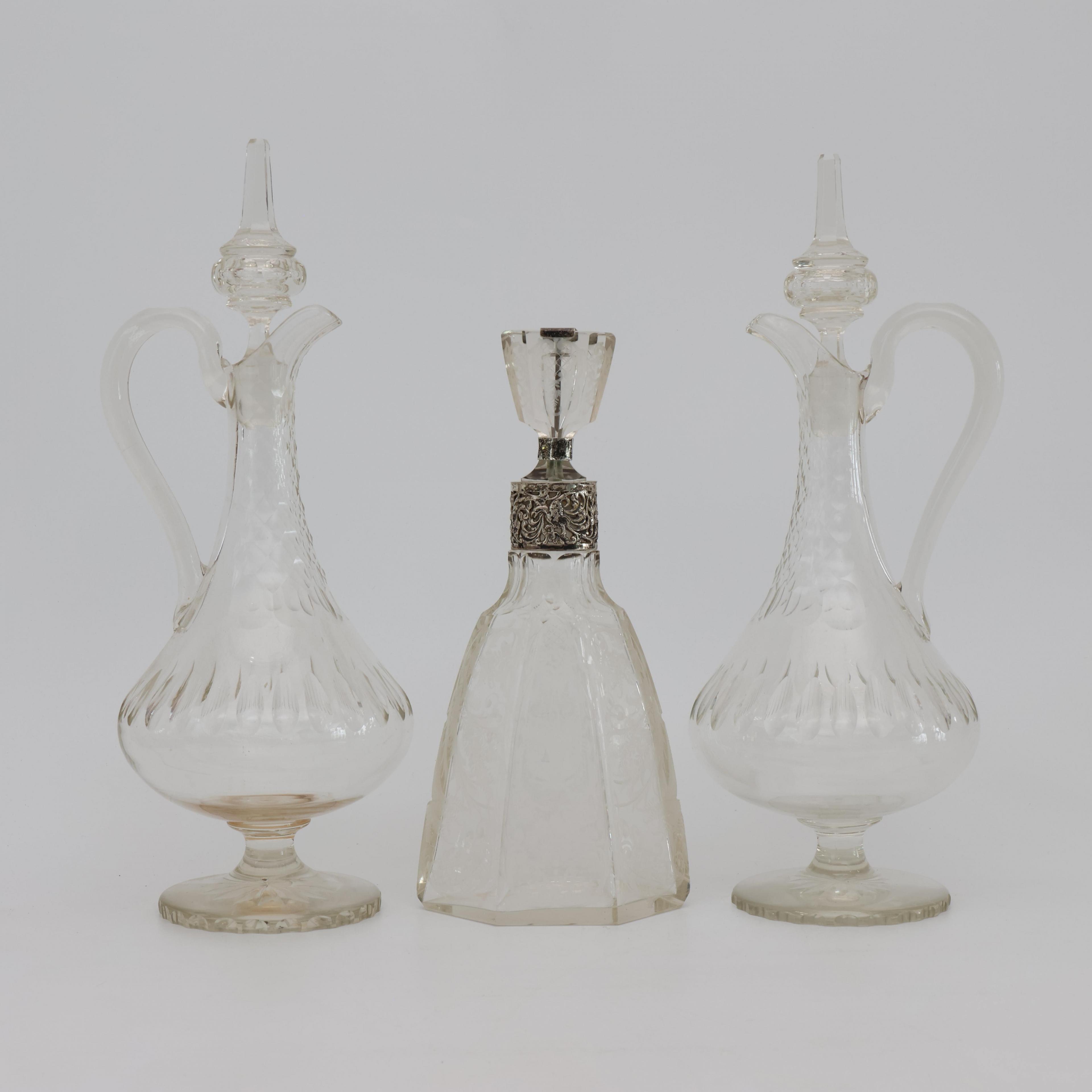 Uitgevoerd met hengsel en schenktuit, staande op voet. Hierbij kantig geslepen karaf met florale decoratie en zilveren montuur.