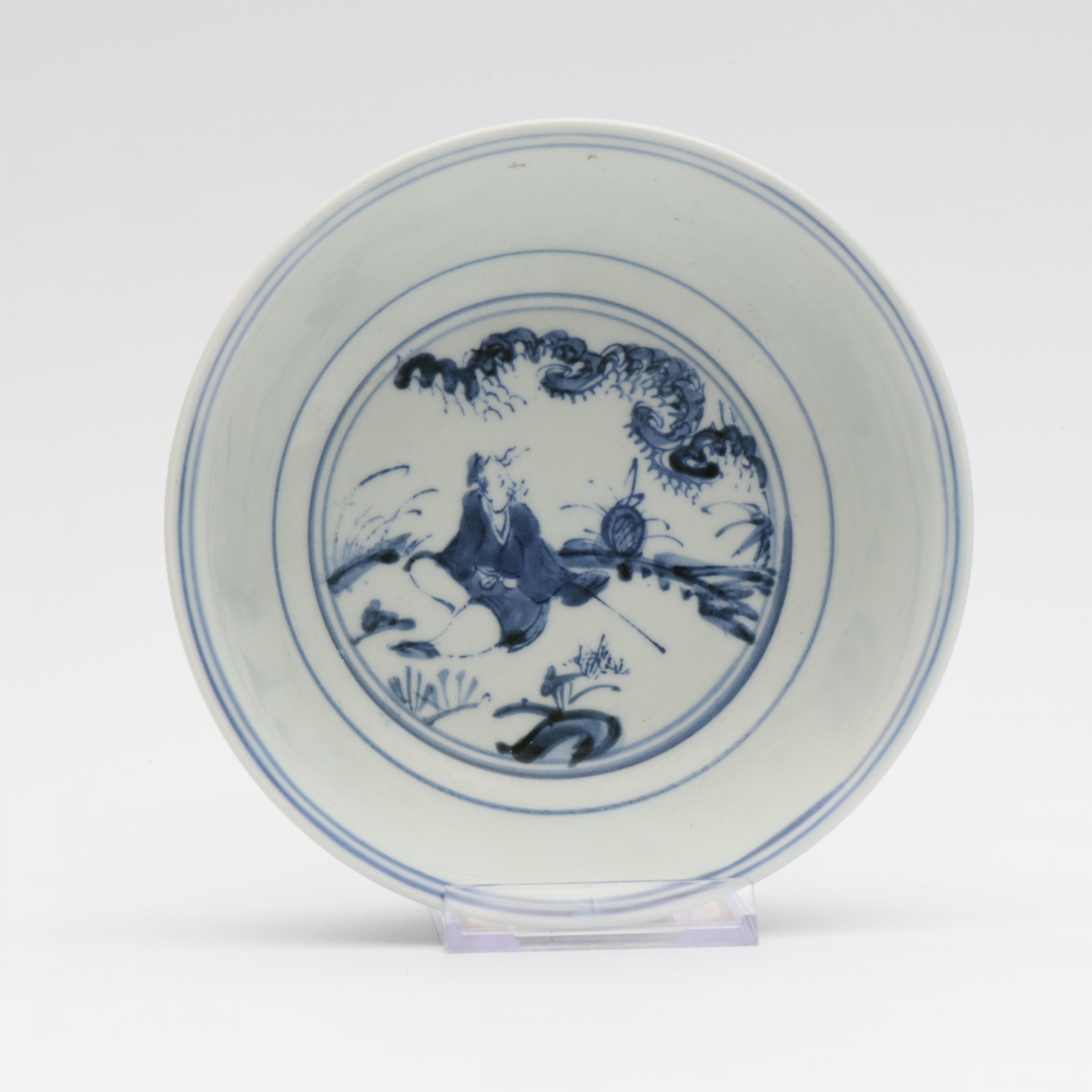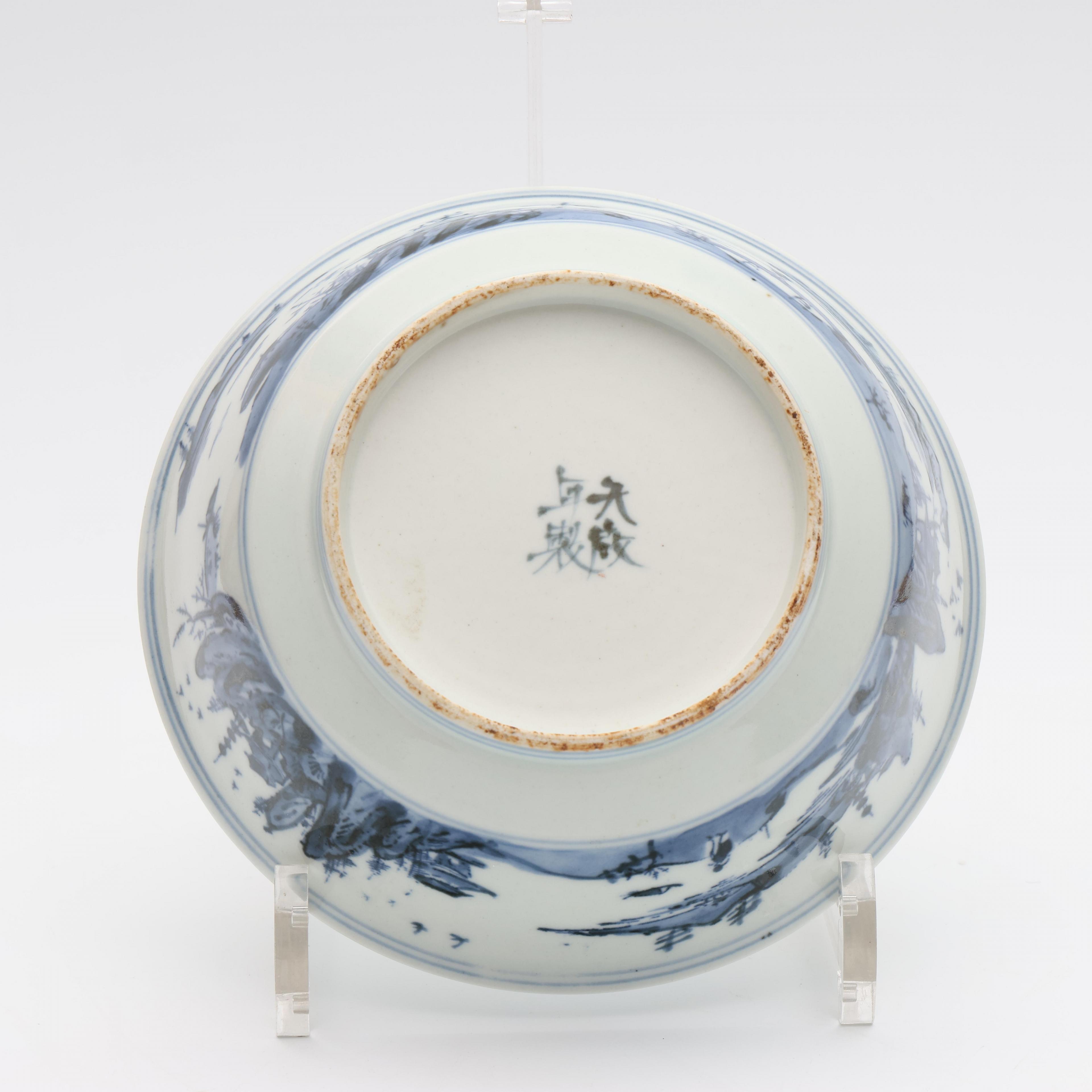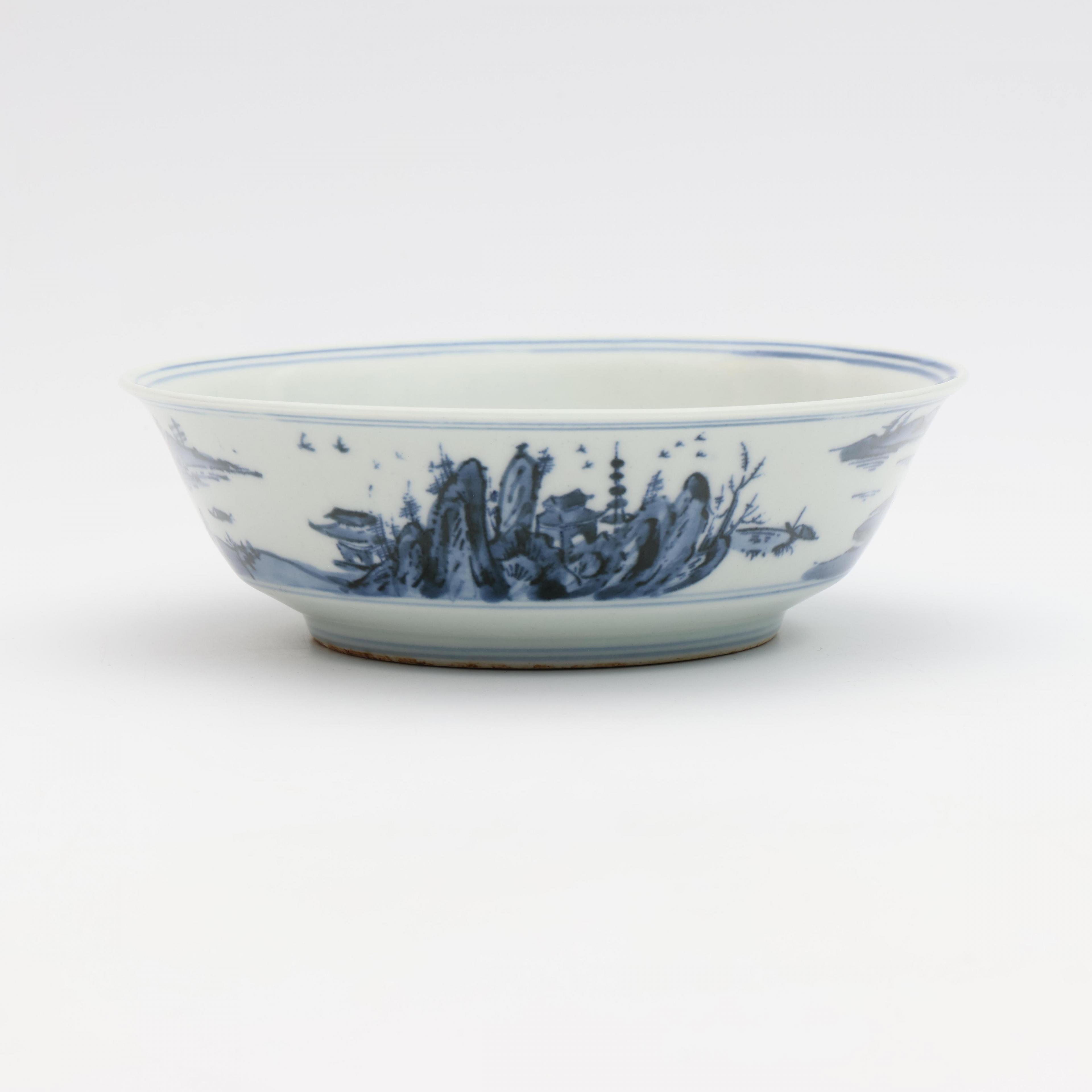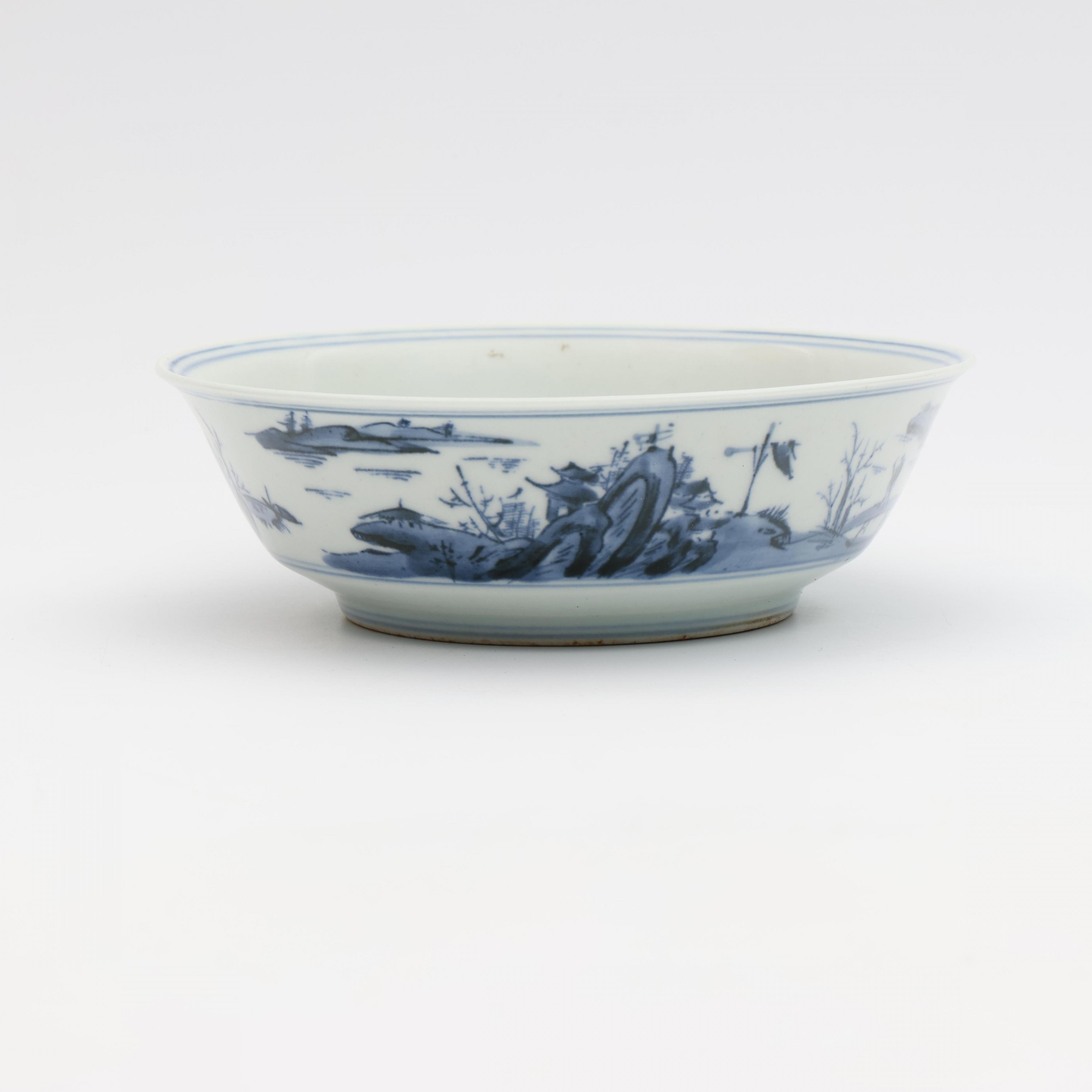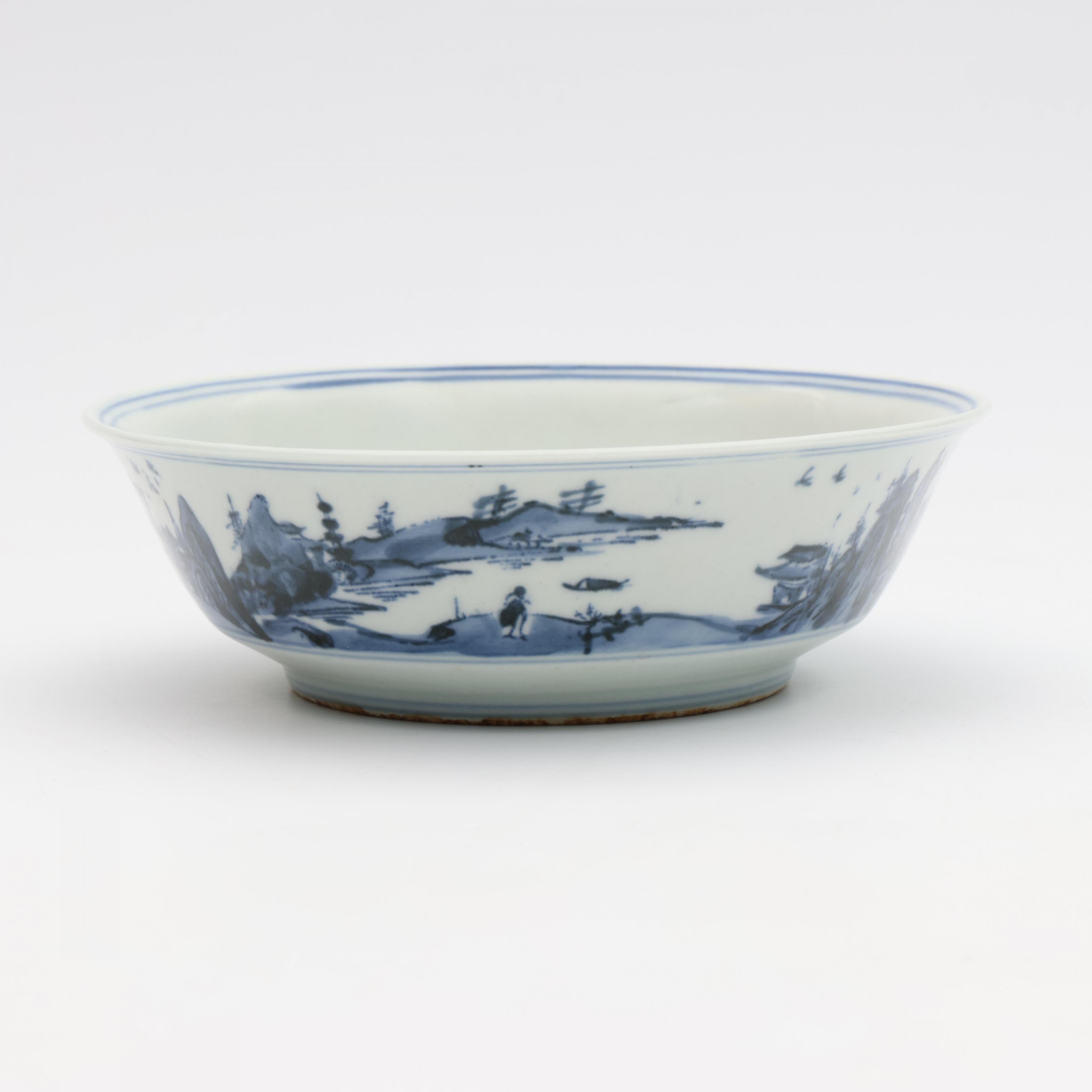 decorated to the exterior with a river landscape, the interior with a seated figure, the base with a four-character mark