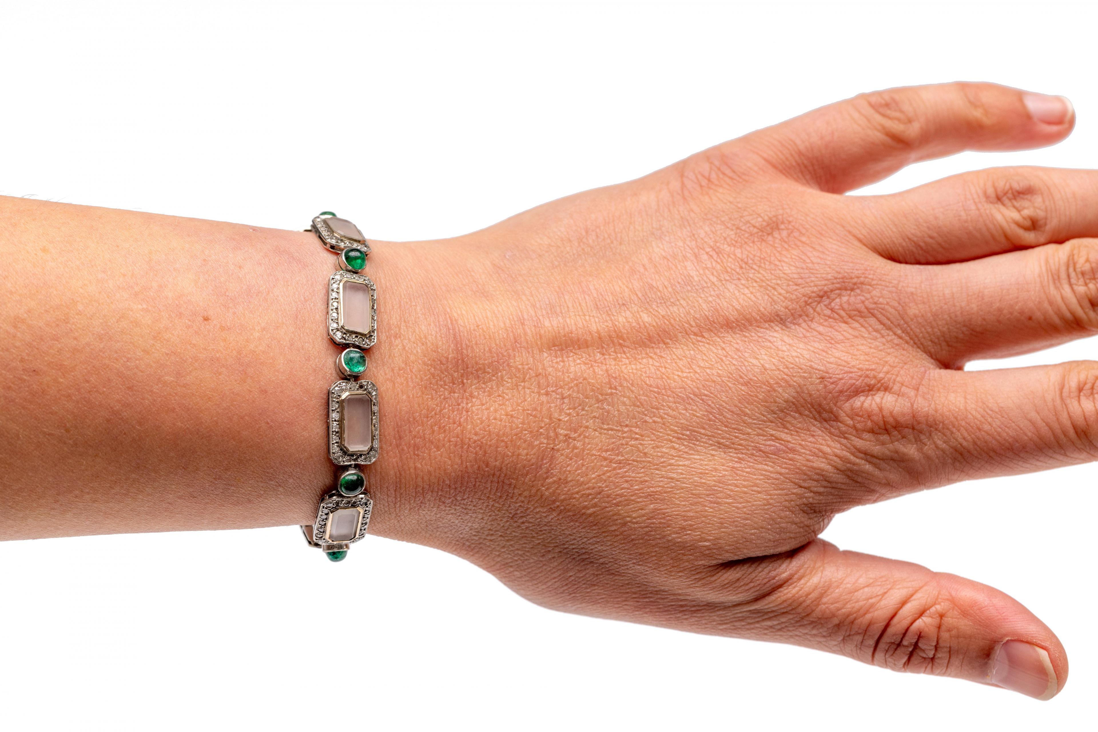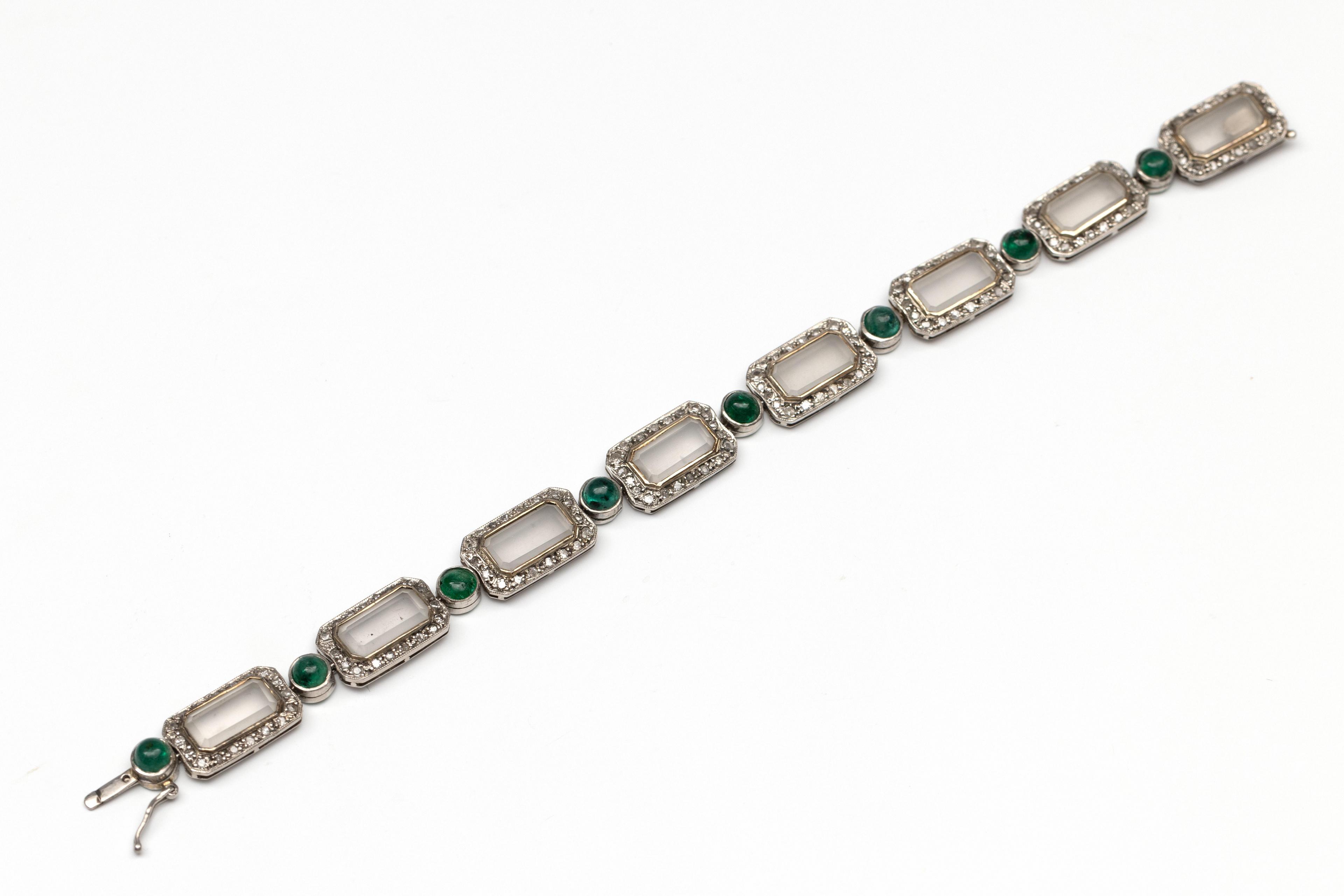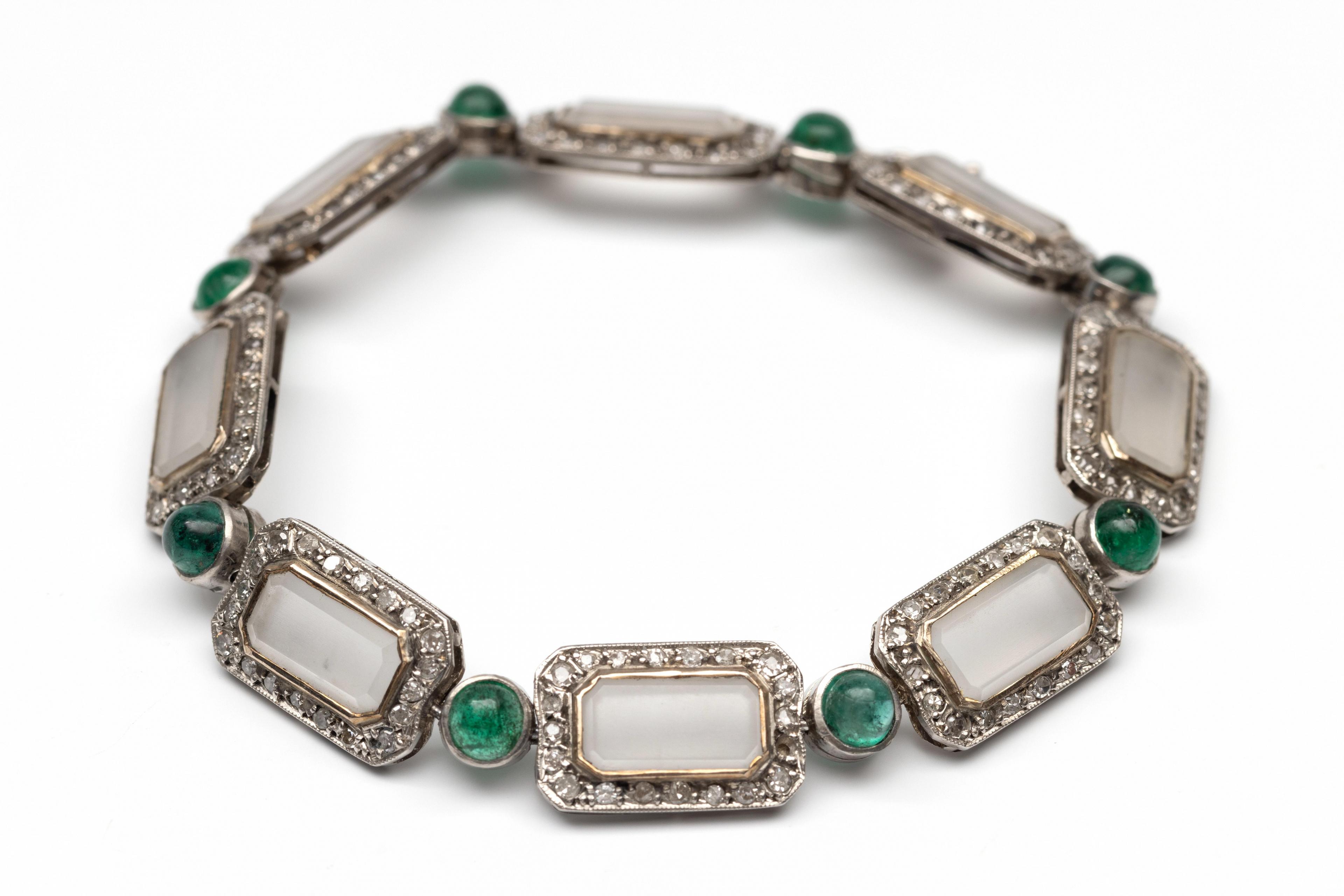 Platinum bracelet, composed of eight octagonal links set with frosted glass in an entourage of single cut diamonds with a total weight of approx. 1.40 ct., connected by round links, each set with a cabochon-cut emerald (diam. approx. 4.5 mm)