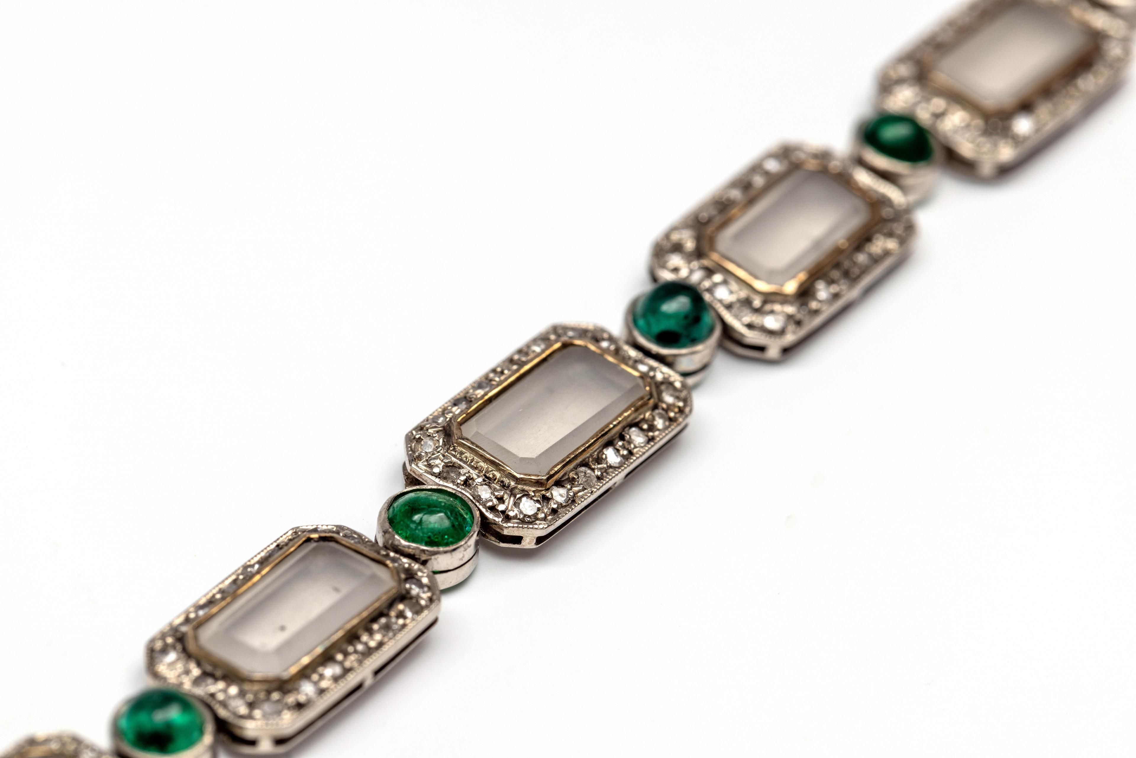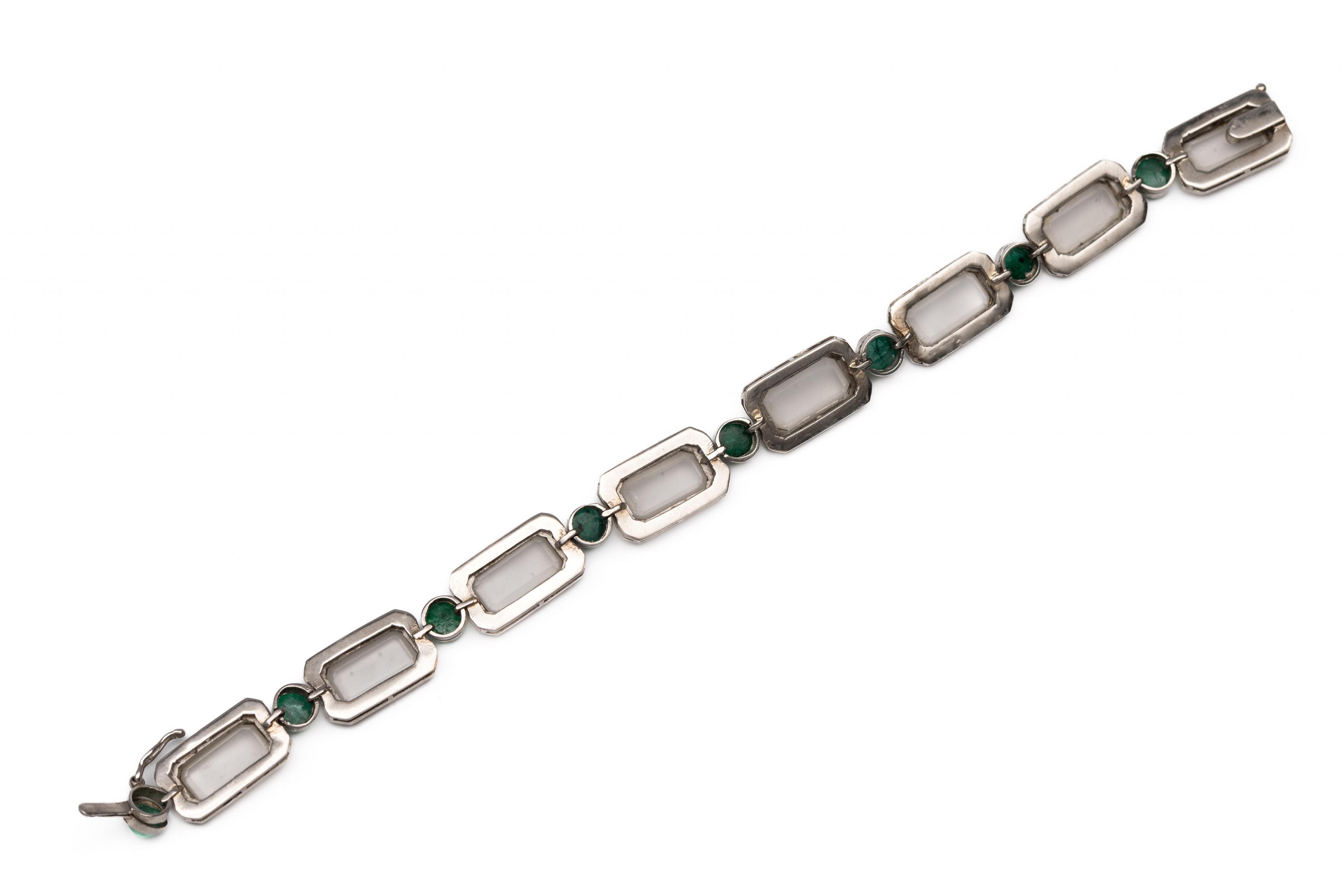 opgebouwd uit acht octogonale schakels bezet met gematteerd glas in een entourage van achtkant geslepen diamant met een totaalgewicht van ca. 1.40 ct., met elkaar verbonden door ronde schakels, elk bezet met een cabochon geslepen smaragd (diam. ca. 4,5 mm)