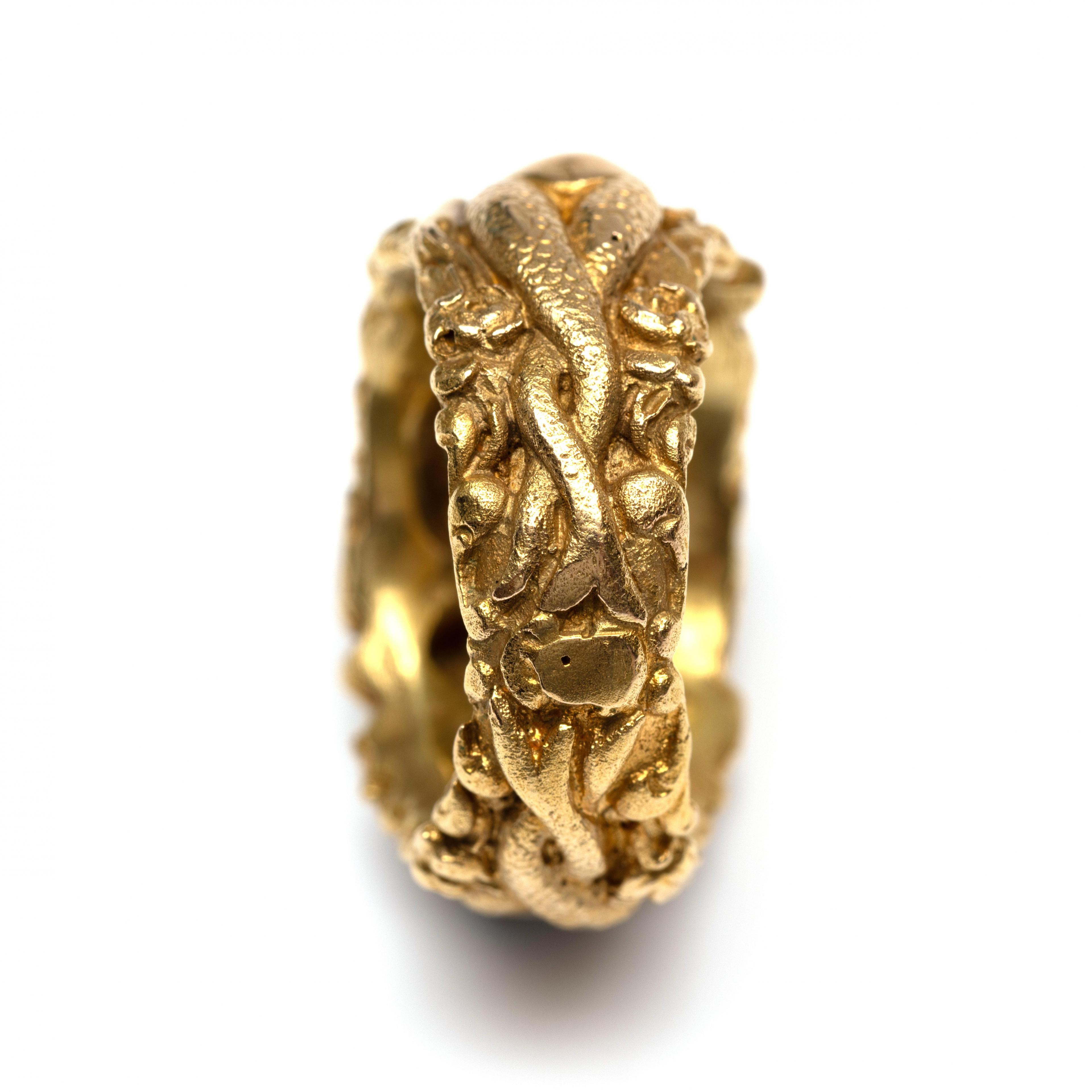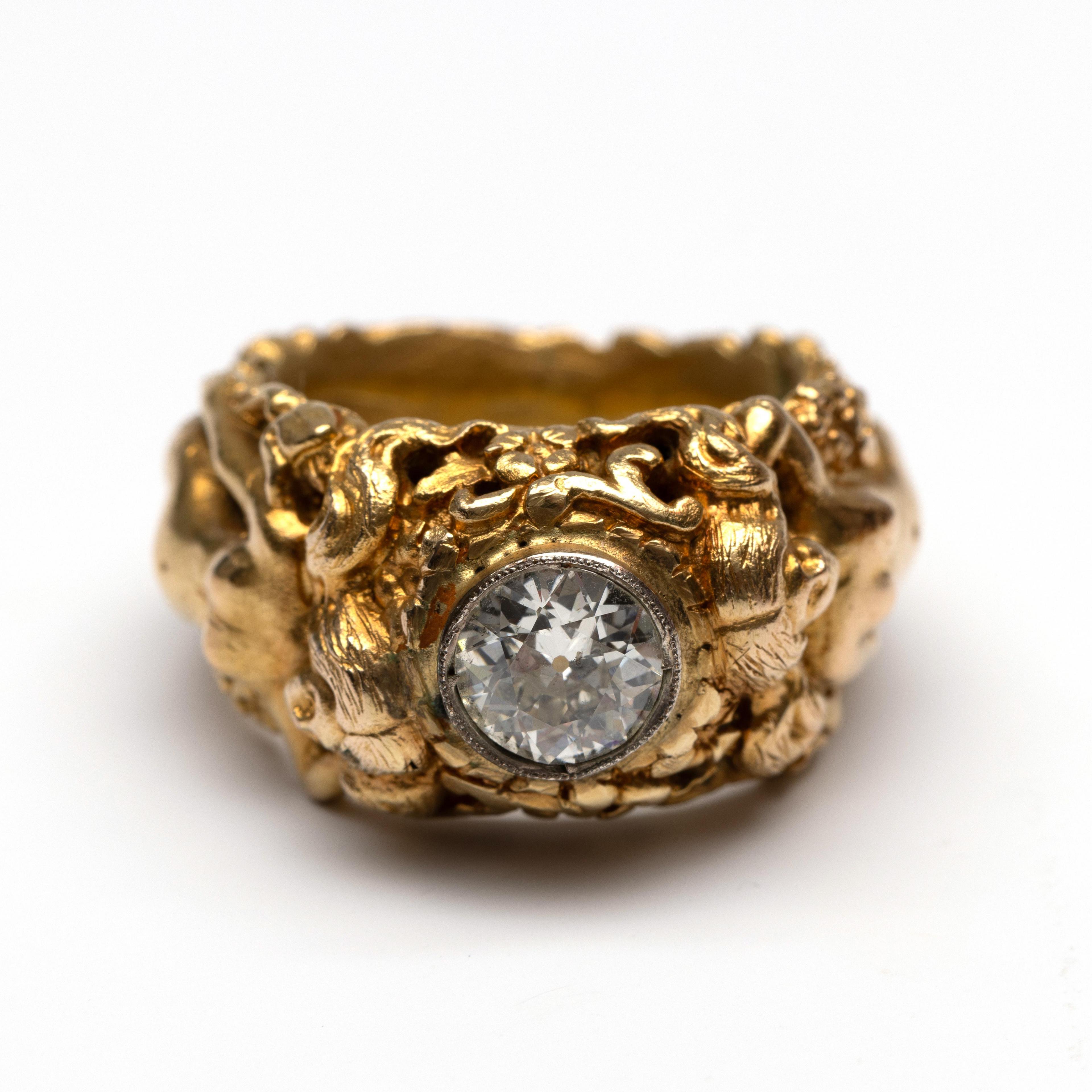 18 k. Gold ring, centrally set with an old brilliant-cut diamond of approximately 1.20 ct. The ring decorated with two mermaids with long wavy hair and flowers.