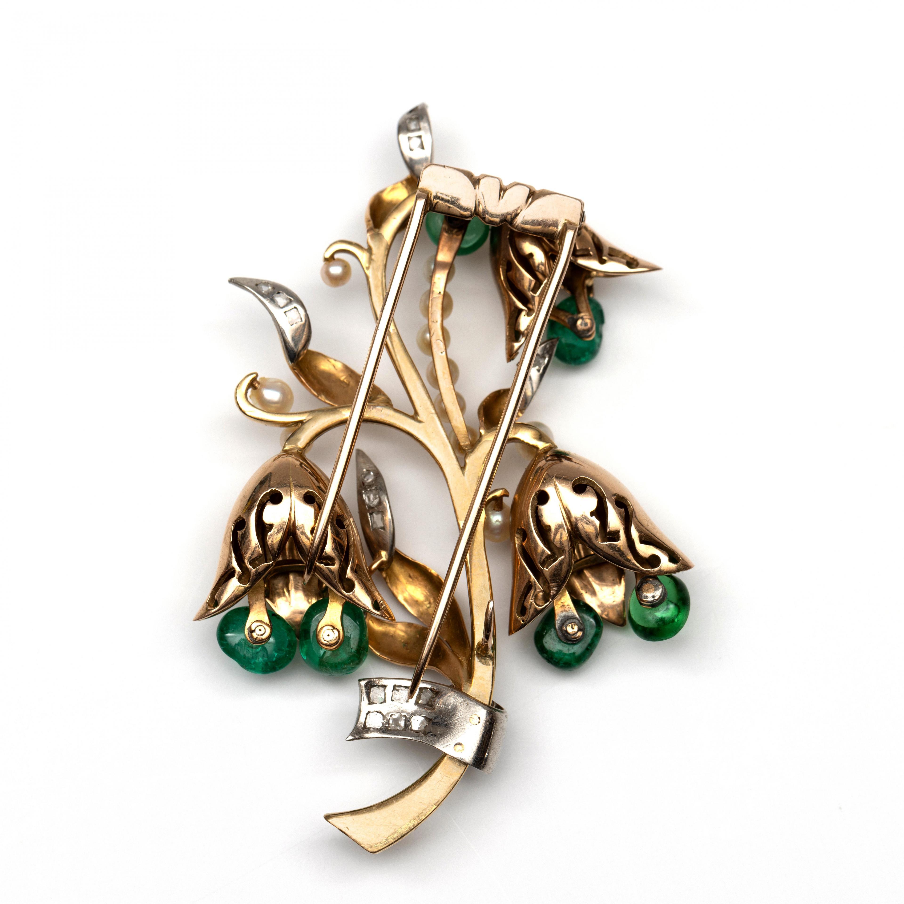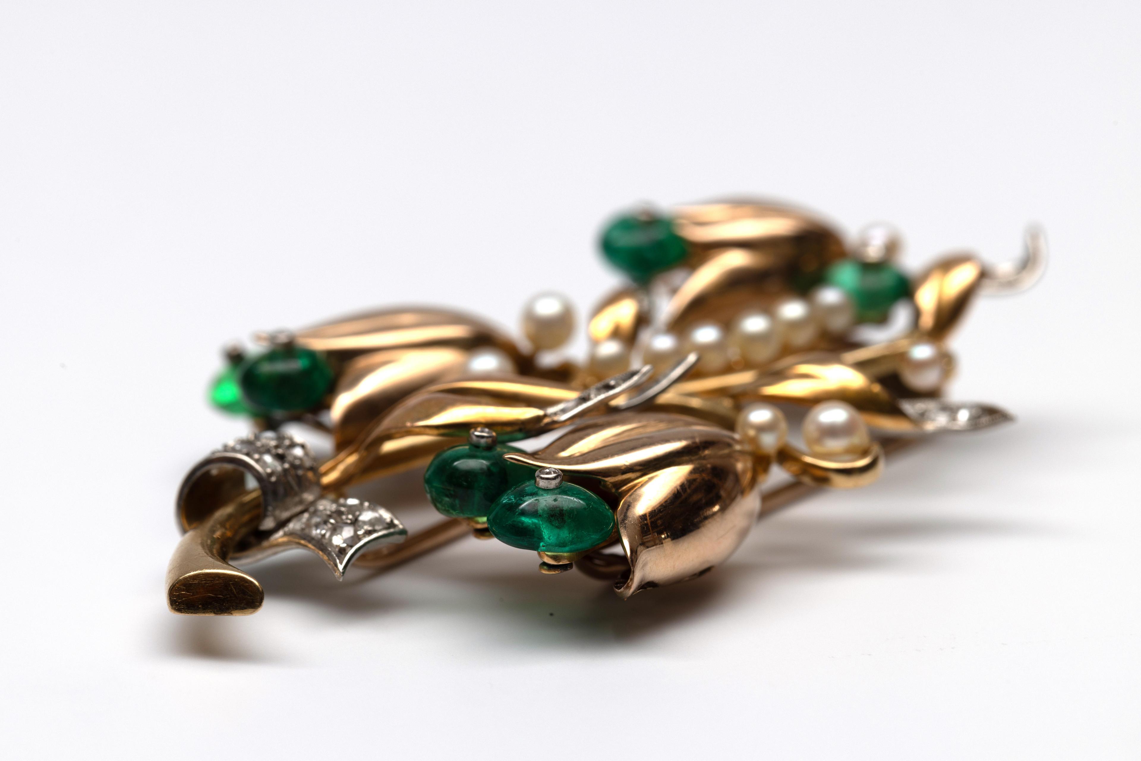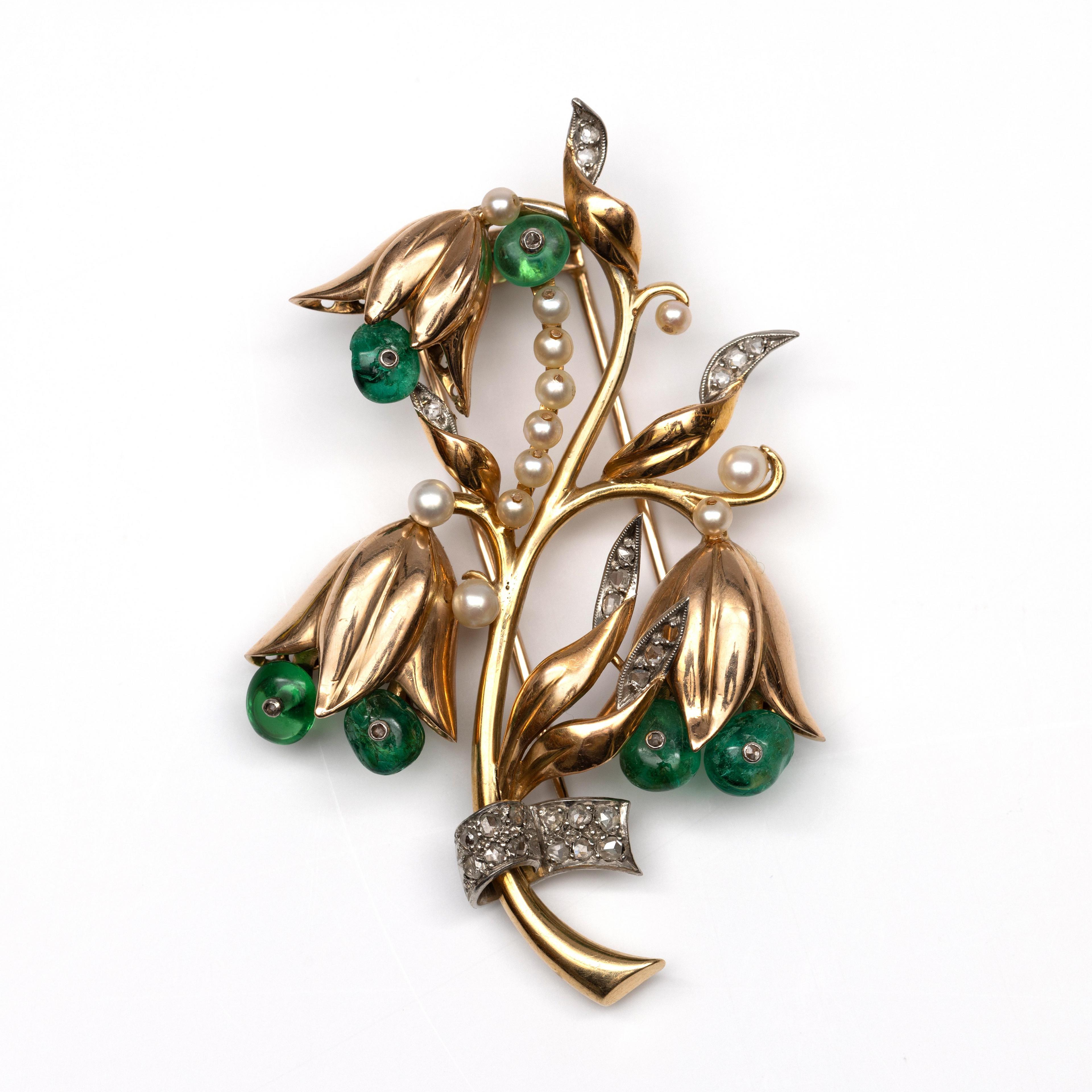 14 k. Gold brooch, 1950s, in the shape of a bunch of snowdrops, set with pearls, rose-cut diamond, and tumbled emerald.