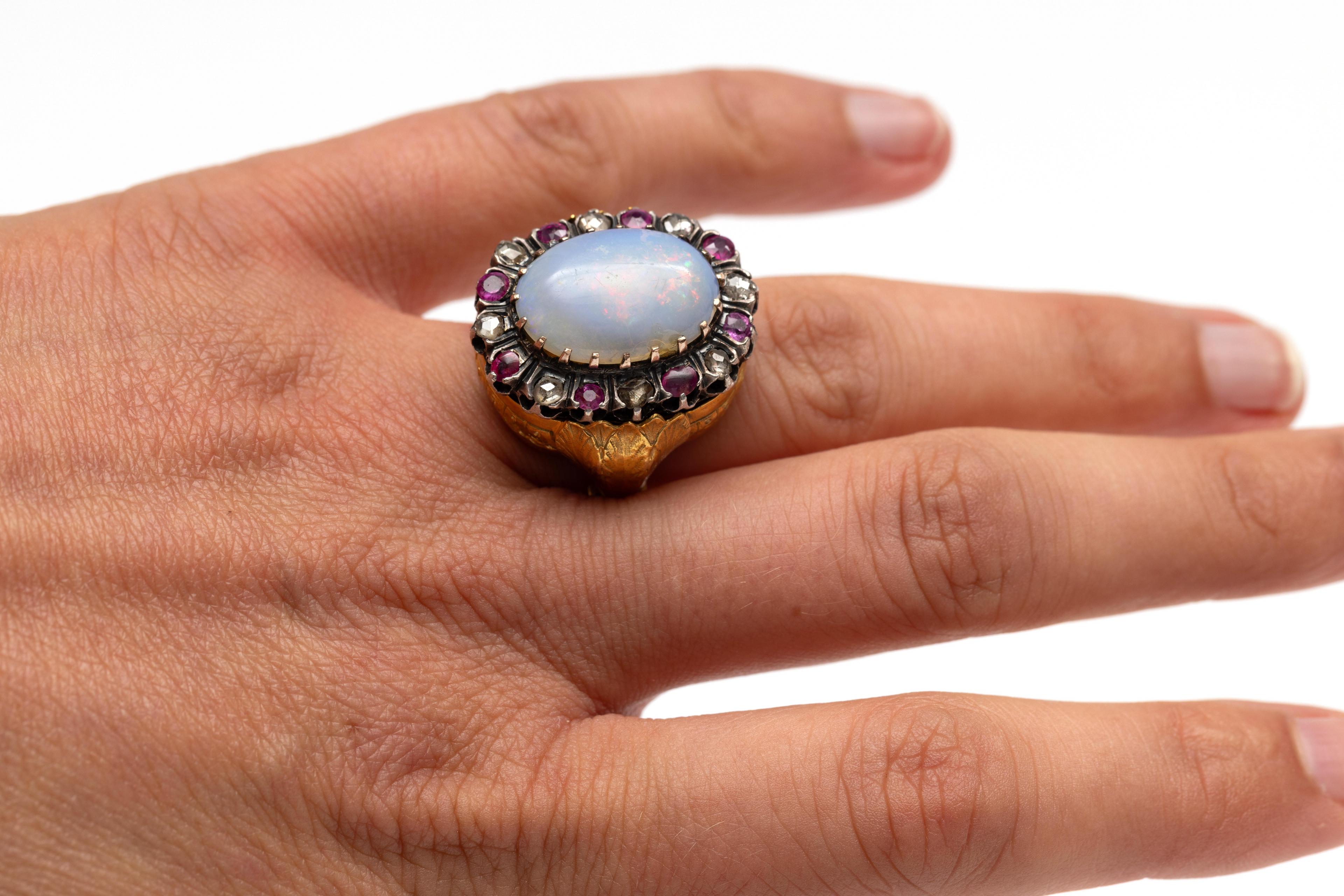 14 k. Gold and platinum ring, centrally set with an oval cabochon-cut opal (approx. 17.4 x 12.5 mm) in an entourage of alternating rose-cut diamonds and rubies