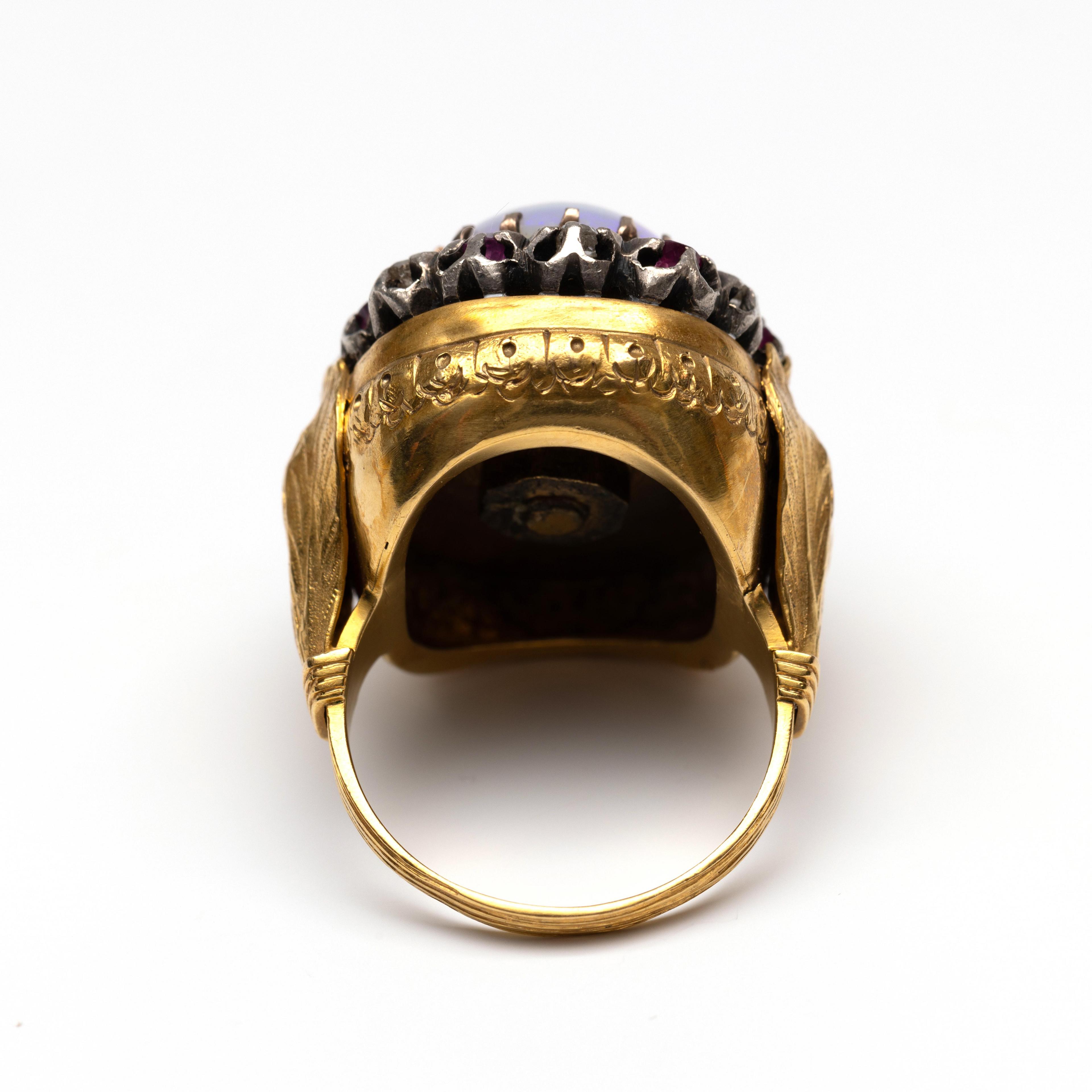 centraal bezet met een ovale cabochon geslepen opaal ( ca. 17,4 x 12,5 mm in een entourage van om en om gezette roosgeslepen diamant en robijn. De schouders met een decor van bladmotieven