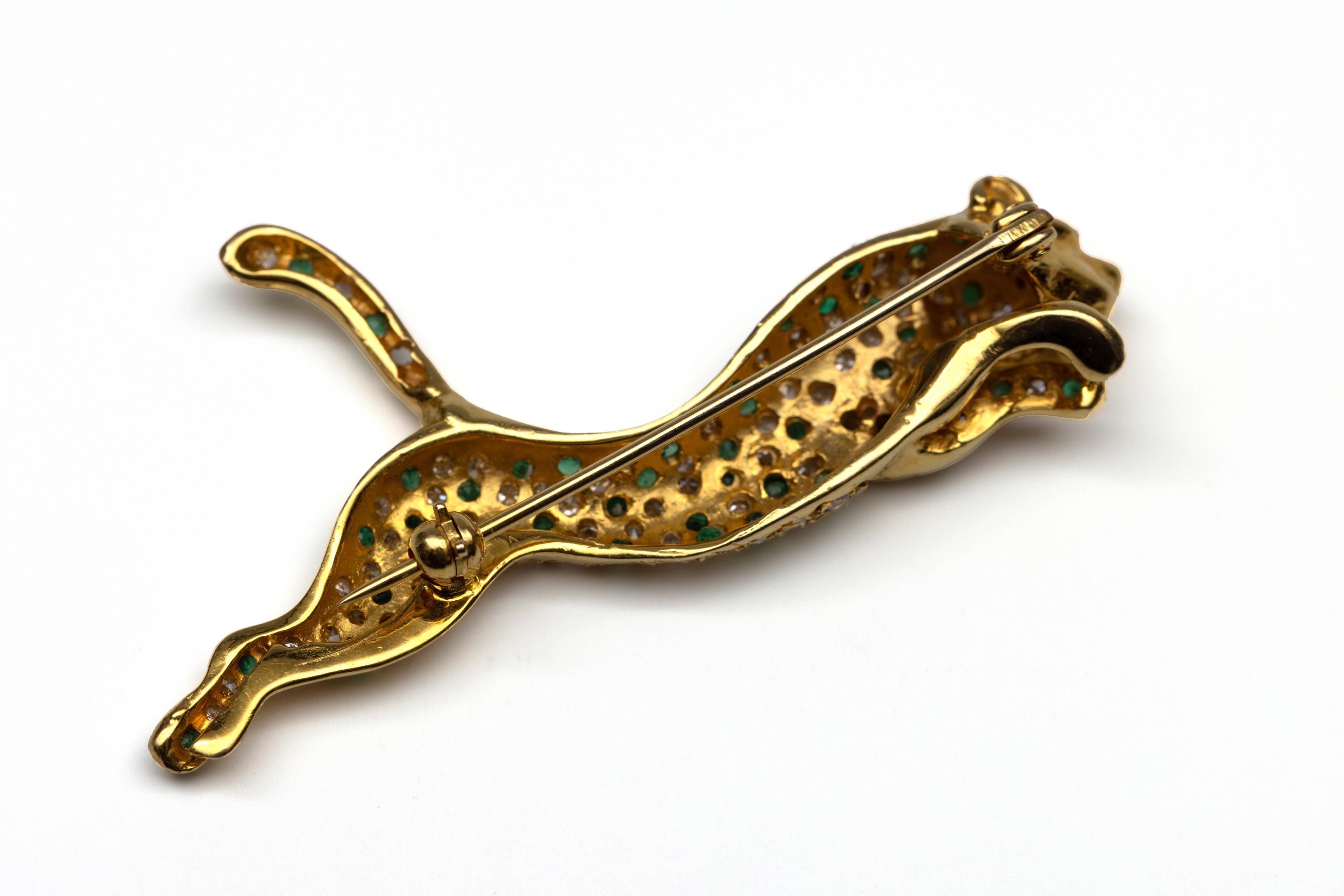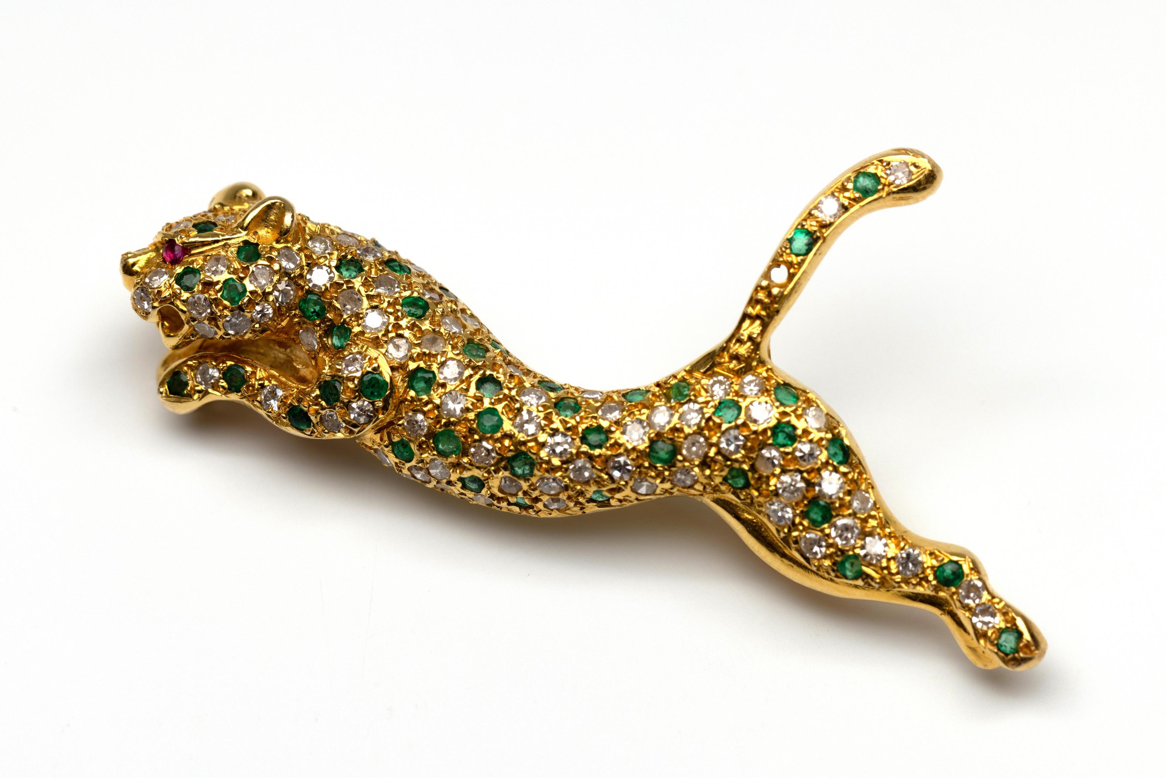 14 k. Gold brooch in the shape of a leaping panther. The body is set with small round faceted emeralds and single cut diamonds. The eye is set with a ruby.