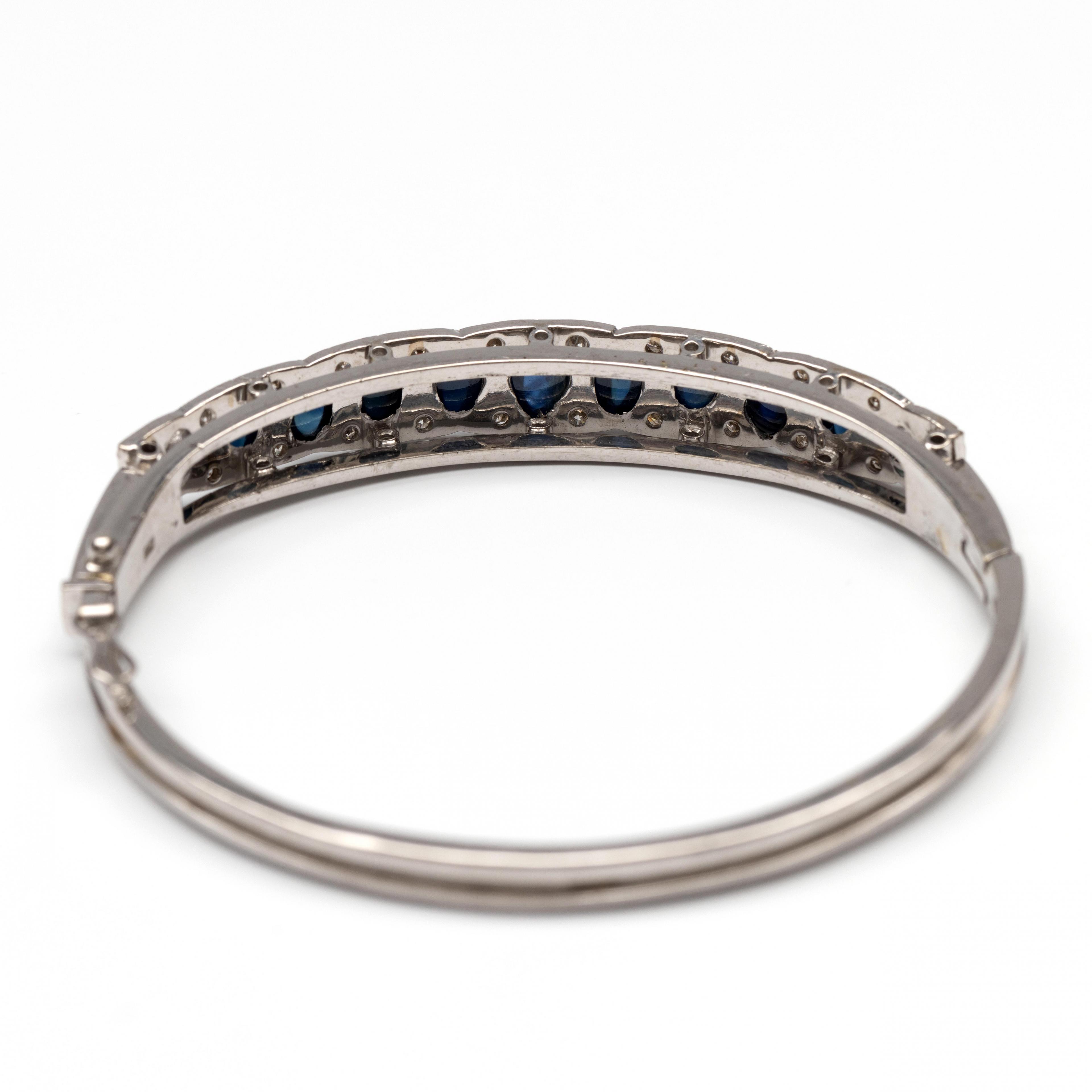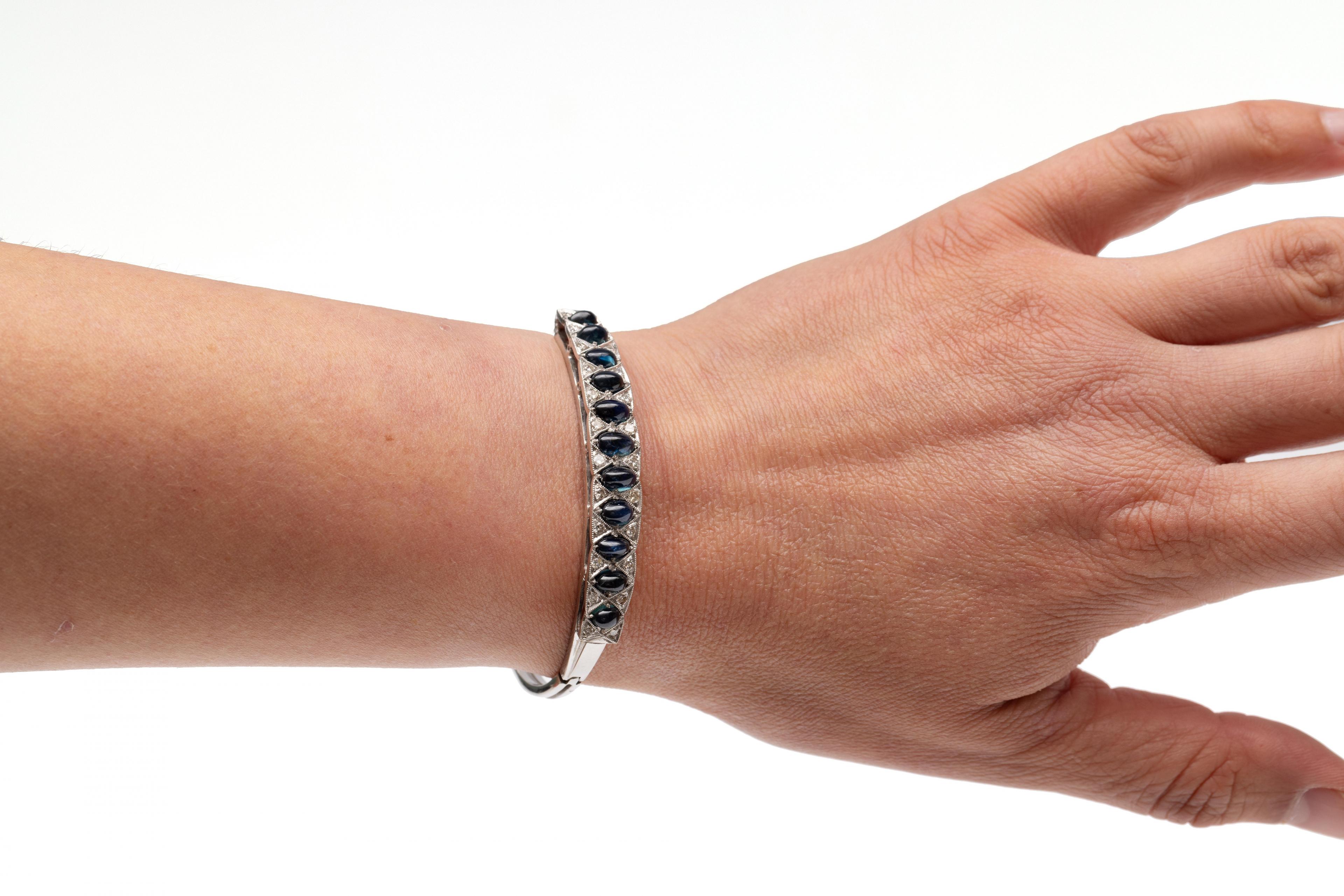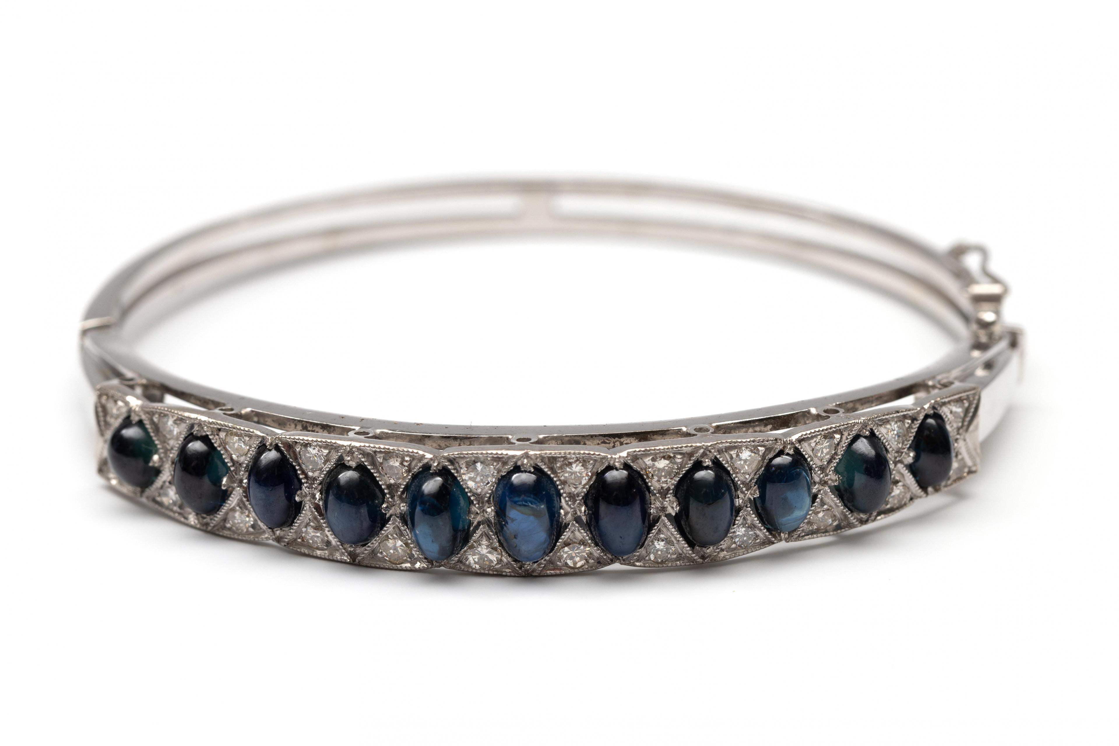 14 k. White gold rigid bracelet. The top is slightly scalloped and set with cabochon-cut blue sapphires of decreasing size from the center (6 x 4 - 5 x 2.5 mm), between which are small brilliant-cut diamonds with a total weight of approximately 0.60 ct.