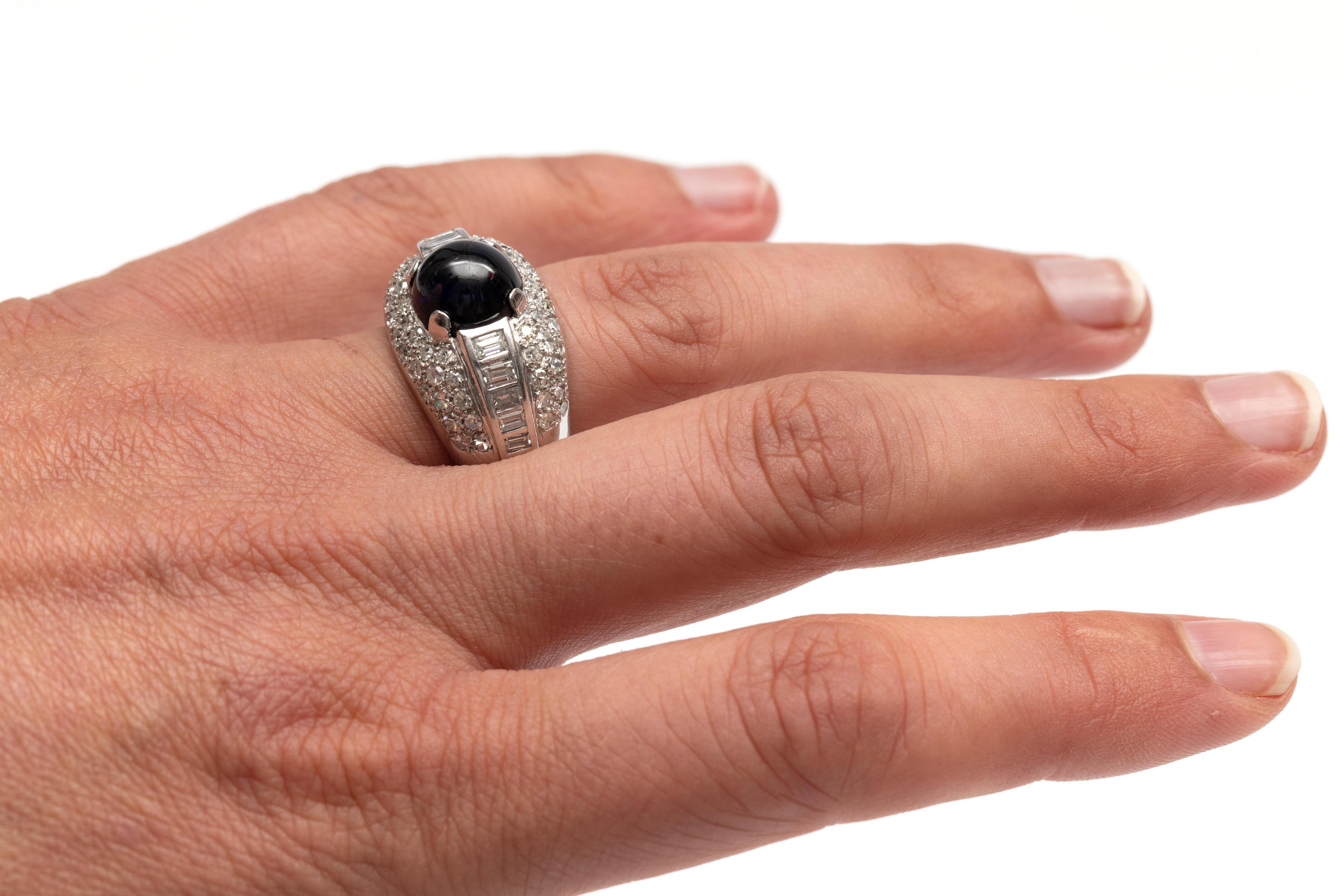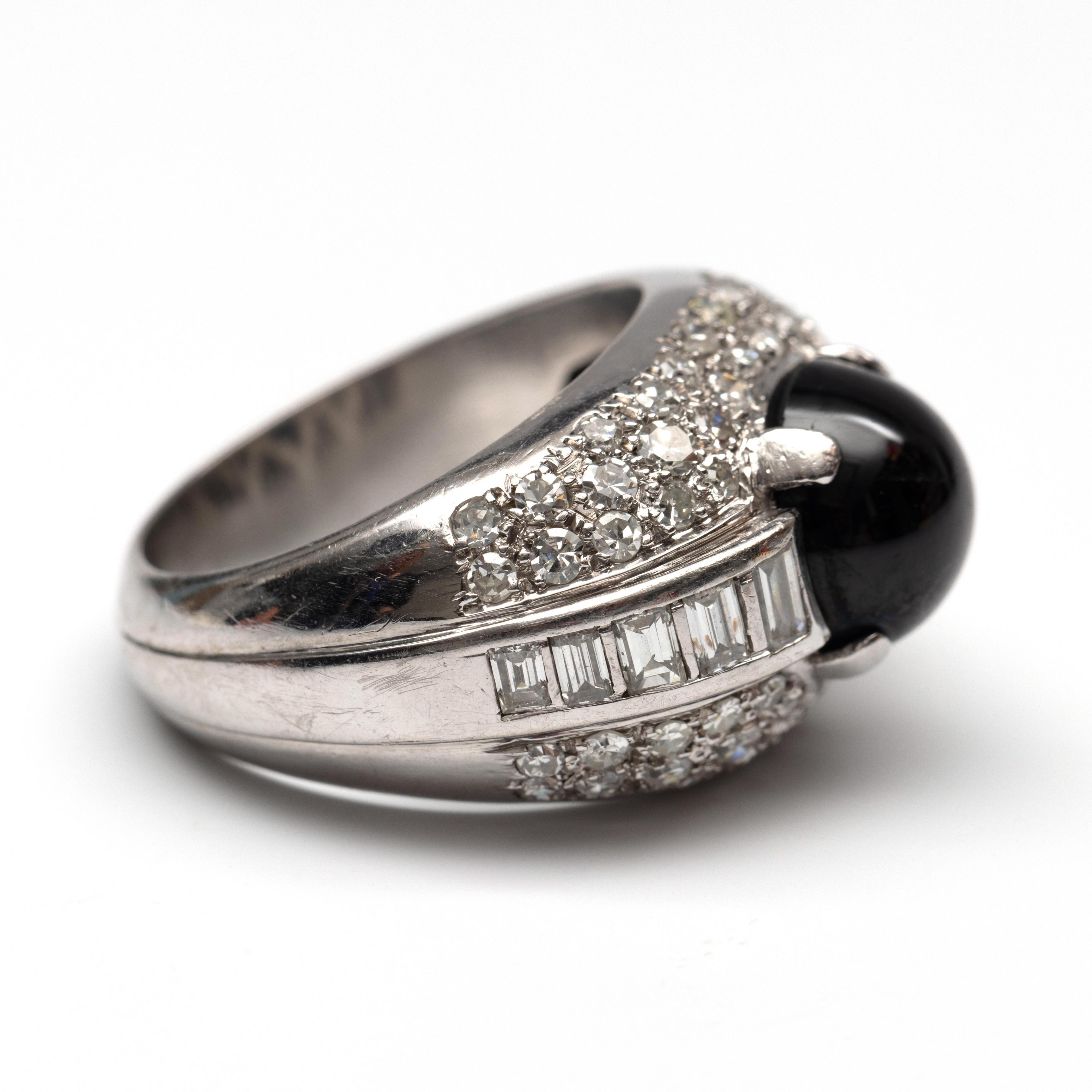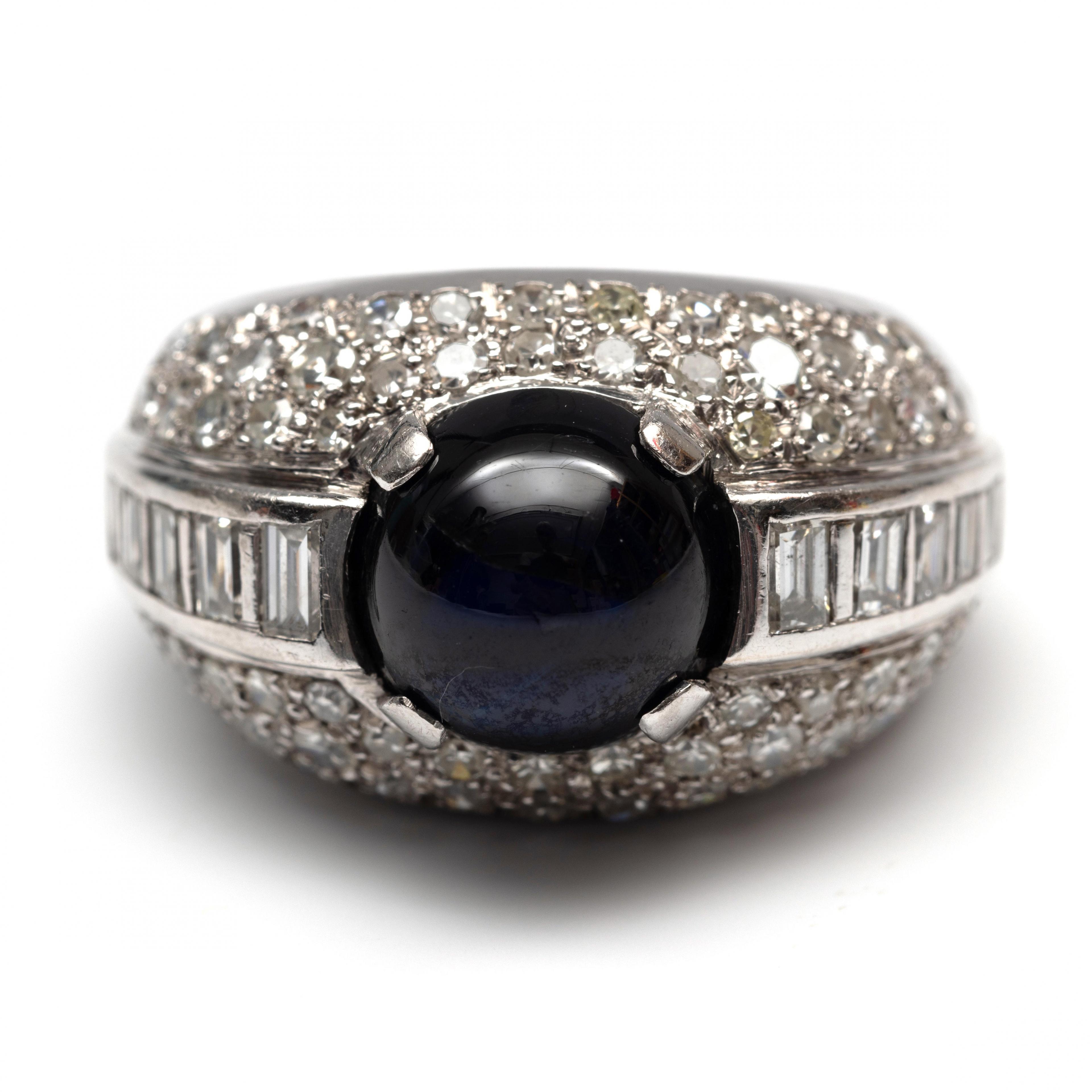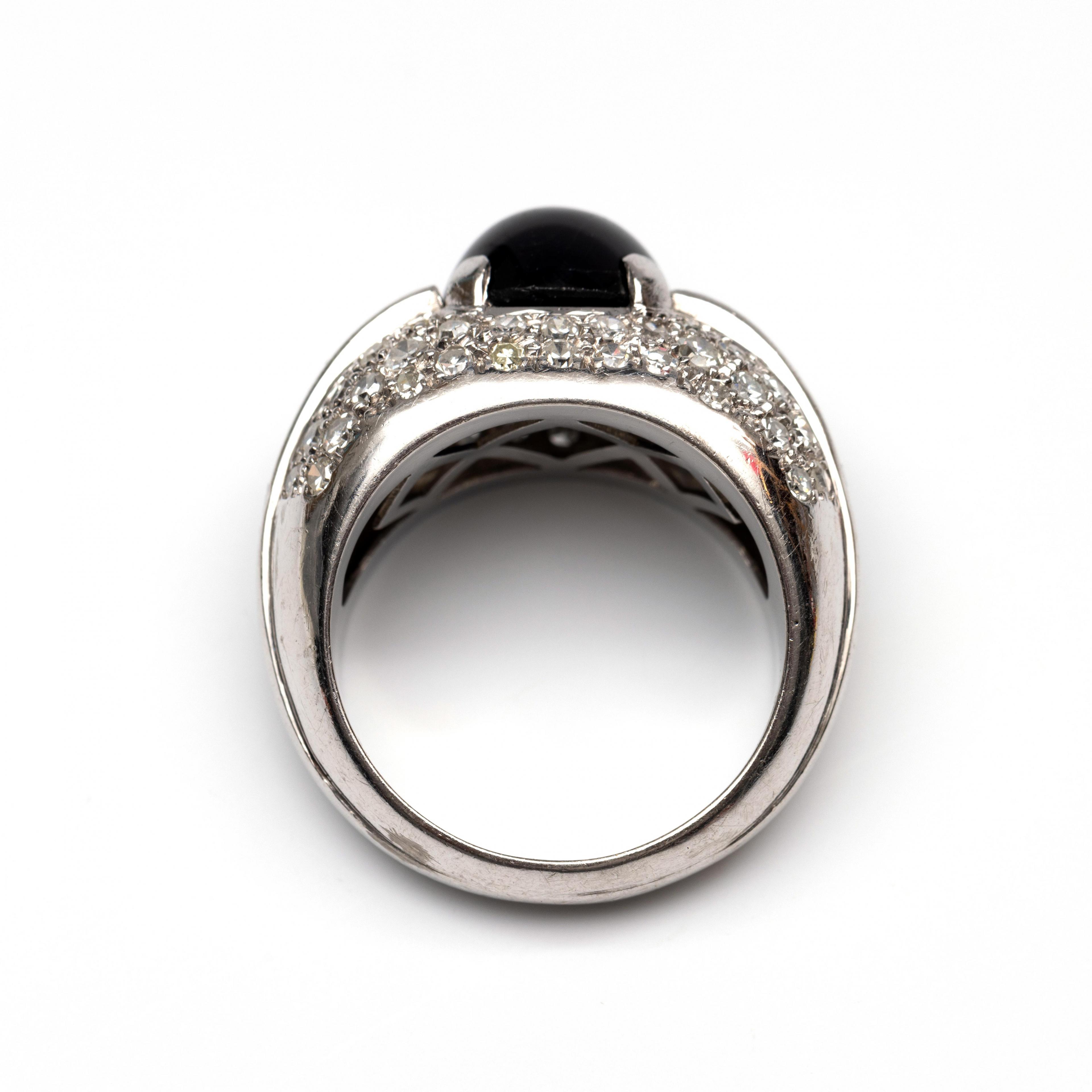 centraal bezet met een ronde cabochon geslepen donkerblauwe saffier, met aan weerszijden een rij baguette geslepen diamanten, aflopend in grootte vanaf het midden. De rest van de bovenzijde pavé bezet met achtkant geslepen diamant. Totaal diamant gewicht ca. 1.50 ct.