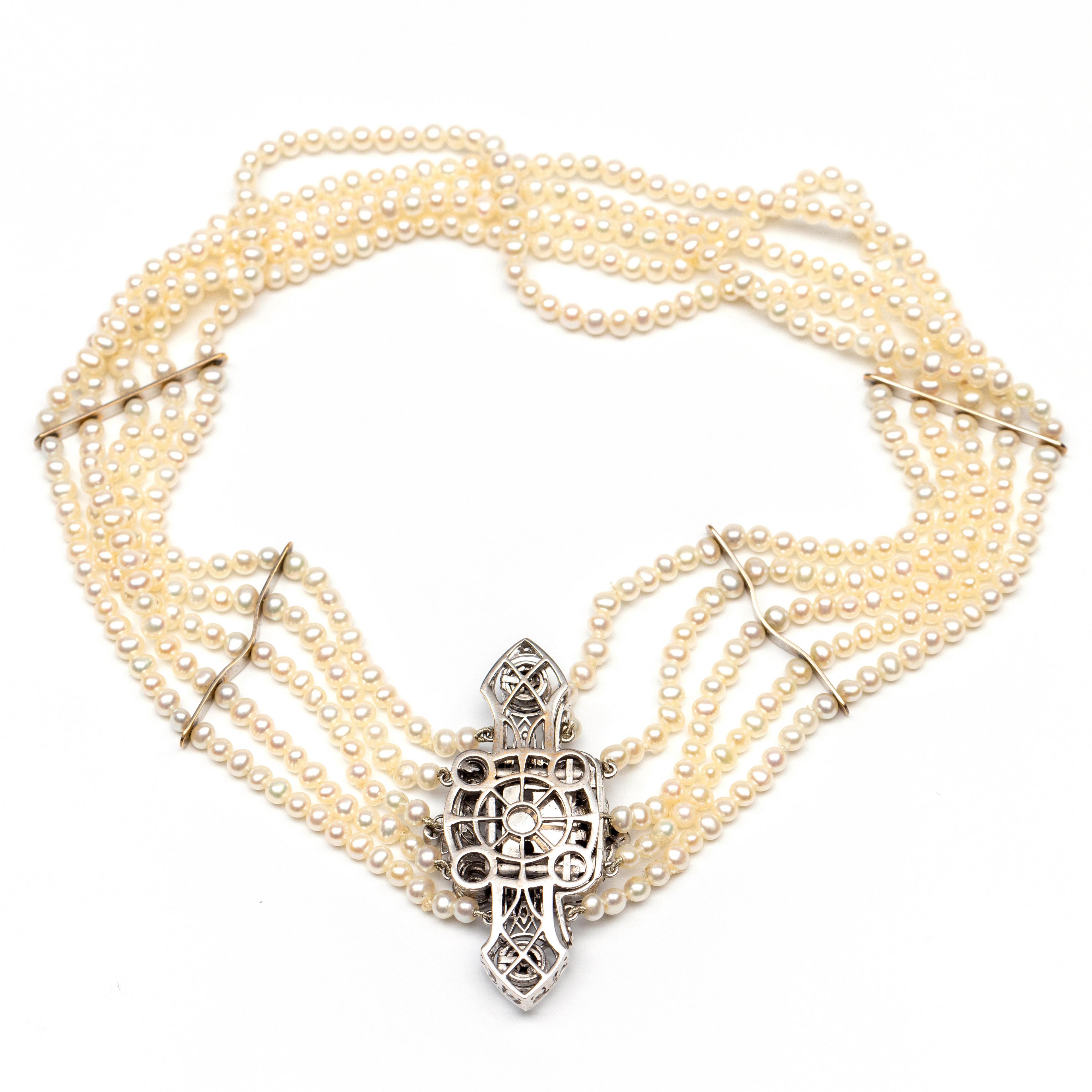 van vijf strengen witte parels, waartussen verticale witgouden balkjes. Aan een18 kt. witgouden met platina sluiting in Belle Epoque stijl, gedecoreerd met florale motieven en guirlandes en bezet met oud briljant en roosgeslepen diamant, met een totaalgewicht van ca. 1.00 ct.