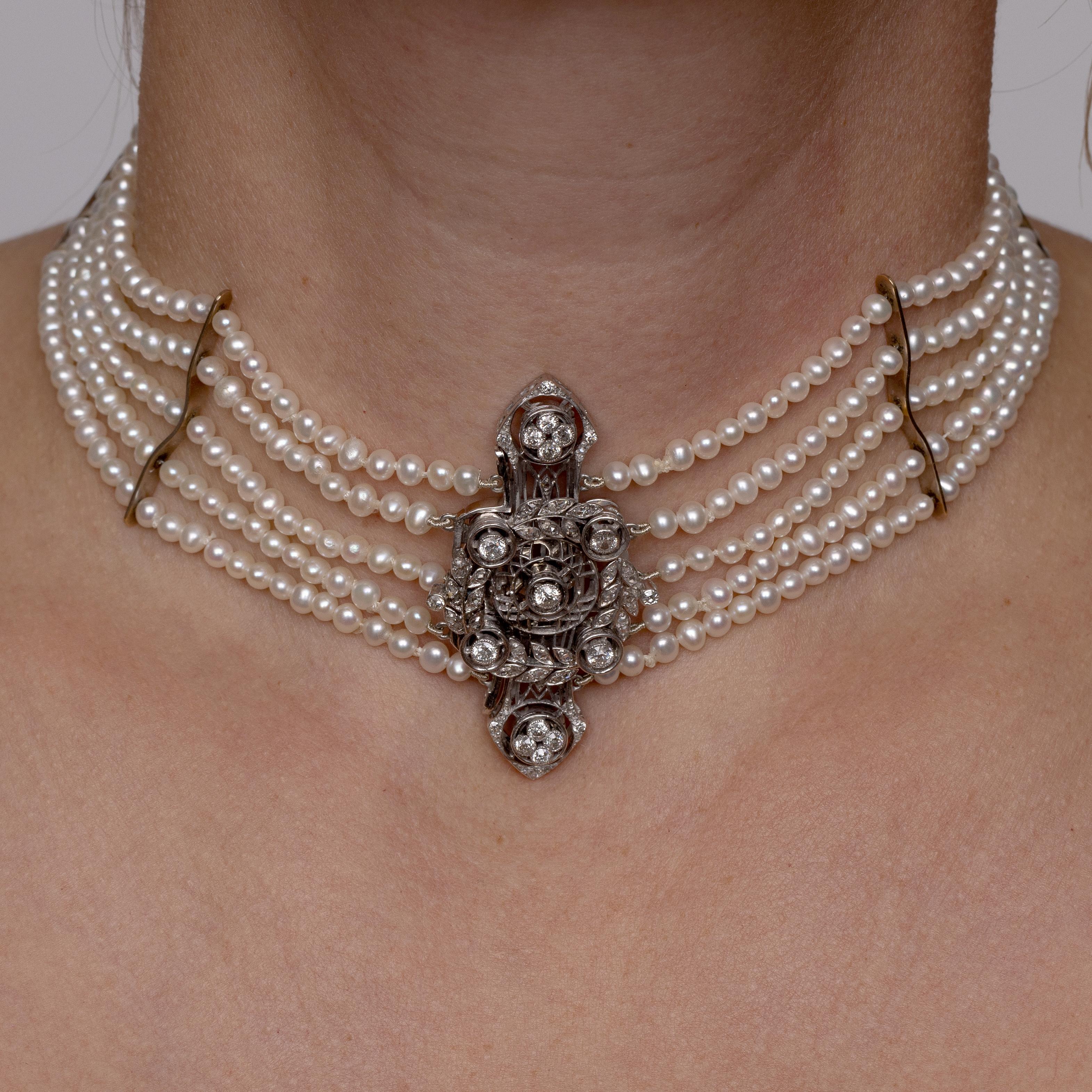 Dog collar necklace, made of five strands of white pearls, interspersed with vertical 18 k. white gold and platinum bars. On a Belle Époque-style white gold clasp, decorated with floral motifs and garlands and set with old brilliant-cut and rose-cut diamonds, with a total weight of approximately 1.00 ct.