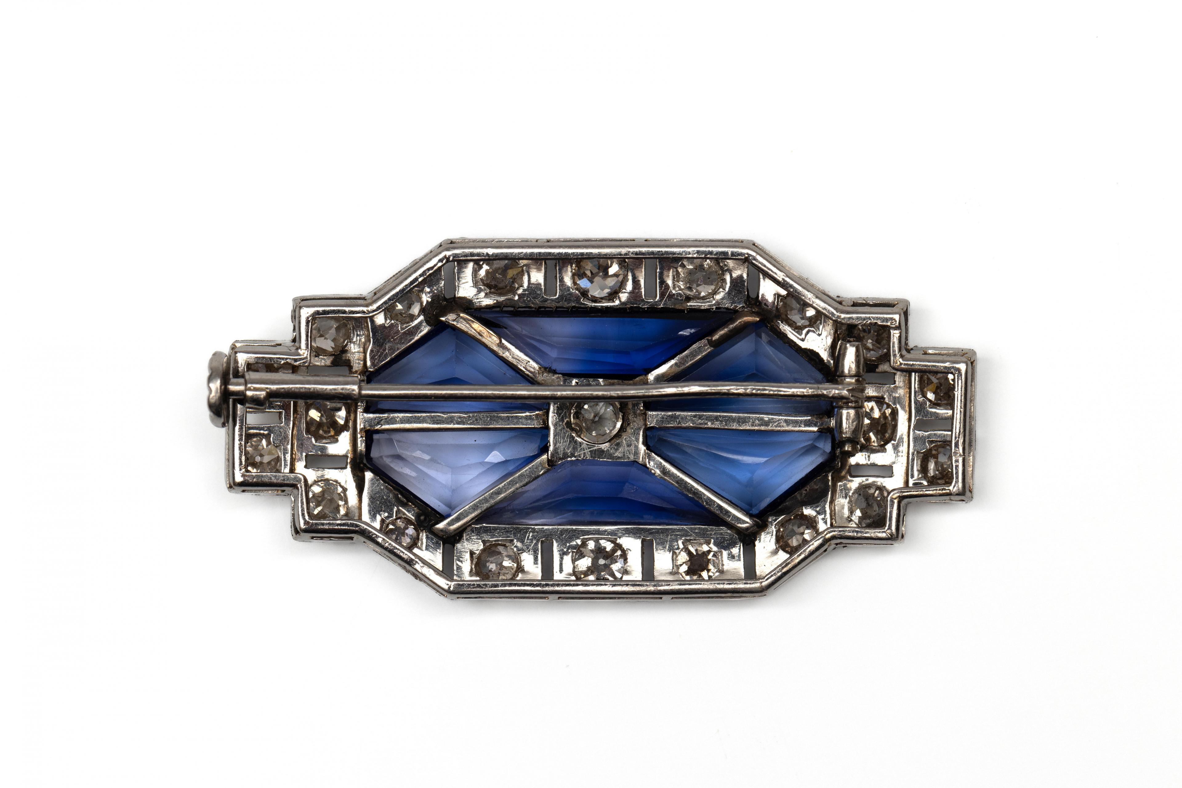 Platinum brooch, Art Deco. Centrally set with fantasy-cut synthetic blue sapphires and a centered, old brilliant-cut diamond. The whole framed by a geometric border set with old brilliant-cut diamonds. Total diamond weight approx. 3.00 ct.