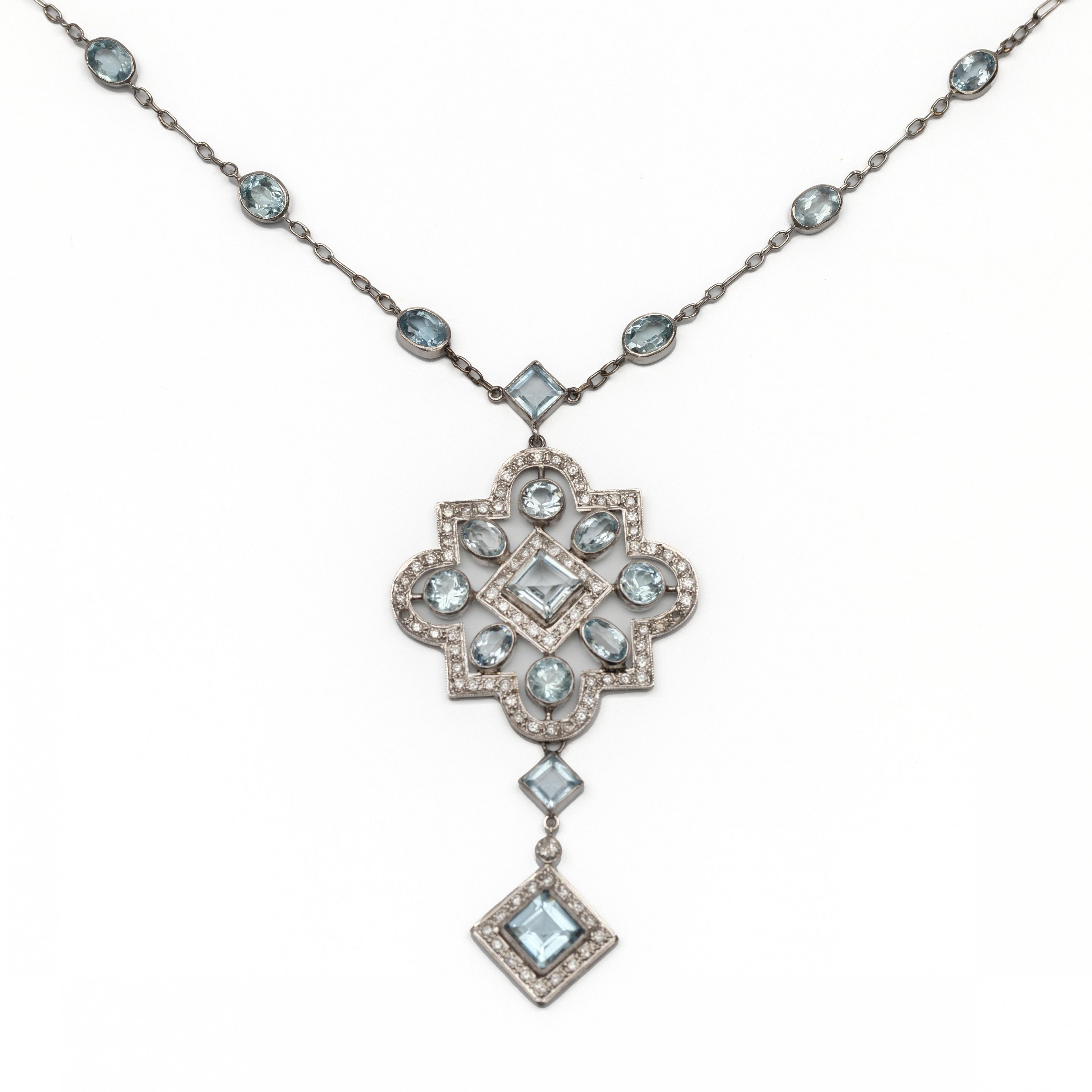 de onderzijde met geometrisch vormgegeven hanger bezet met carré geslepen en ovale aquamarijn. De randen bezet met kleine briljant geslepen diamant. Aan de onderzijde, los bungelend een dubbele ruit met carré geslepen aquamarijn en briljant geslepen diamant. Aan een fijn schakelcollier, de schakels aan de voorzijde afgewisseld met aquamarijnen. Totaal diamant gewicht ca. 0.80 ct.