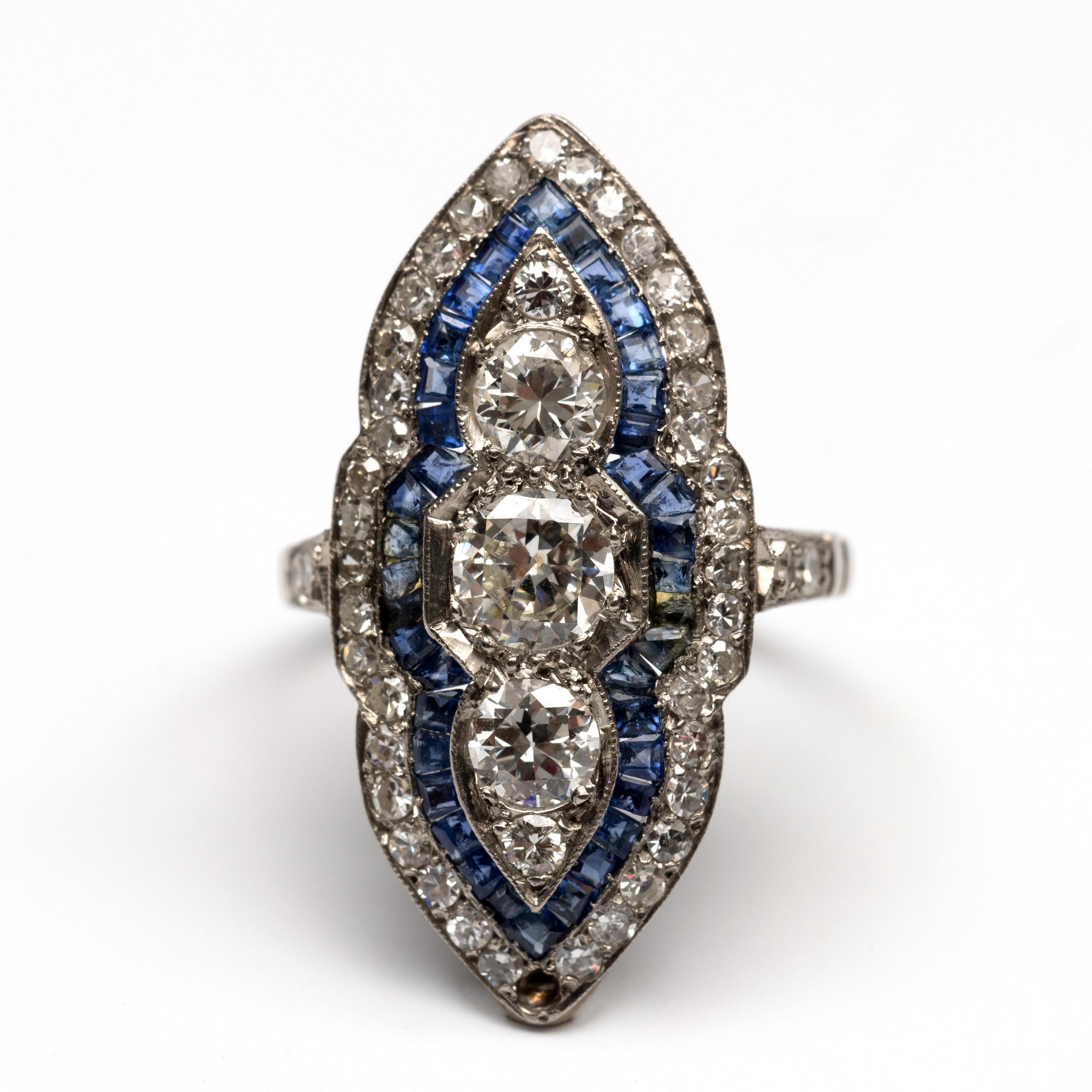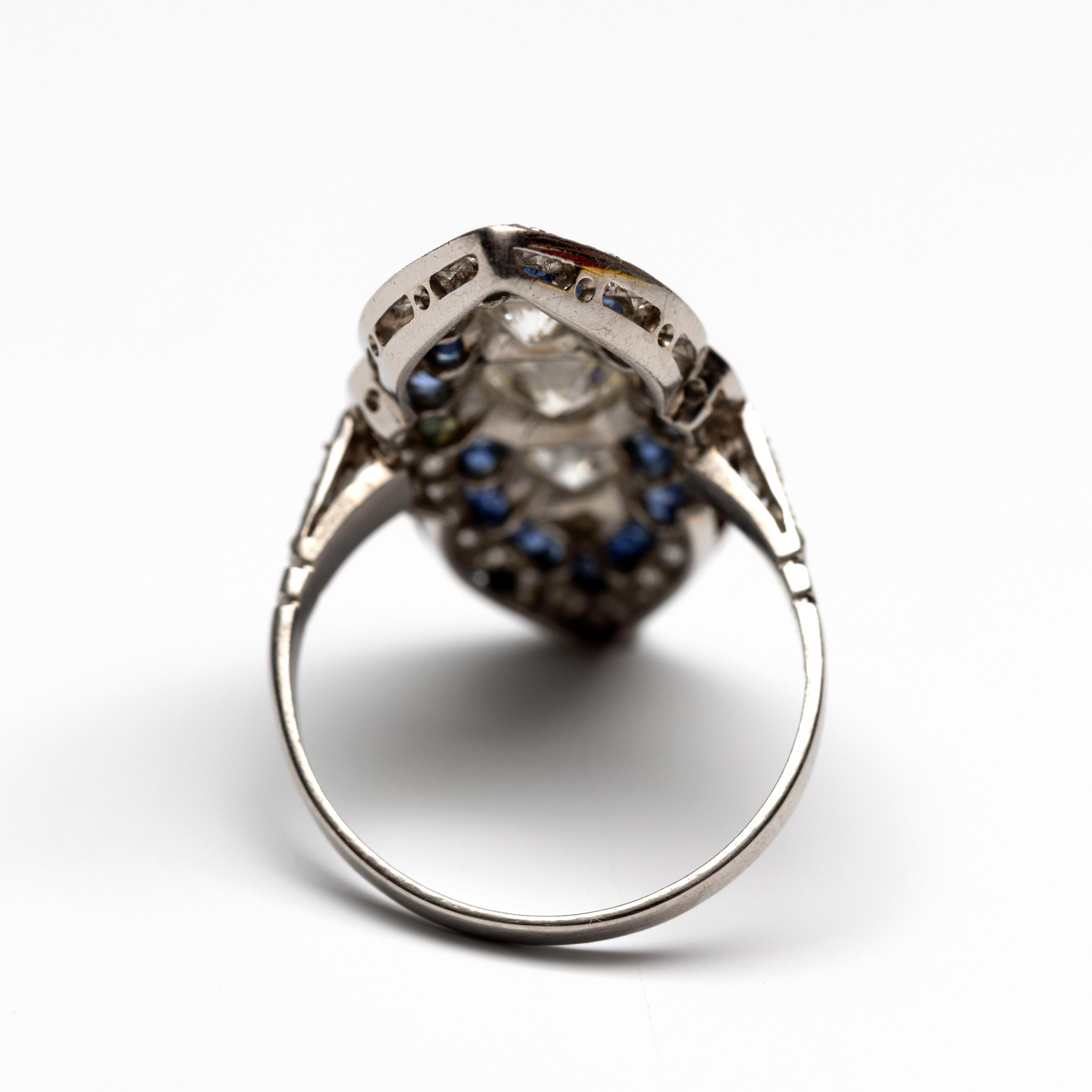 Platinum marquise-shaped ring in Art Deco style. Featuring five central brilliant-cut diamonds, decreasing in size from the center, in a double entourage of calibrated blue sapphires and single cut diamonds. The shoulders are each set with two small single cut diamonds. Total diamond weight: approx. 1.70 ct.