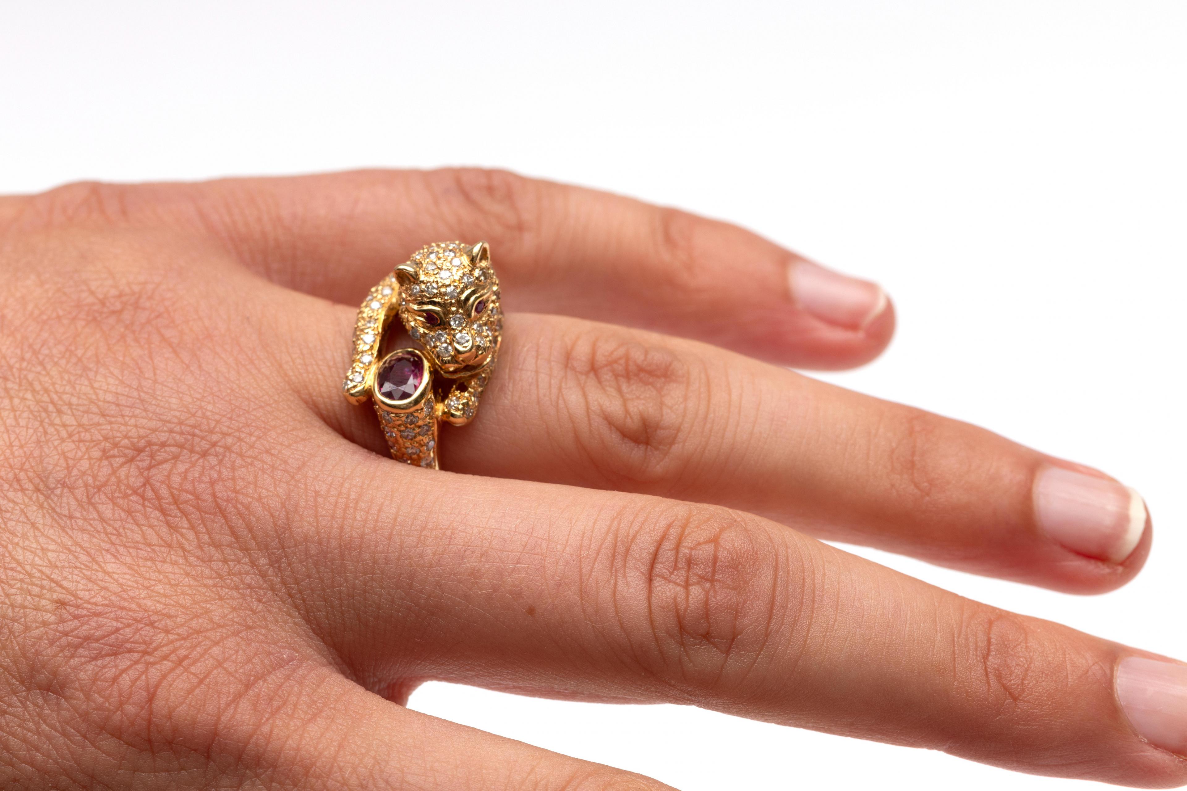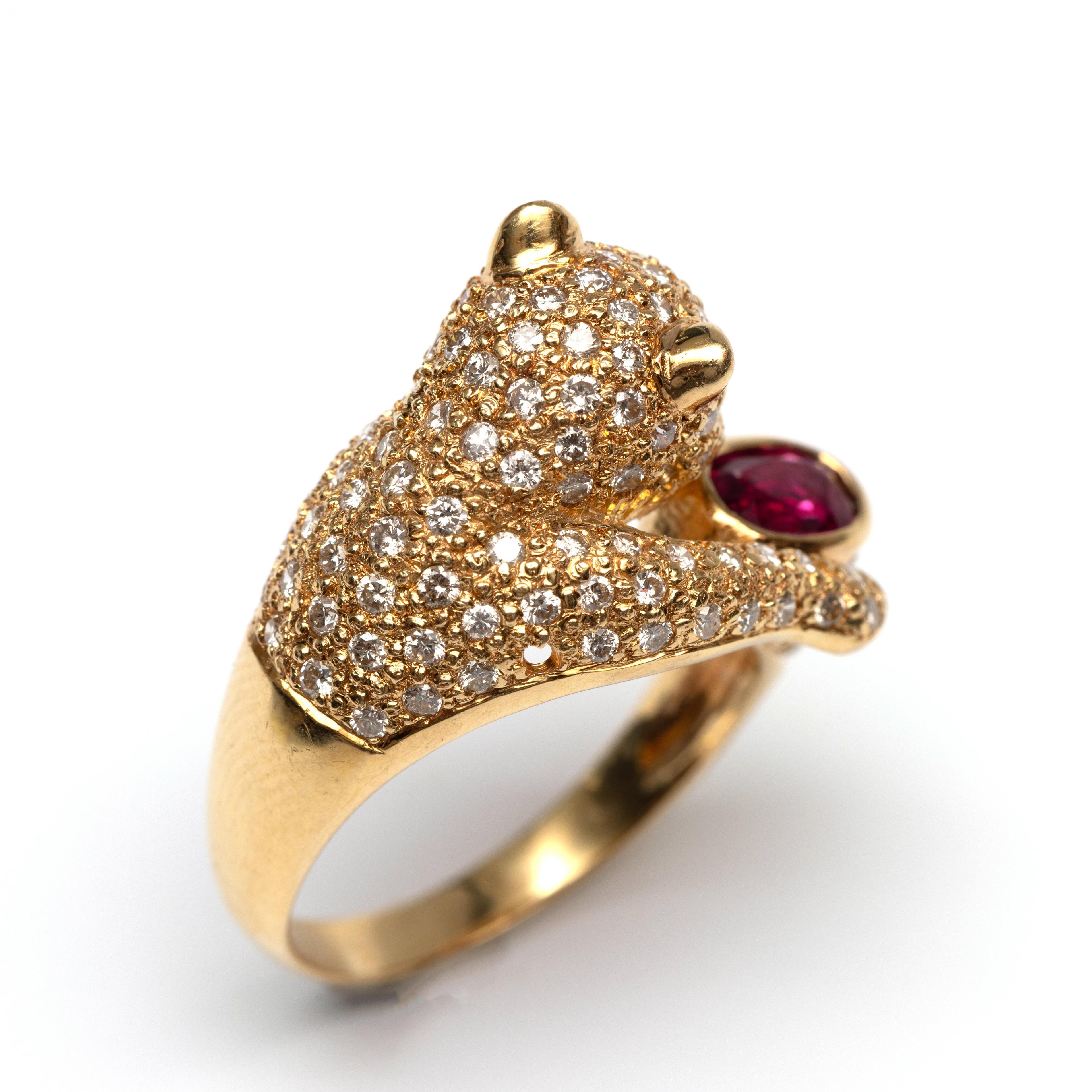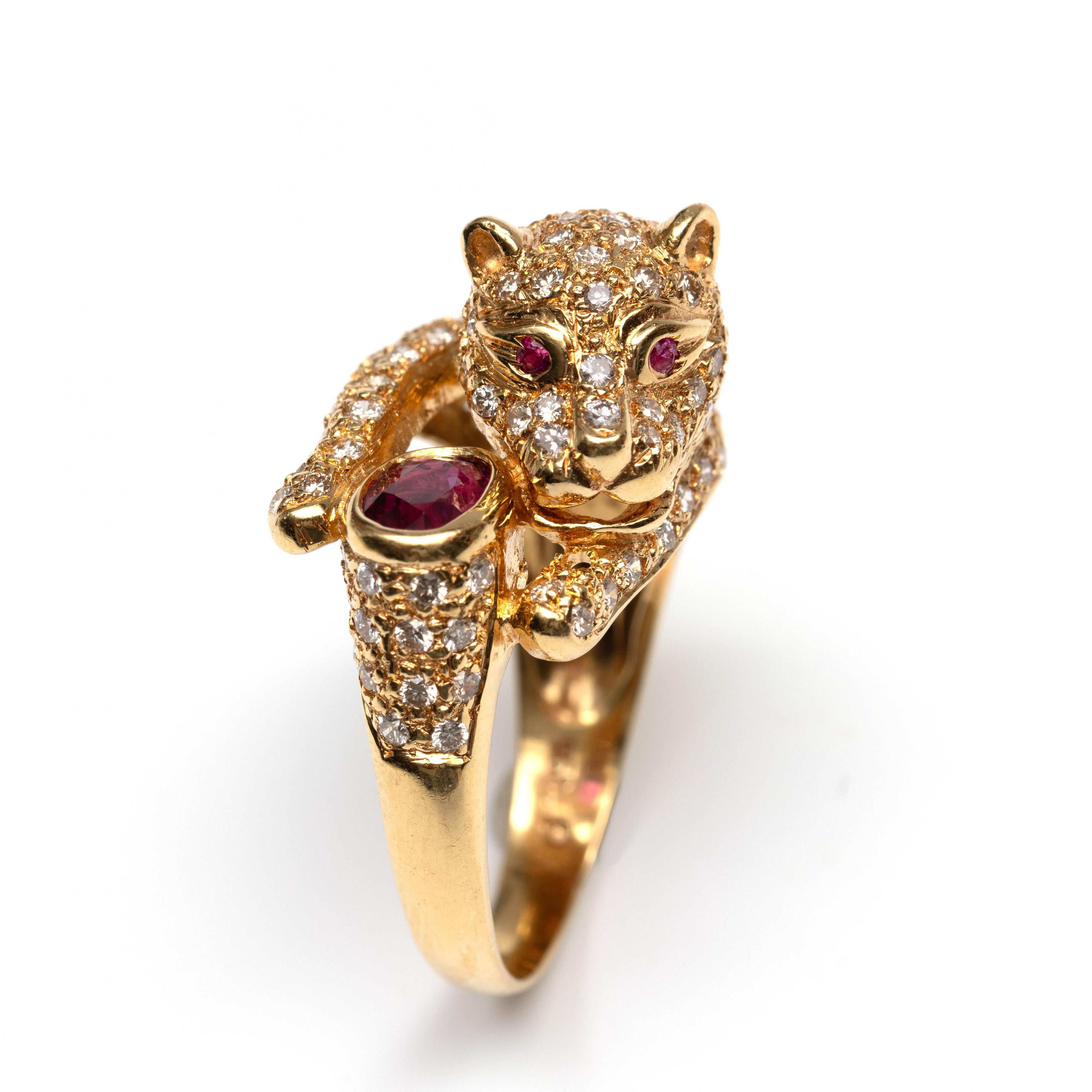 18 k. Gold ring in the shape of a panther with an oval faceted ruby (approx. 6 x 4 mm) between its paws. The top is pavé-set with small brilliant-cut diamonds weighing approximately 1.00 ct. The panther's eyes are made of small round faceted rubies.