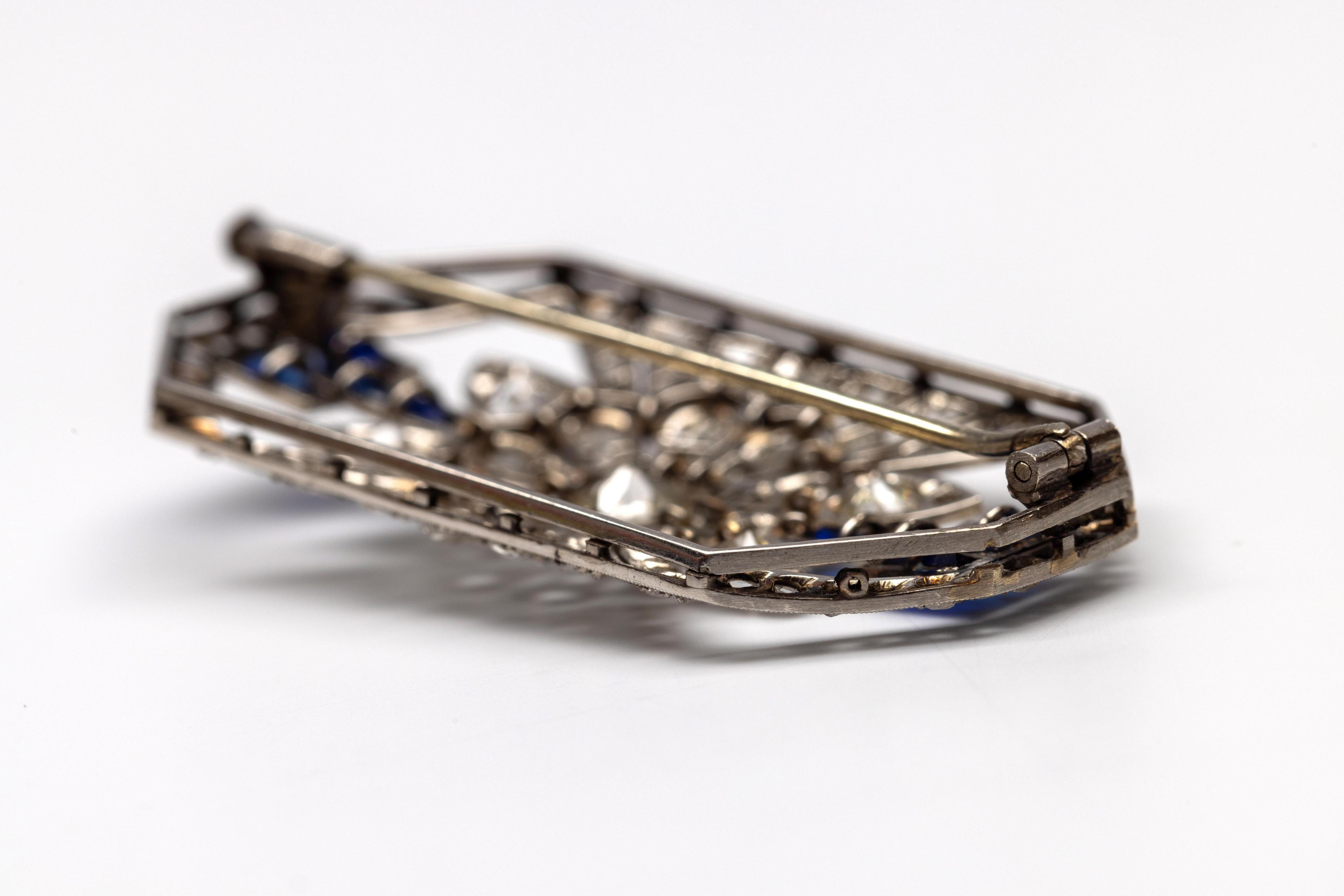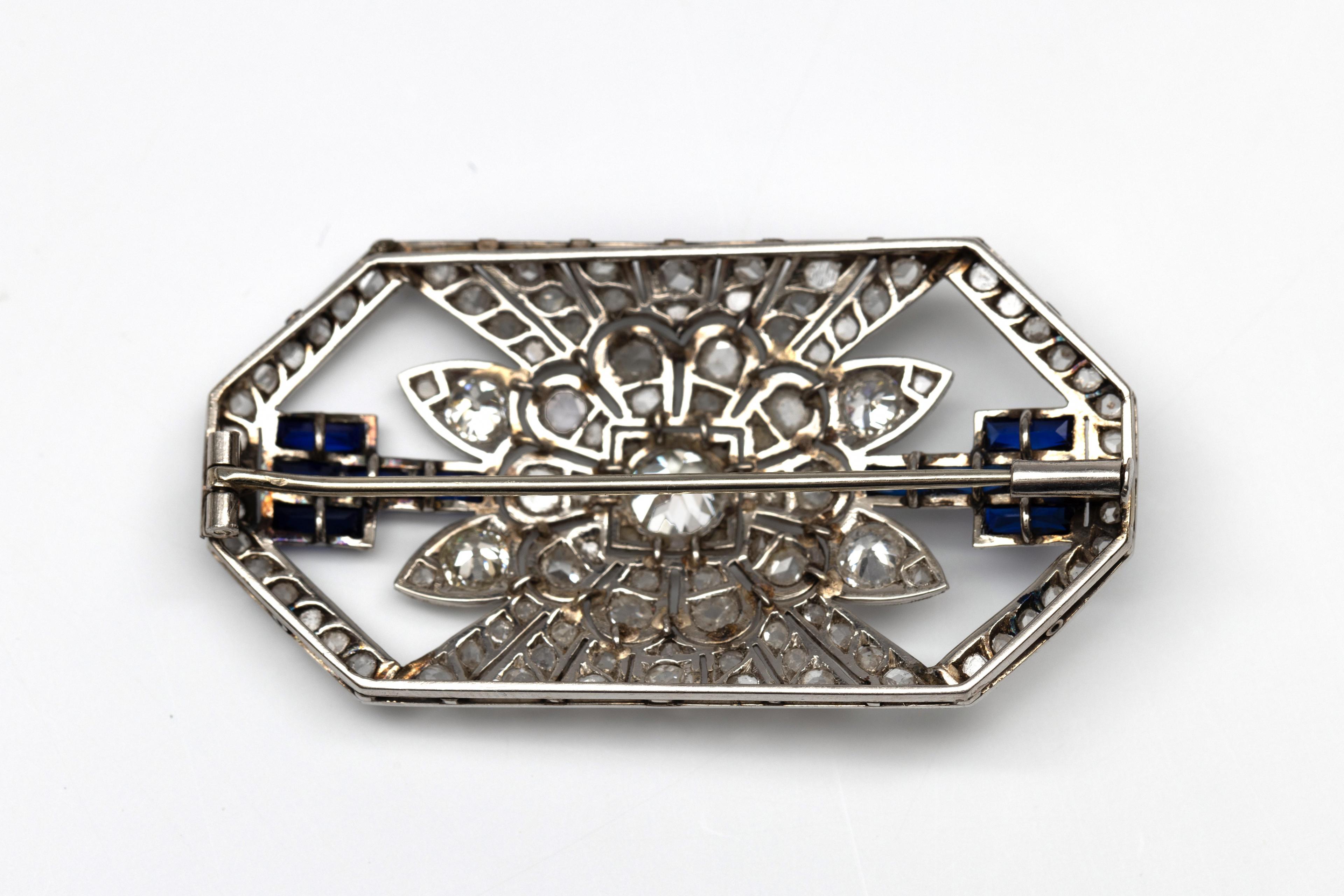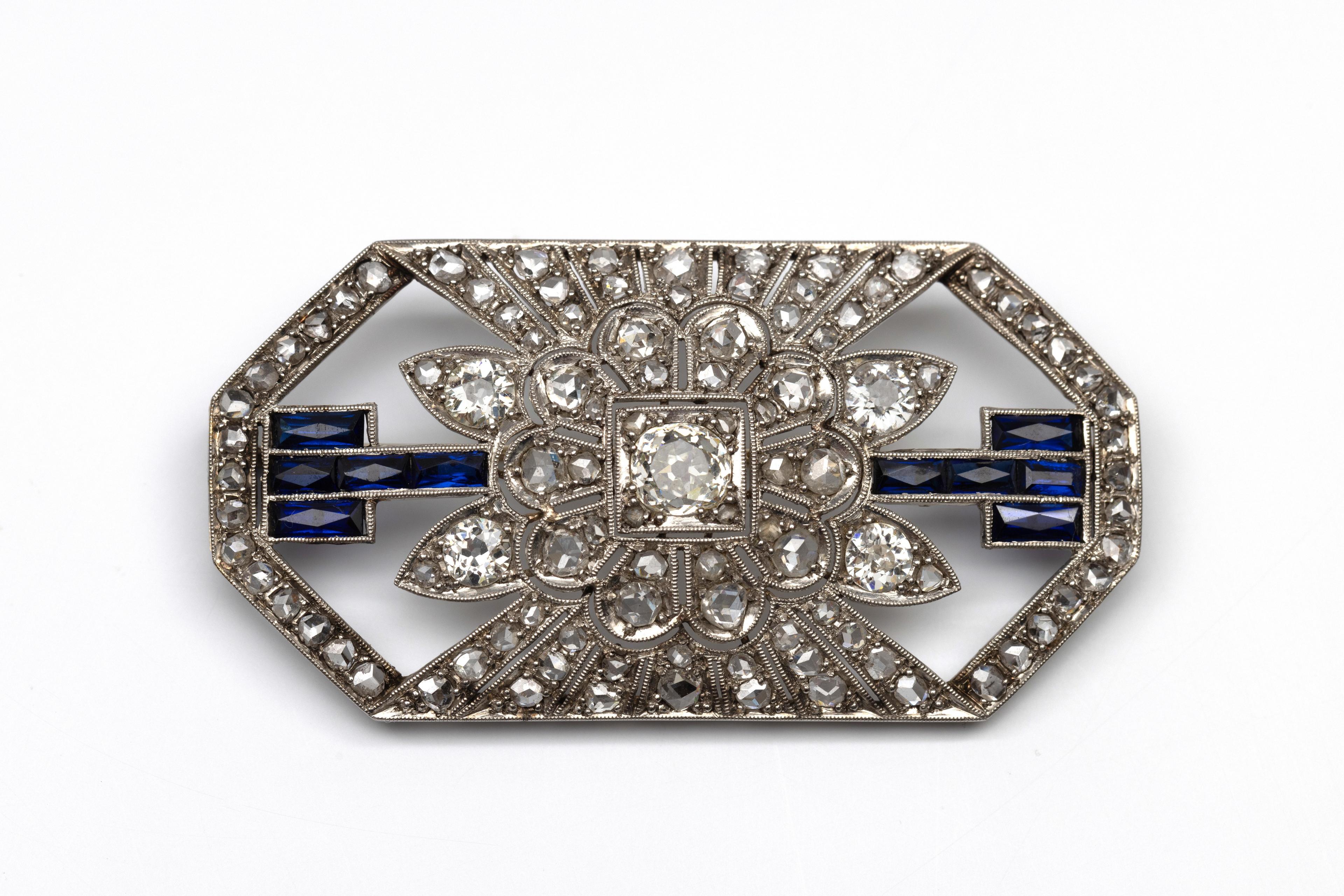 18 k. White gold and platinum octagonal plaque brooch, Art Deco. With a flower shape in the centre, at its heart, set with an old brilliant-cut diamond of approximately 0.50 ct., flanked on both sides by bands of calibrated blue sapphires. Above and below the flower are diagonal bands set with rose-cut diamonds. Total diamond weight: approximately 3.00 ct.