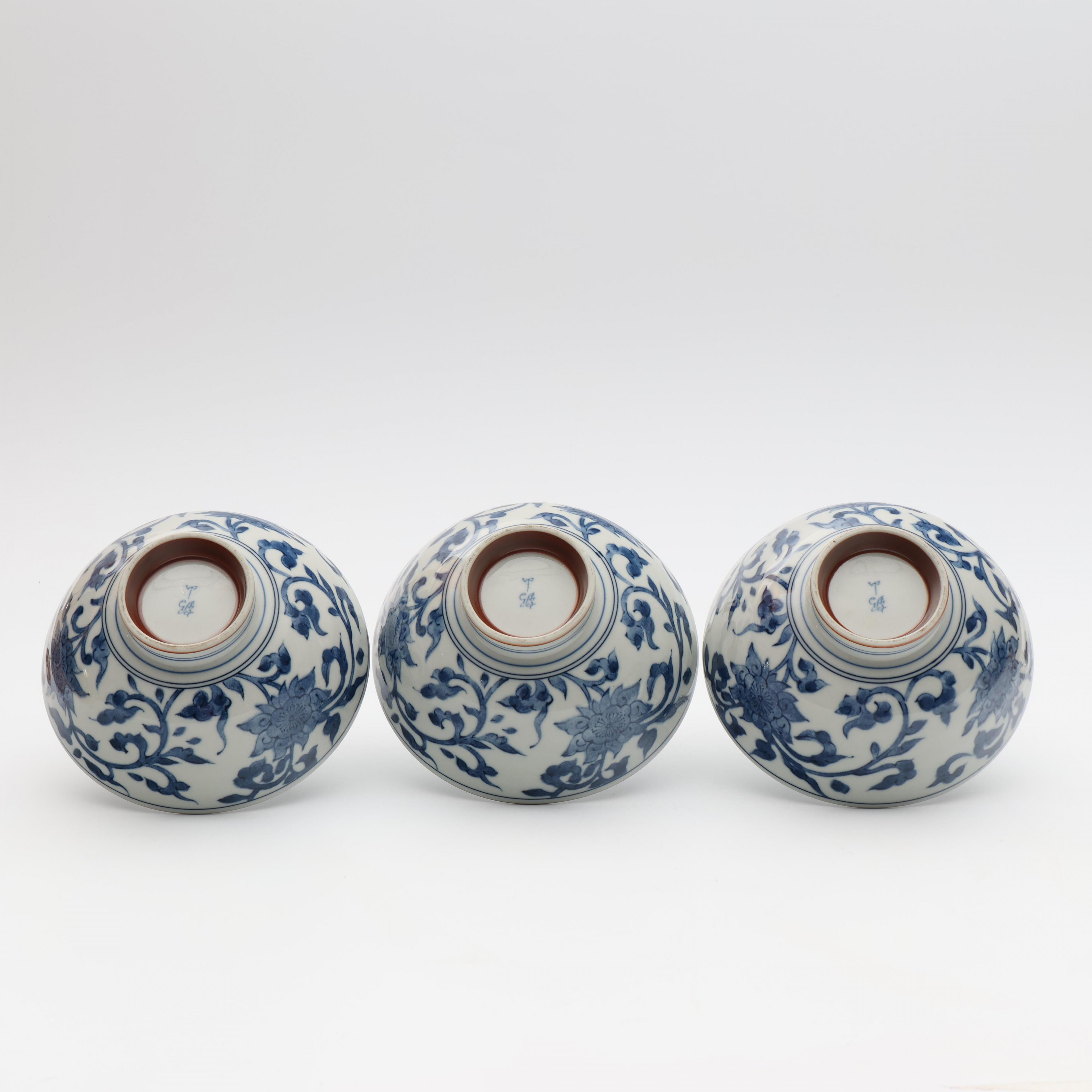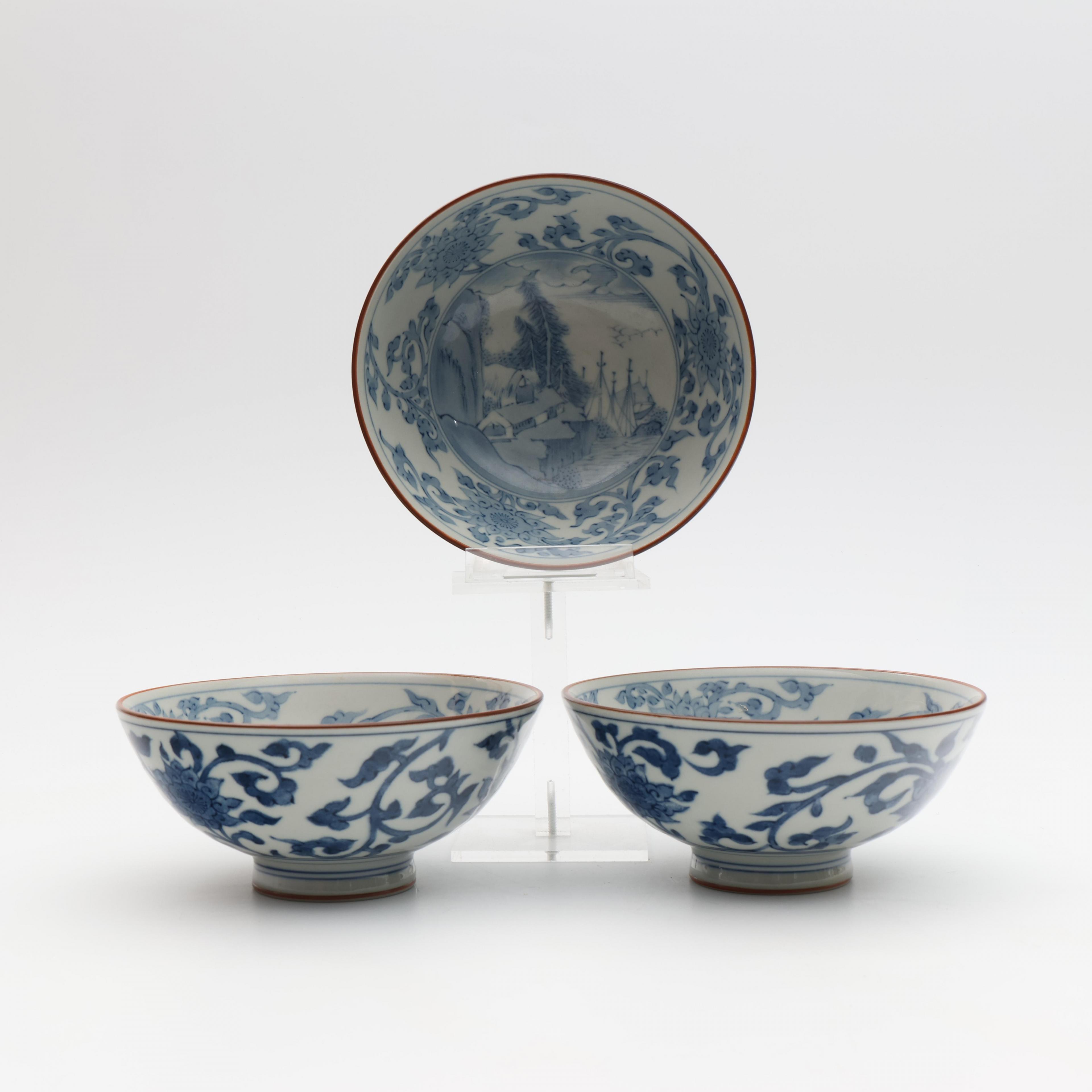 each decorated with a harbour scene, the exterior in transferprint with lotus scroll
