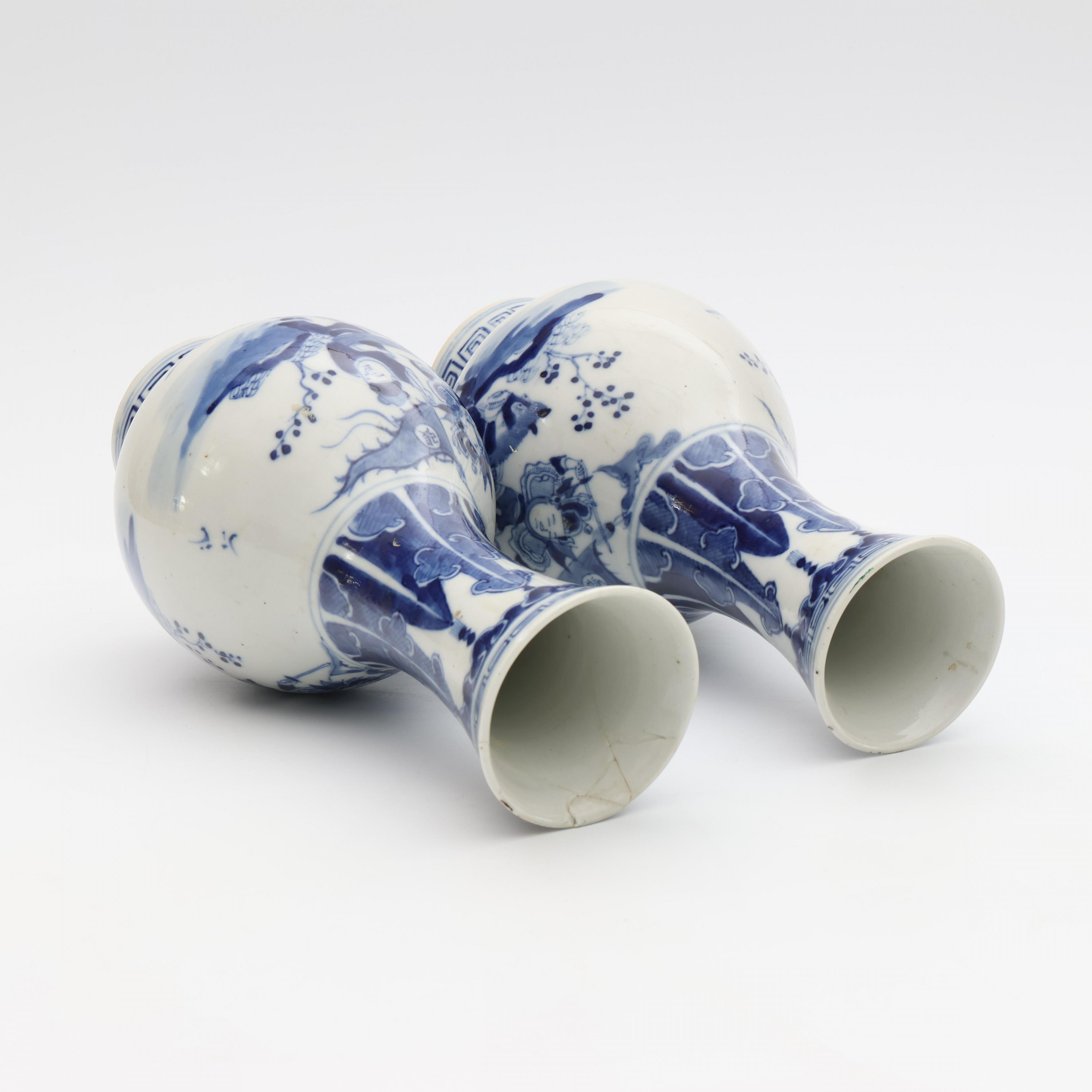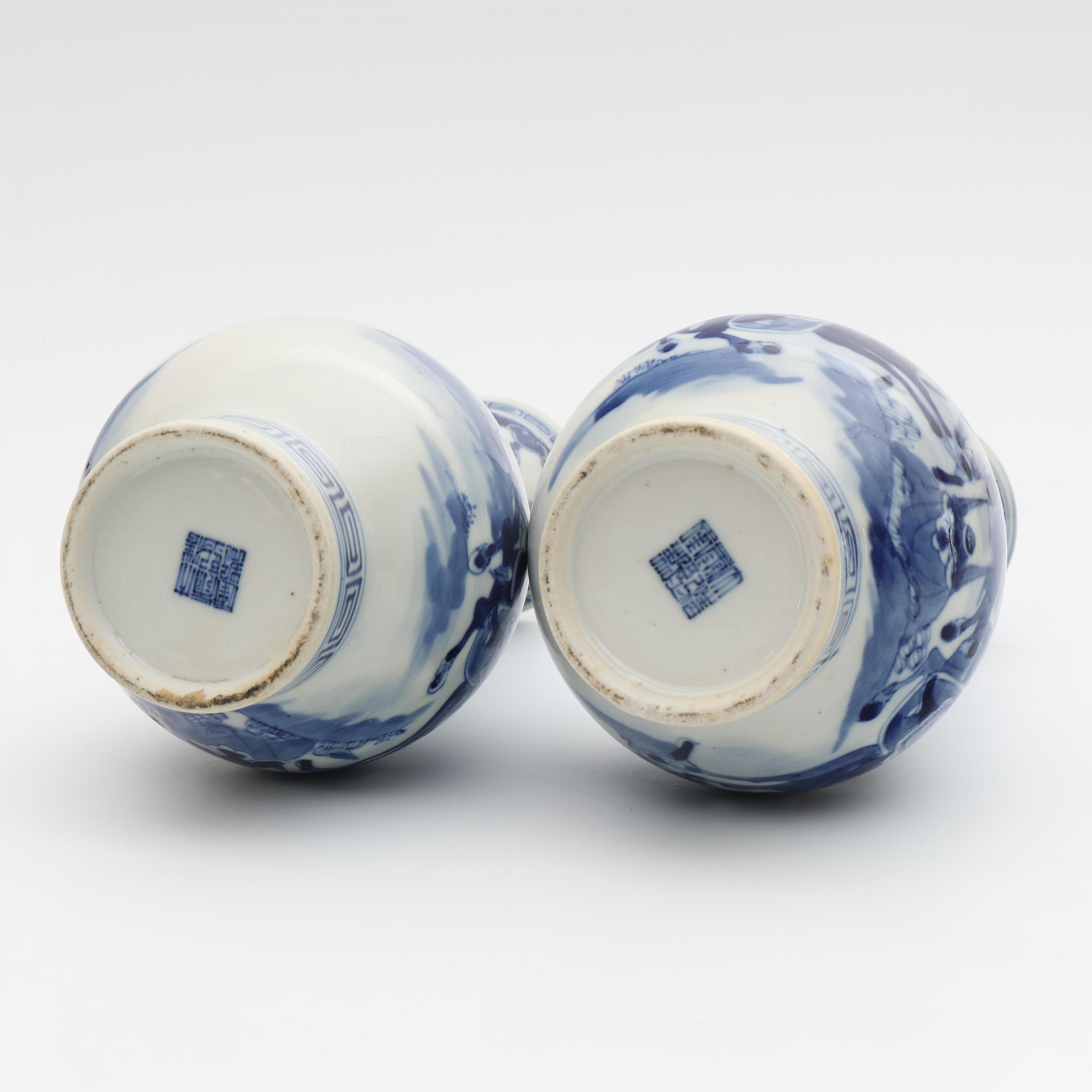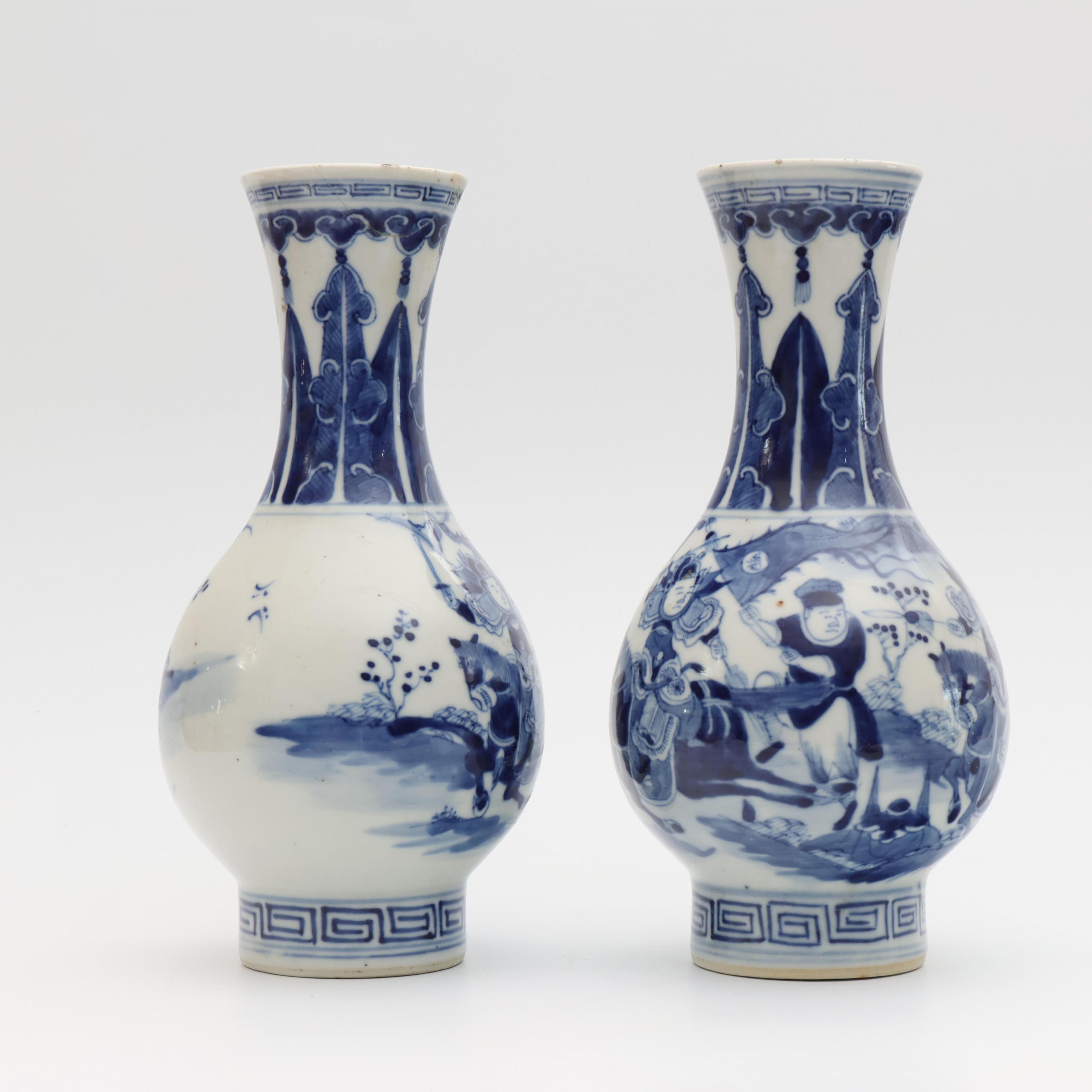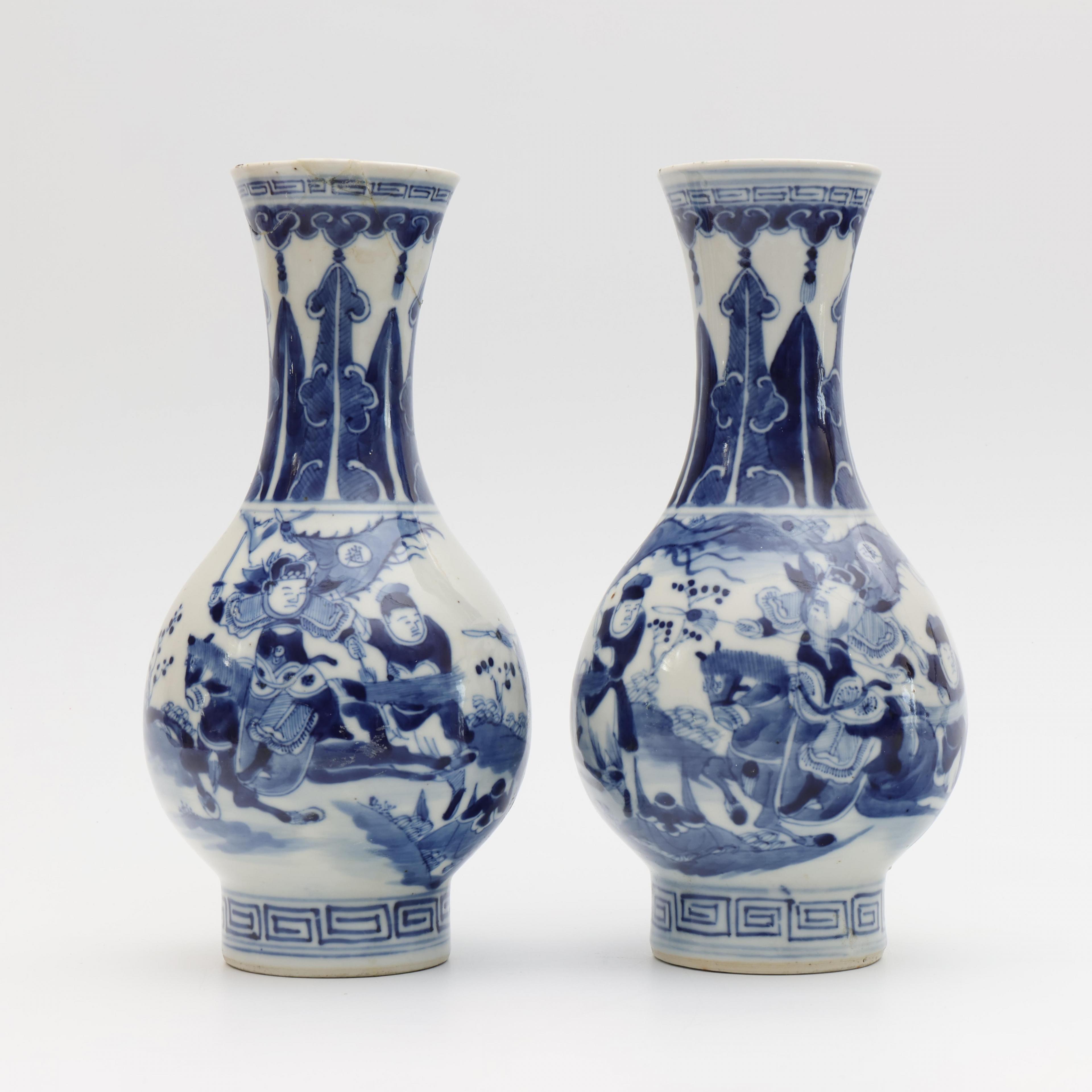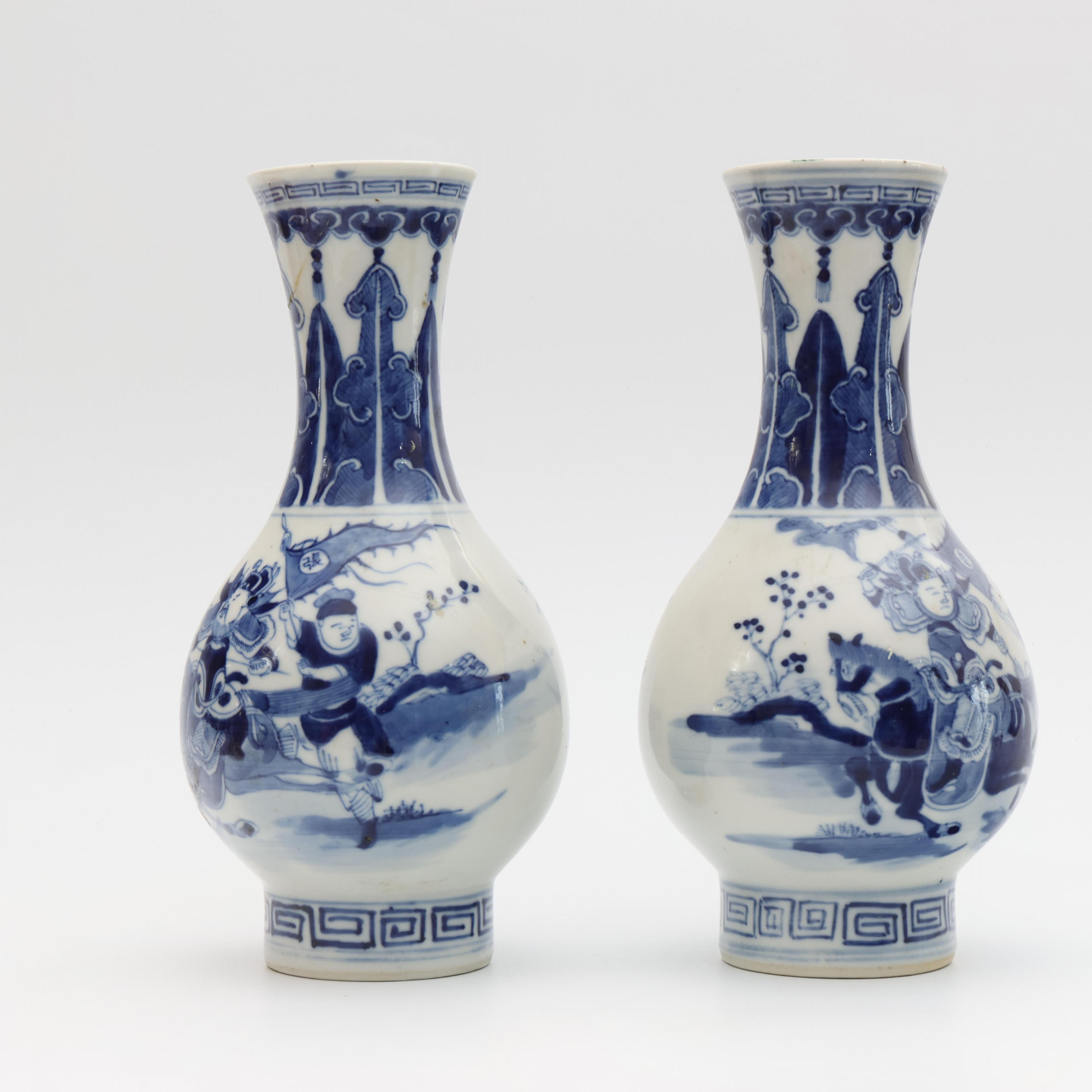 painted with a warrior scene, each with an apocryphal Qianlong seal mark (one with reglued neck, one with hairline)