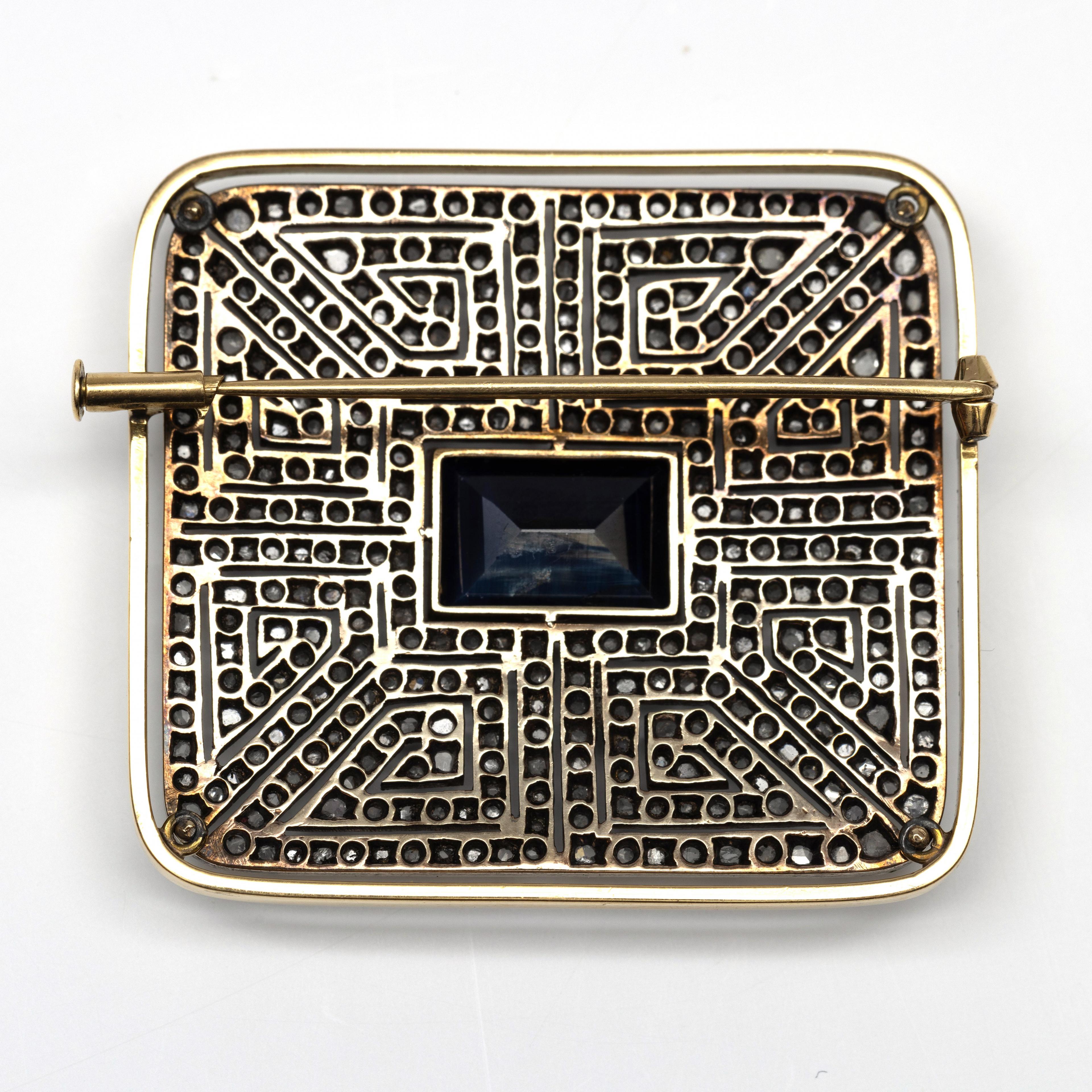 14 k. Gold and silver rectangular brooch. Centrally set with a rectangular faceted blue sapphire of approximately 4.90 ct. (approx. 8 x 12 mm), surrounded by a meandering pattern of small rose-cut diamonds.
