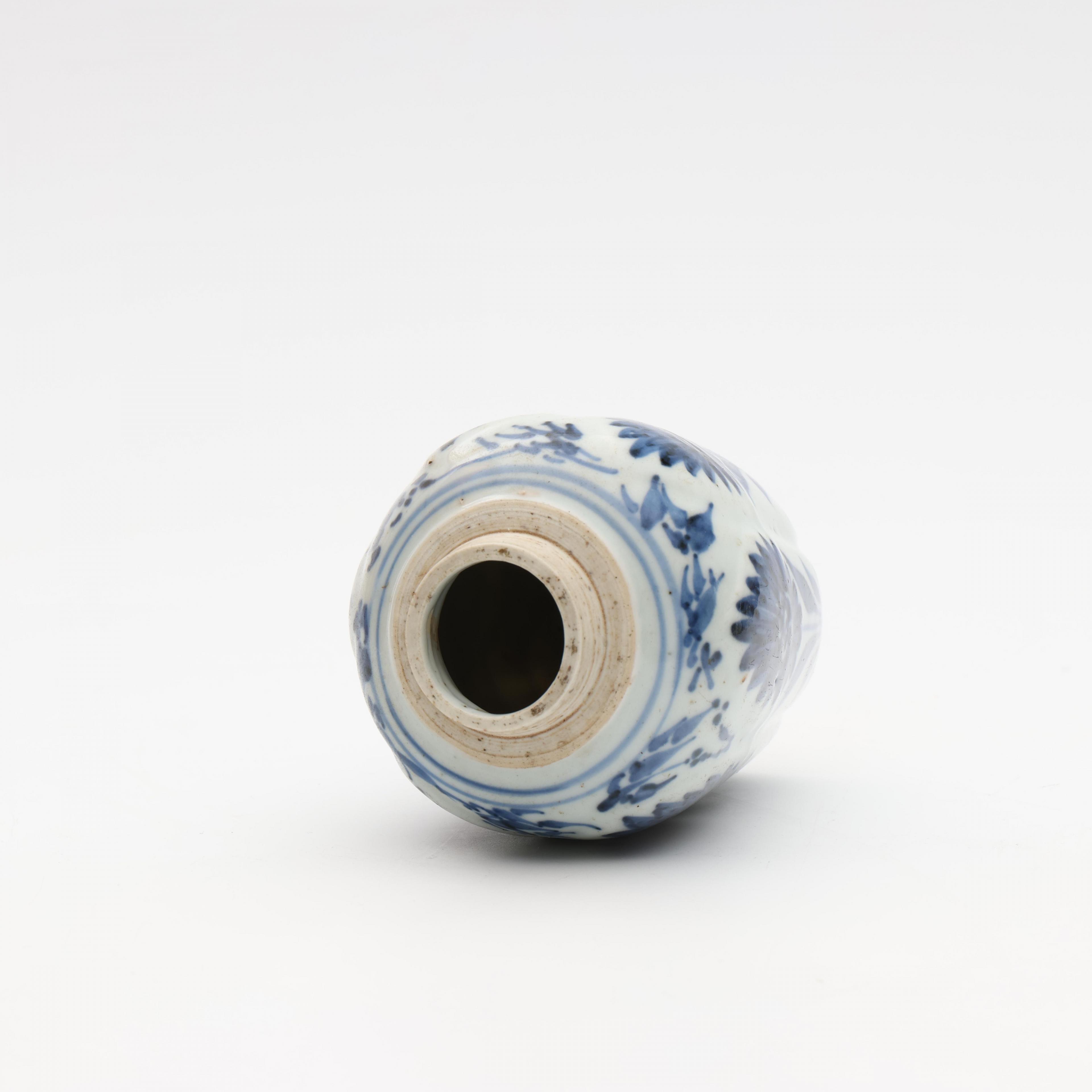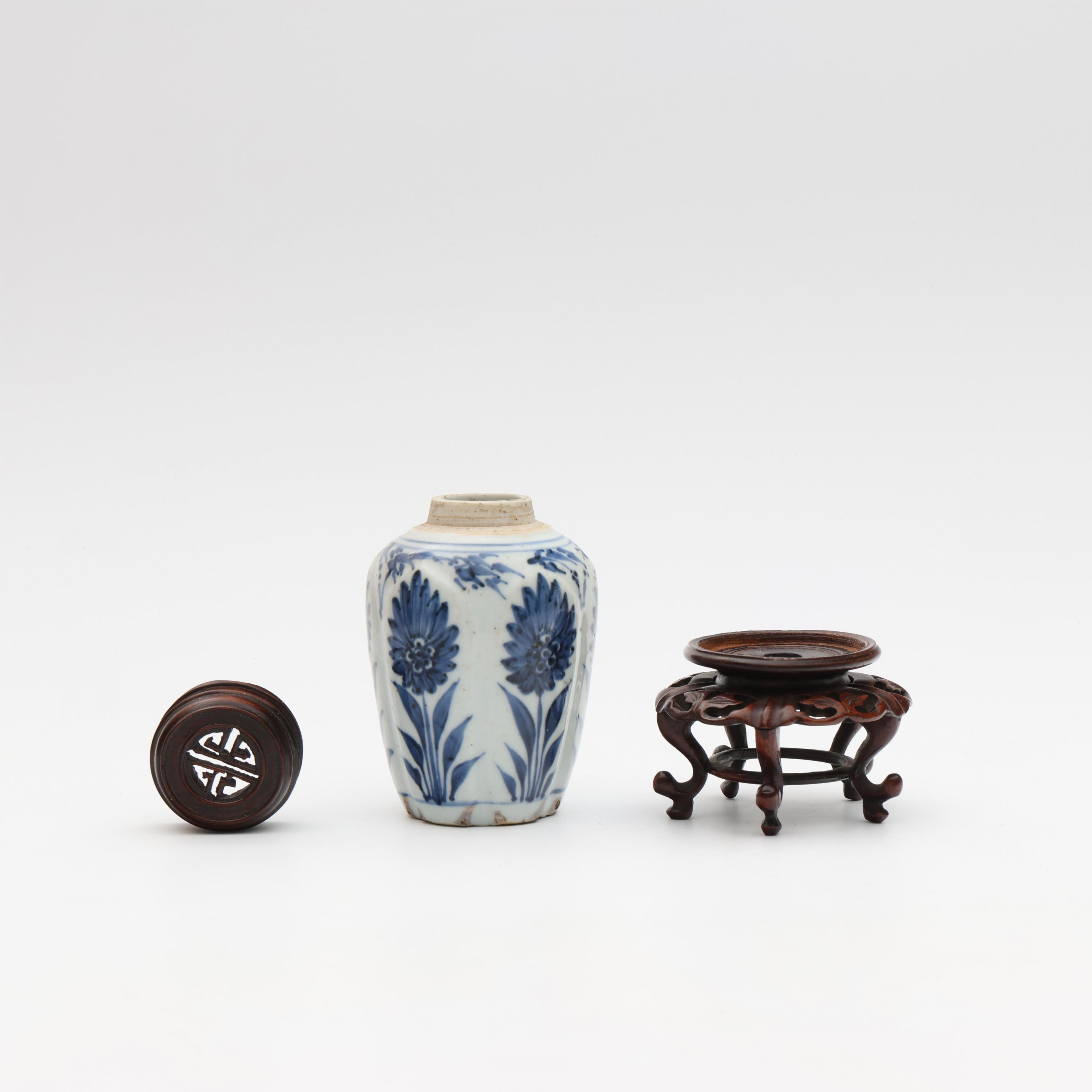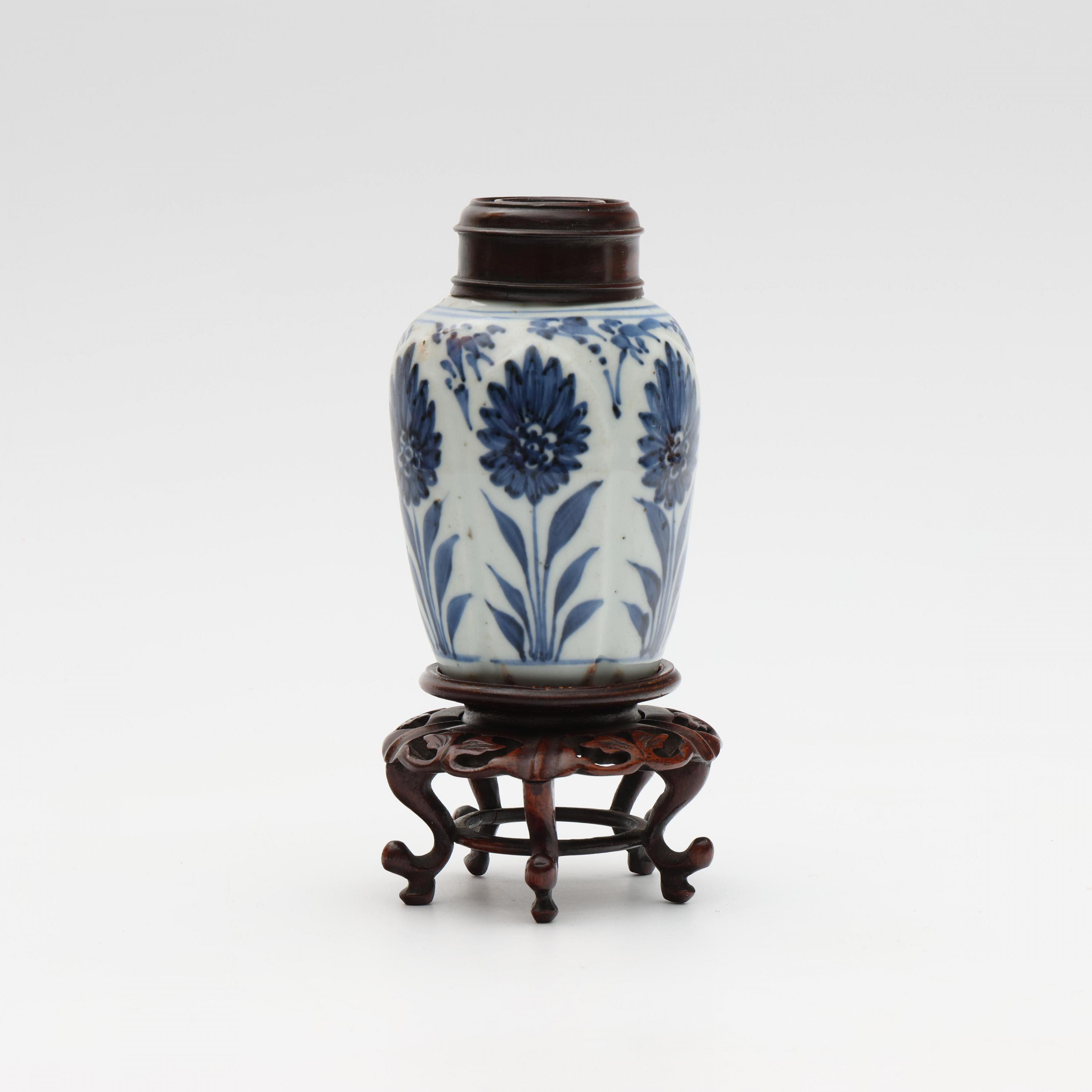 painted with upright flowers, with wood cover and stand (some glaze frits)