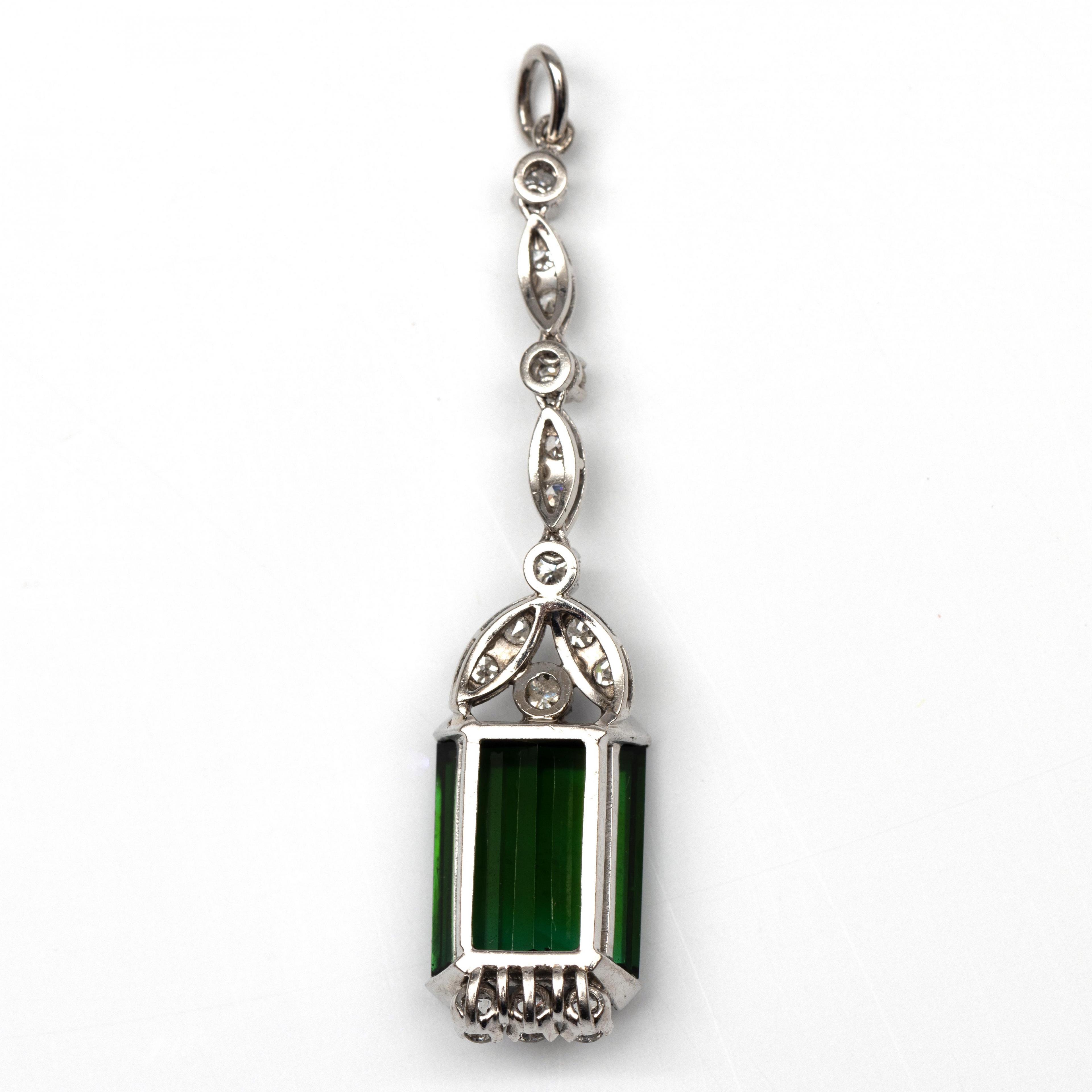 Platinum pendant. Consisting of small marquise-shaped and round ornaments set with brilliant-cut and single cut diamonds, terminating in an emerald-cut, bright dark green tourmaline (approx. 13.3 x 10.2 mm). Total diamond weight approx. 0.45 ct.