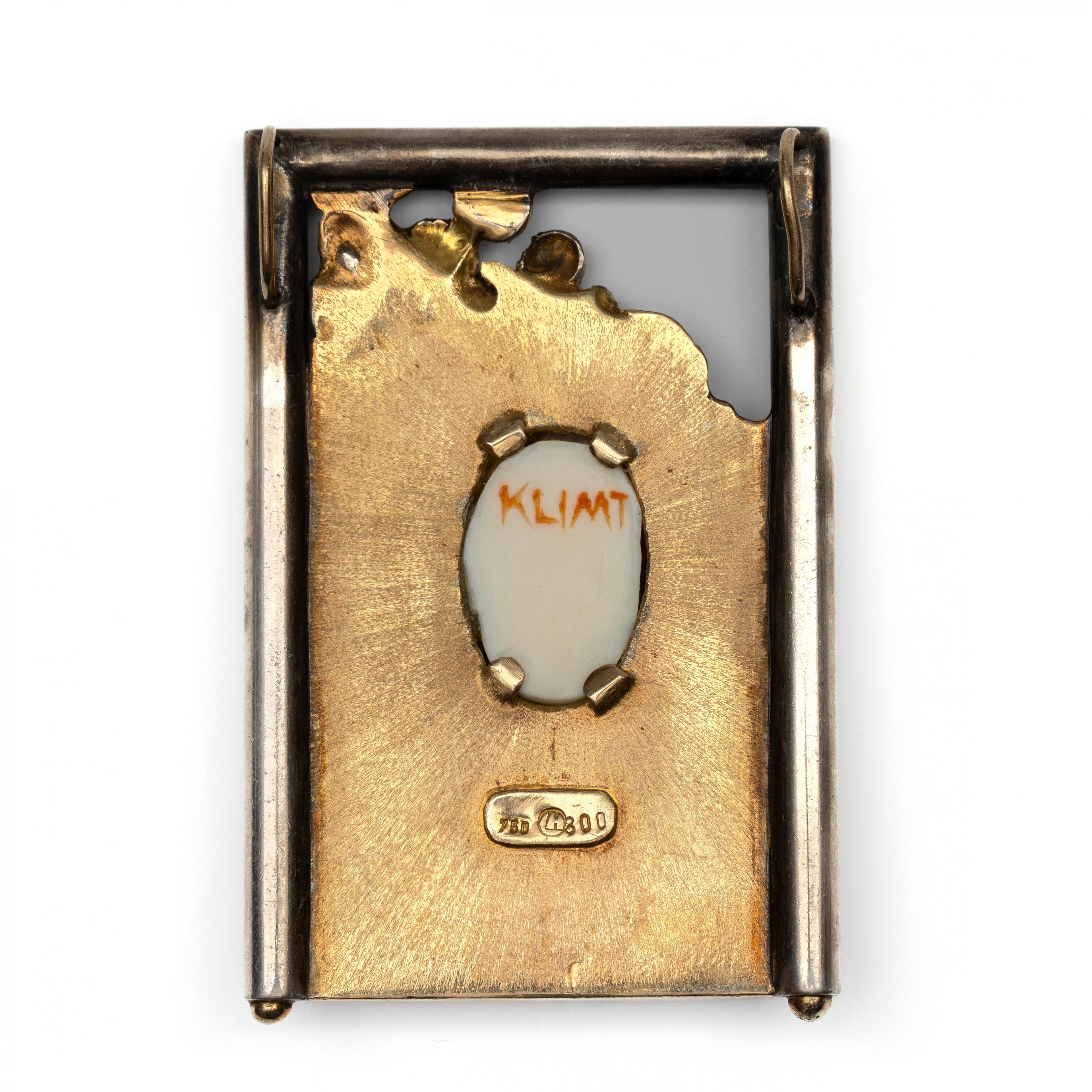 18 k. Gold and silver pendant, after Gustav Klimt's portrait of a lady with a hat and boa. The face made of plastic, with painted lips, eyes, and eyebrows.