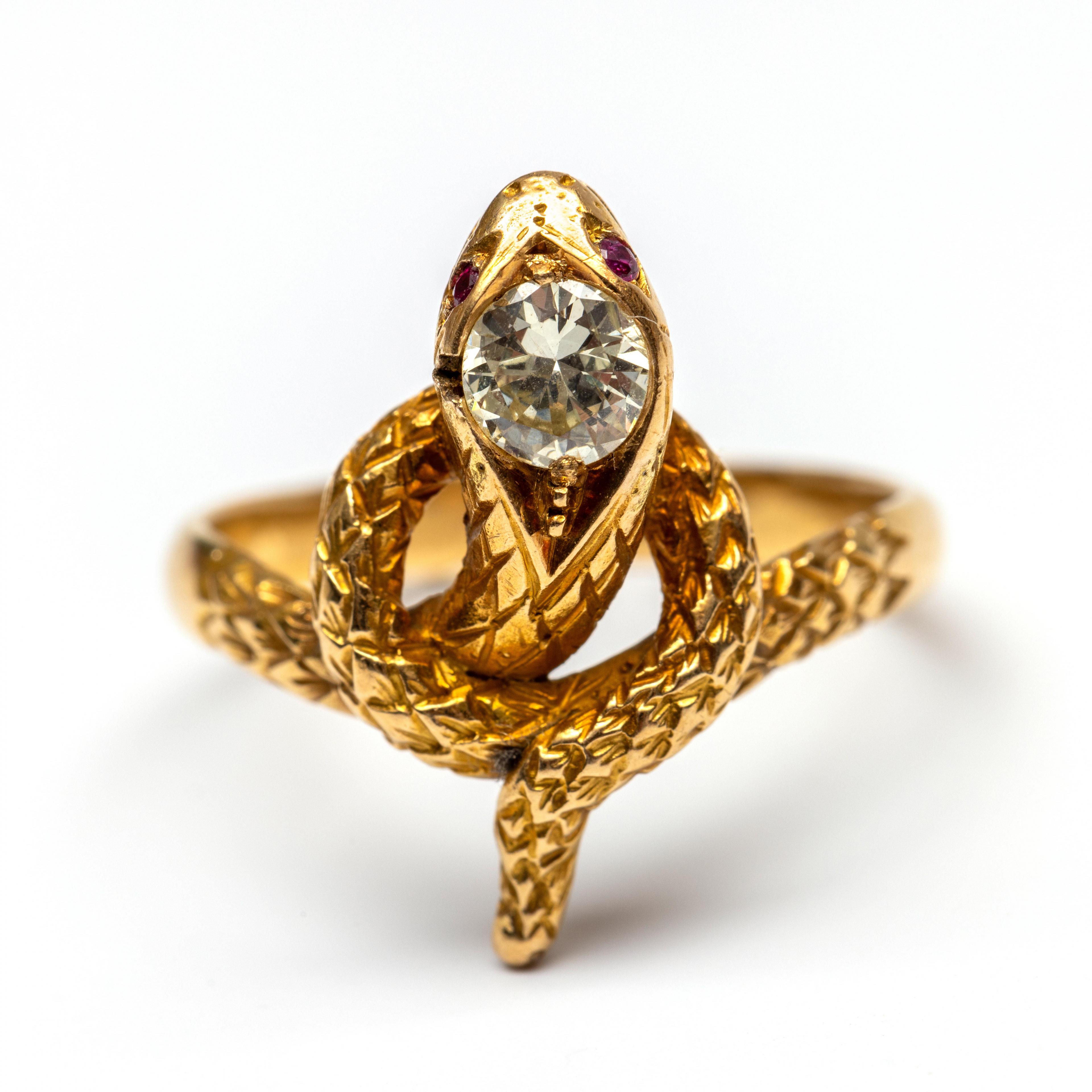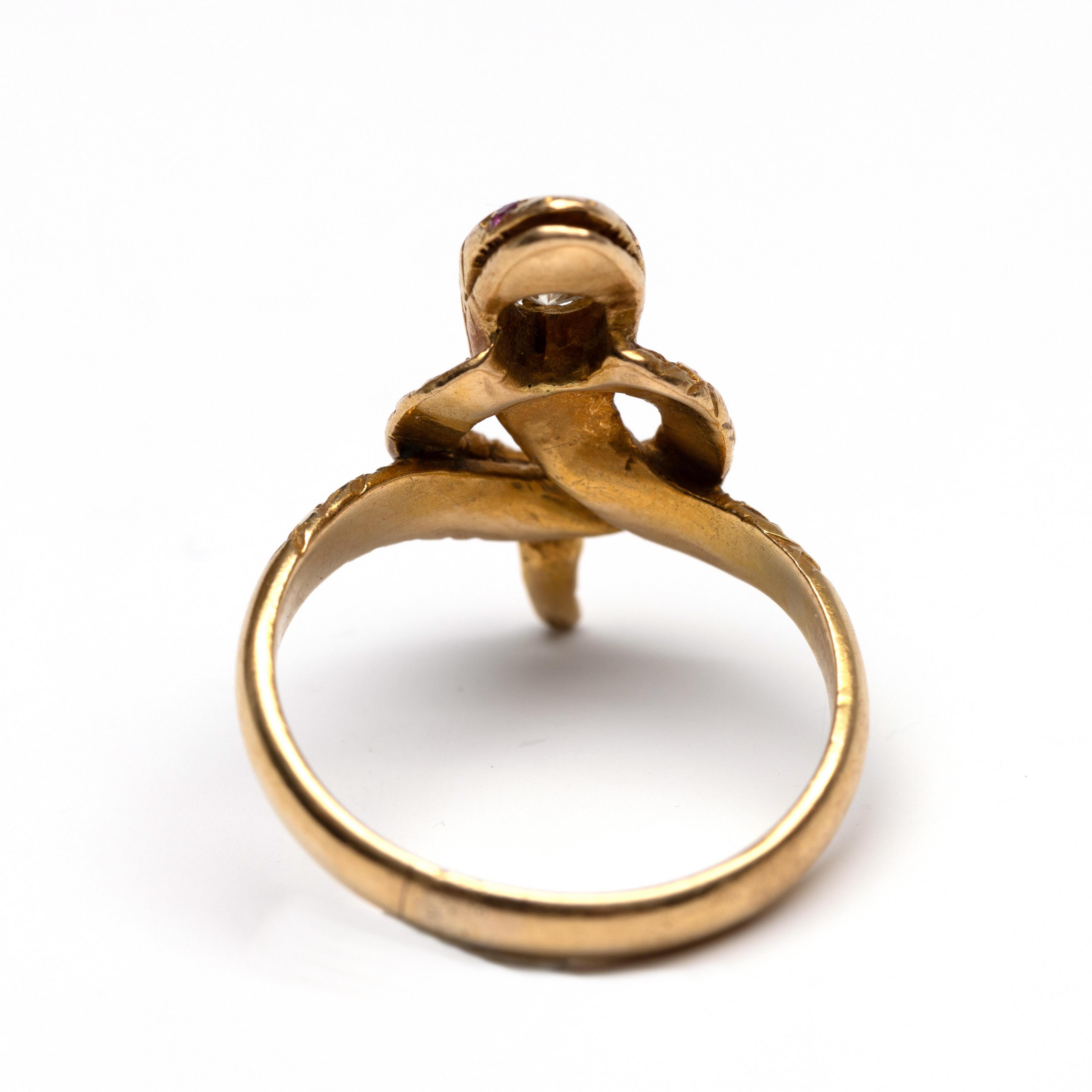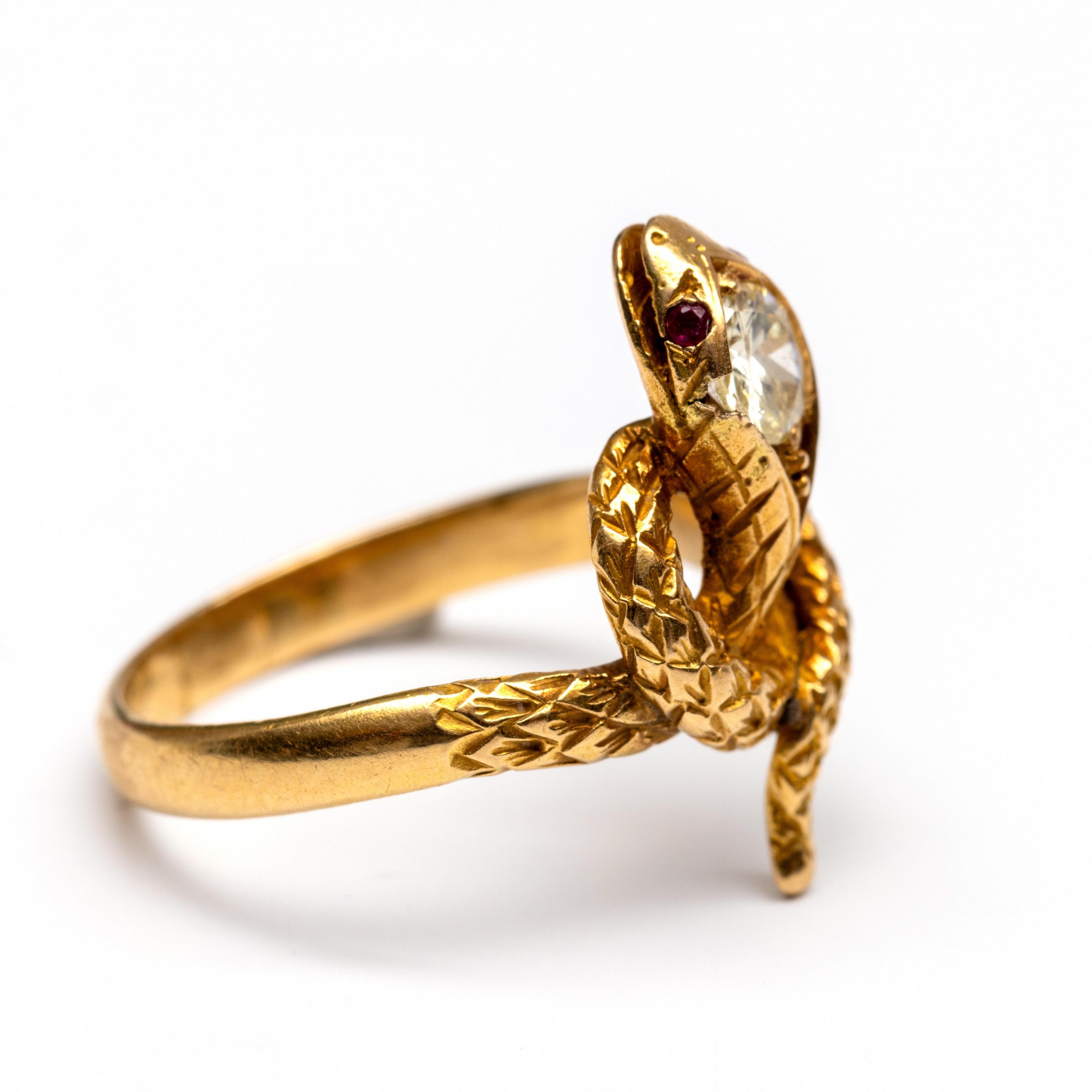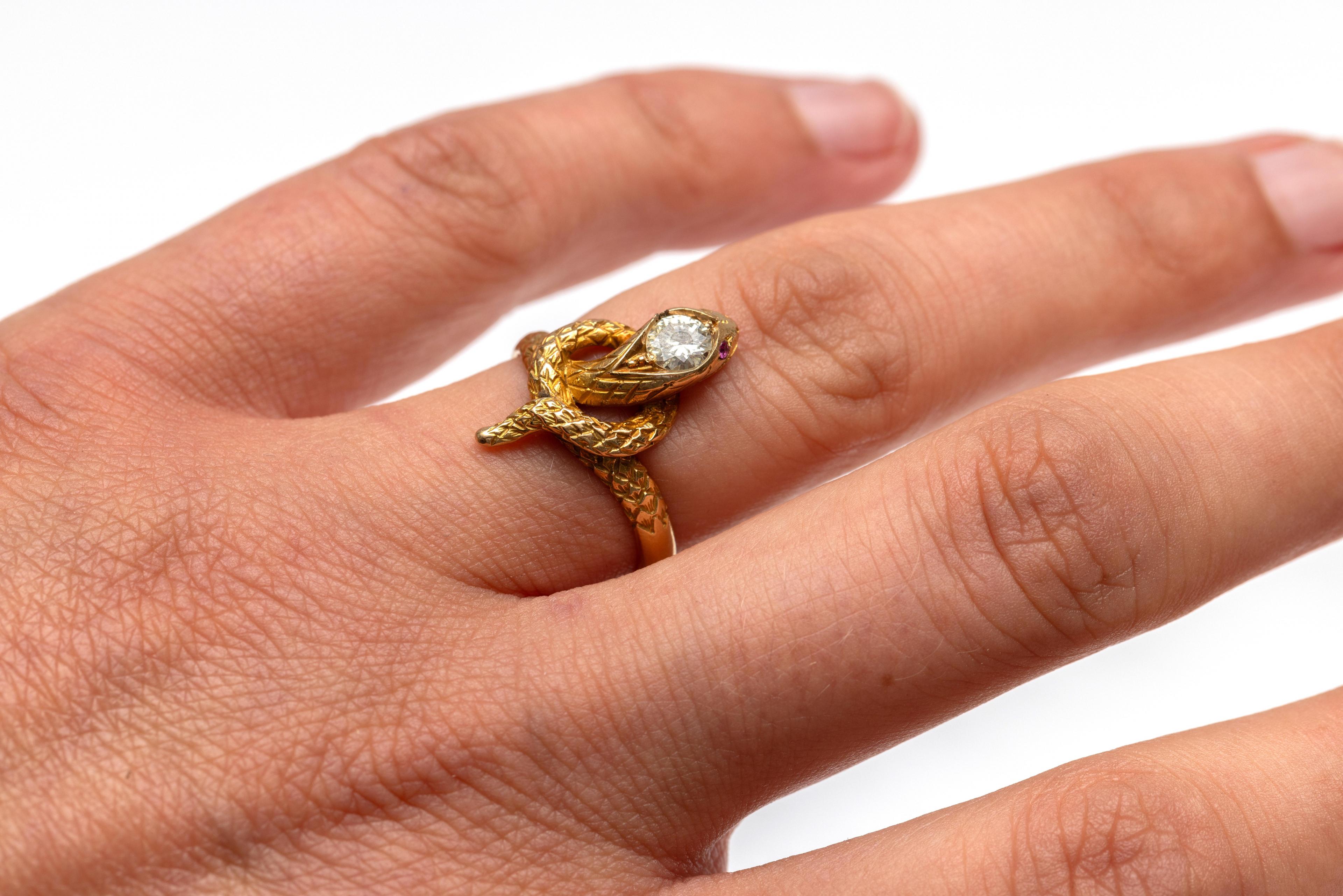 14 k. Gold ring in the shape of a coiled snake. The head set with a light yellow brilliant-cut diamond of approximately 0.25 ct., the eyes are set with a small faceted ruby.