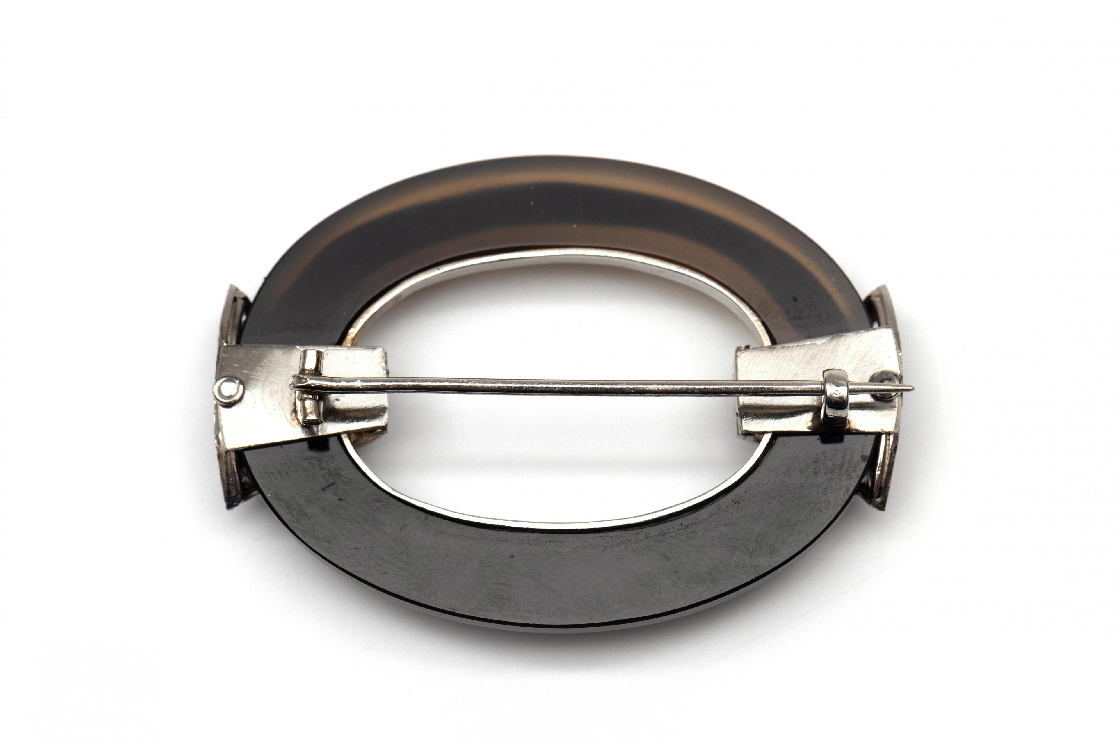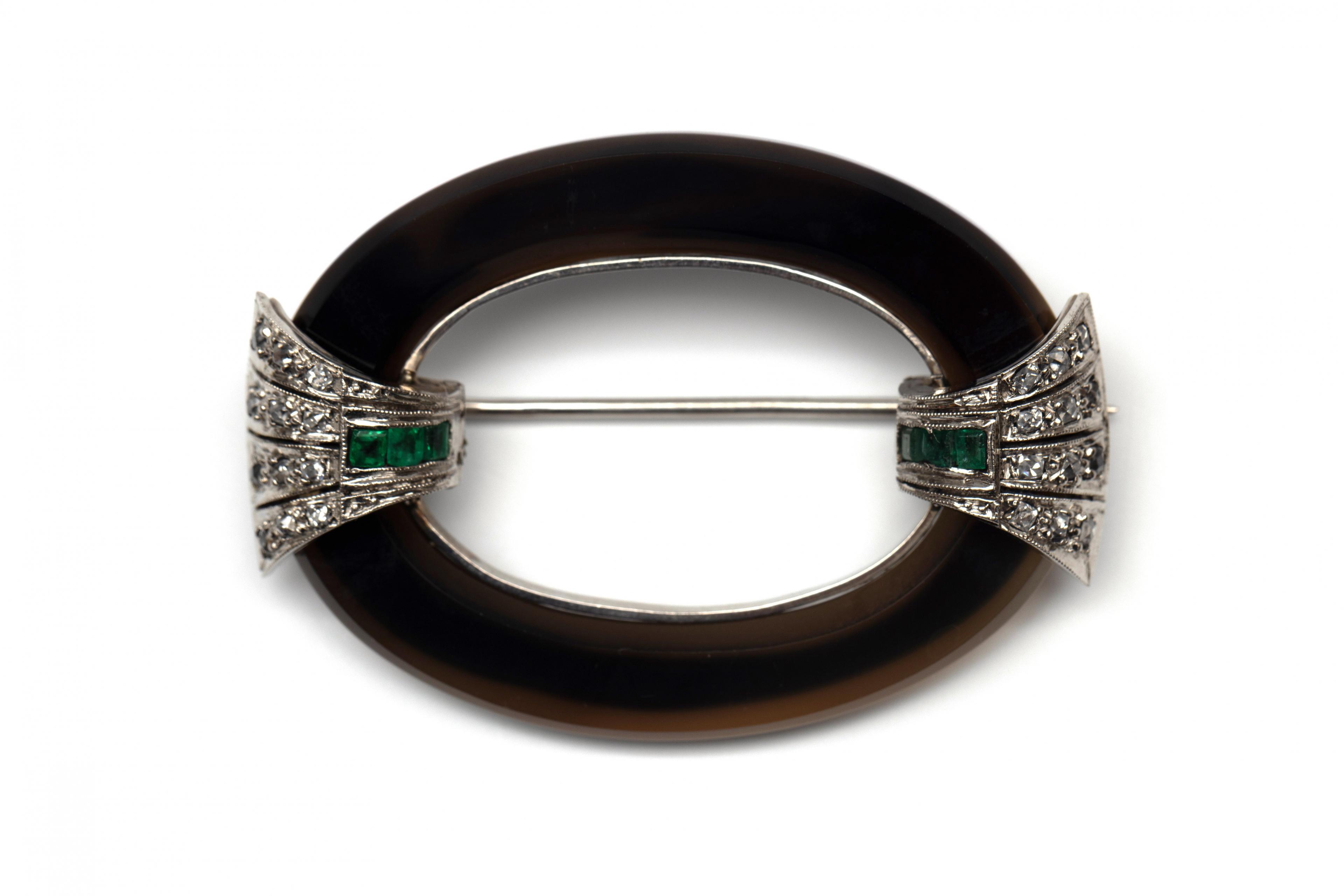 Platinum oval brooch, Art Deco. Constructed with two bands of agate, the sides with a fan-shaped appliqué set with calibrated emeralds and small, old, brilliant-cut diamonds.