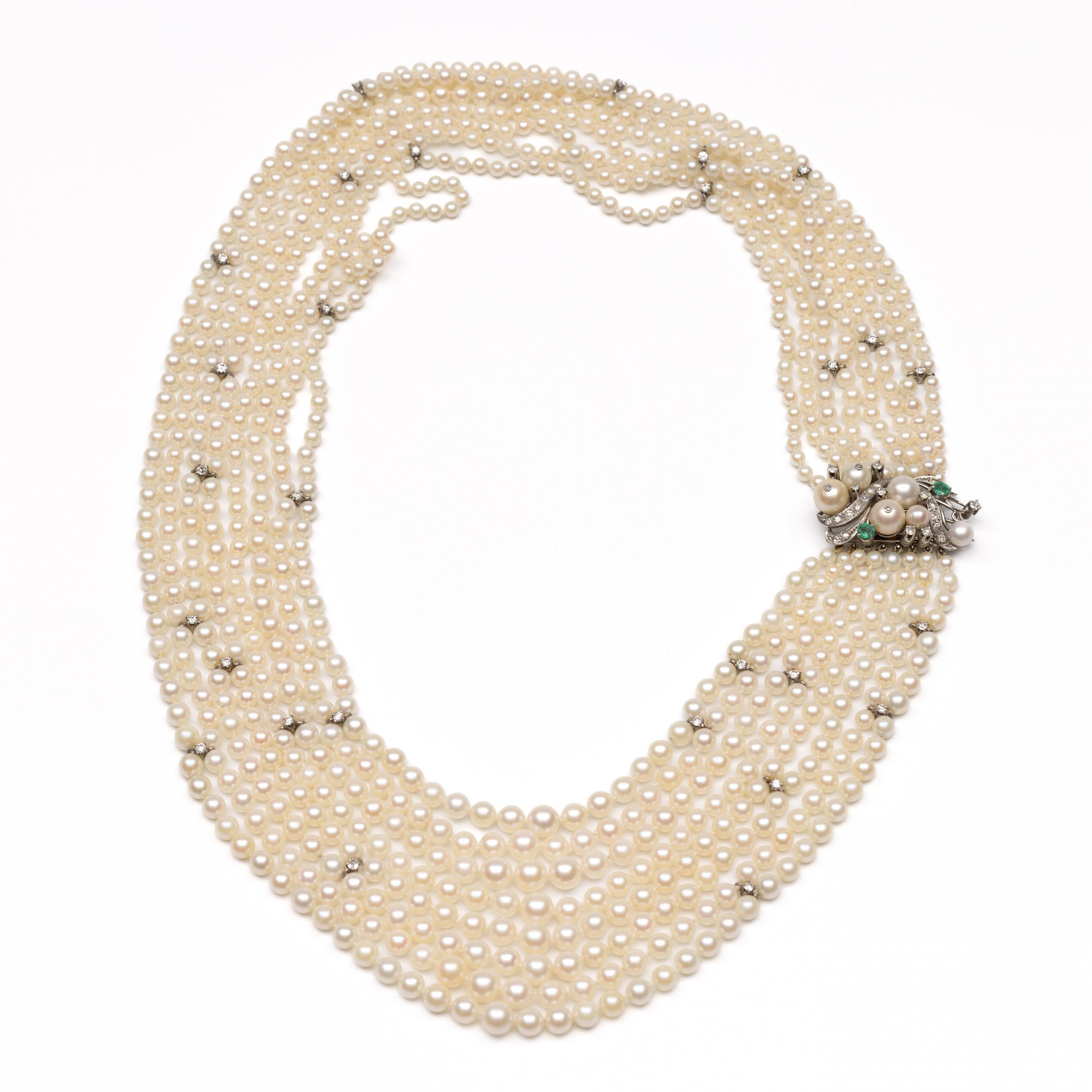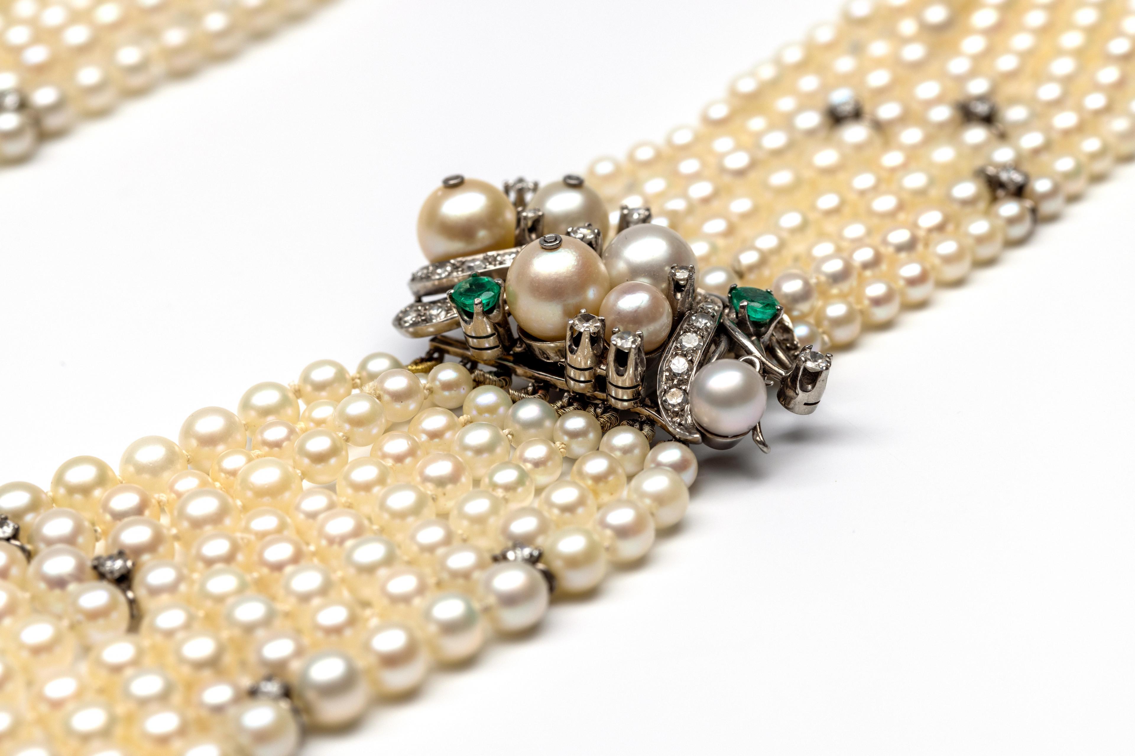 van acht strengen witte cultivé parels, aflopend in grootte vanaf de voorzijde (7,5 - 4 mm), waartussen briljant geslepen diamanten. Aan een 14 kt. witgouden met platina sluiting (gedragen aan de zijkant) met golvende banen. Bezet met parels, smaragd en achtkant geslepen diamanten
