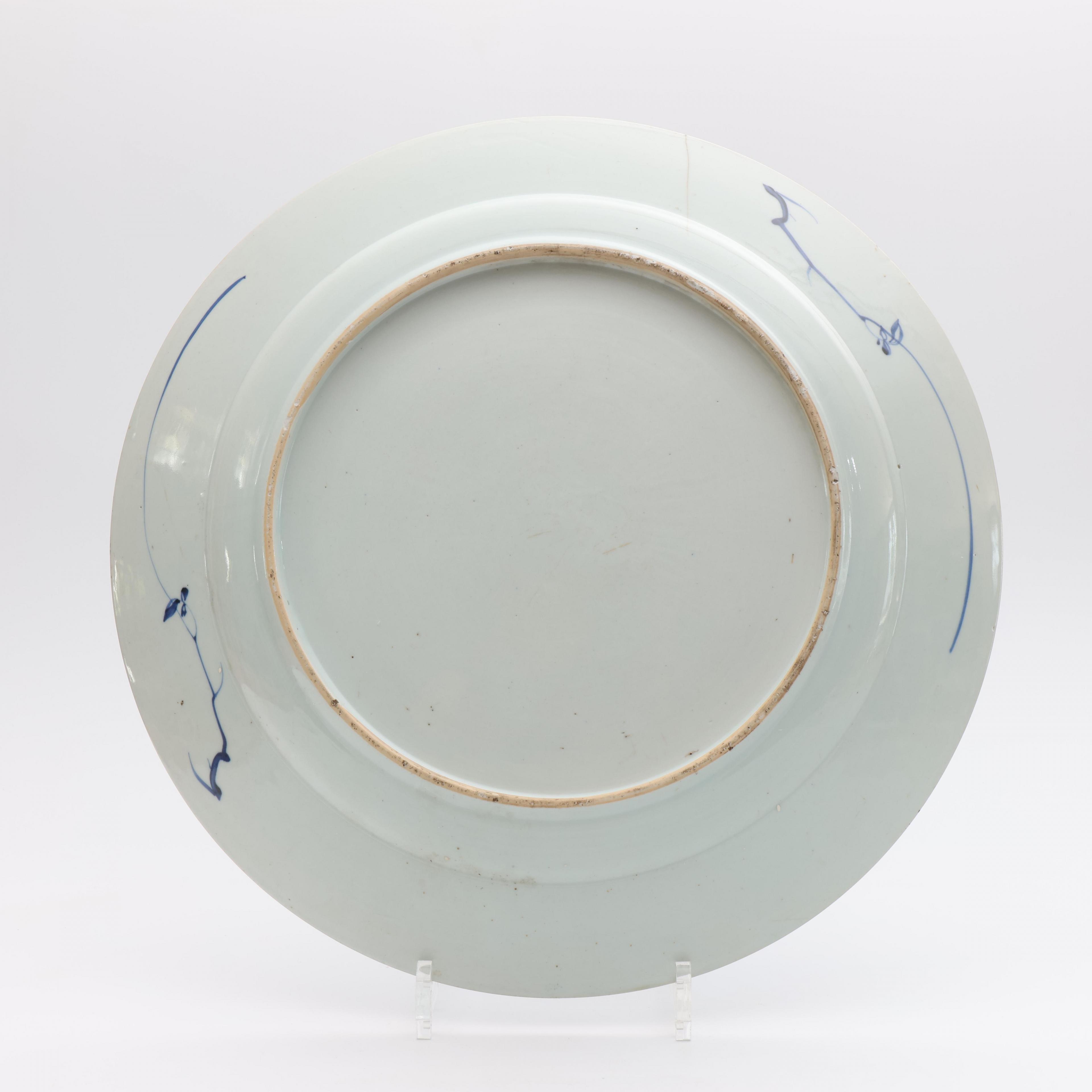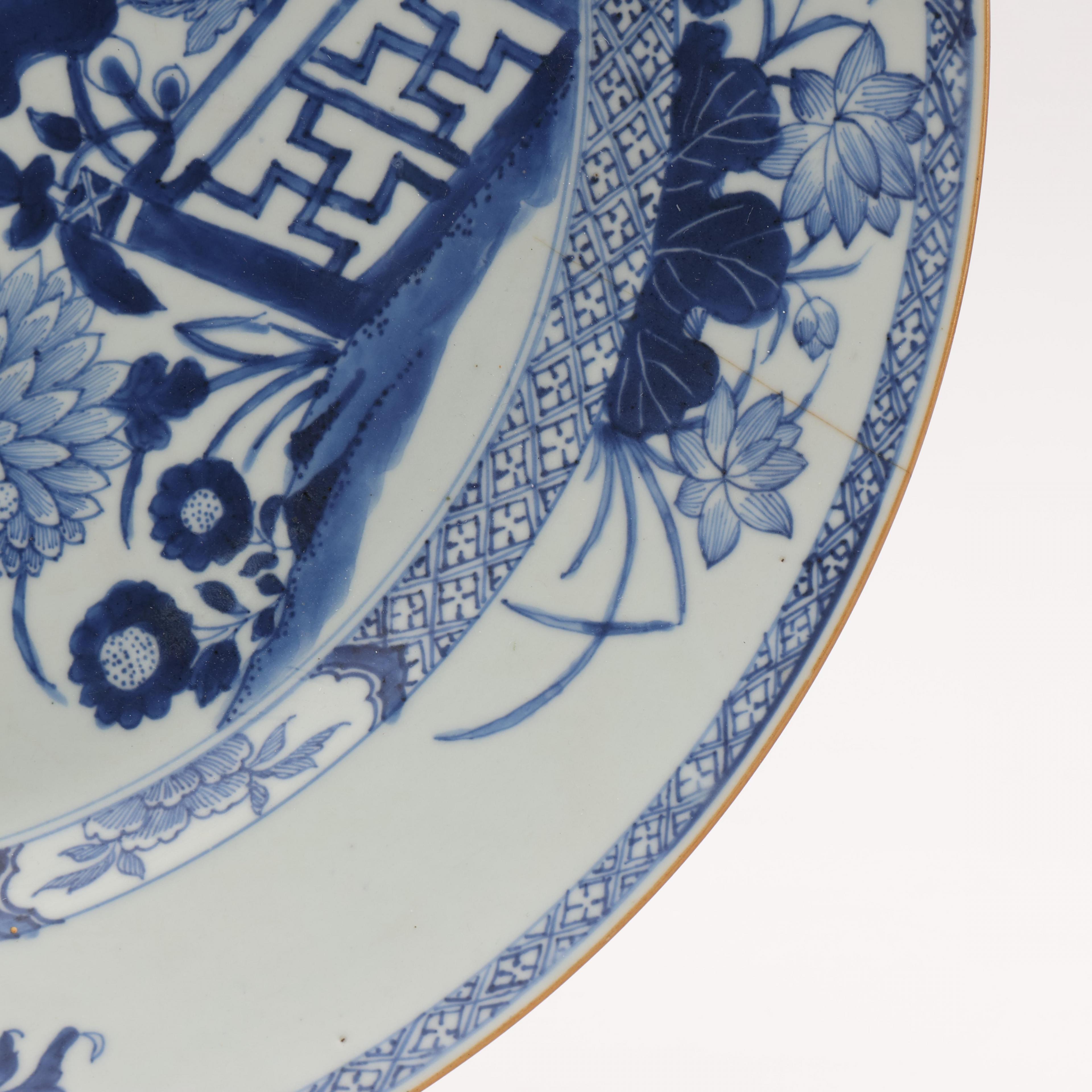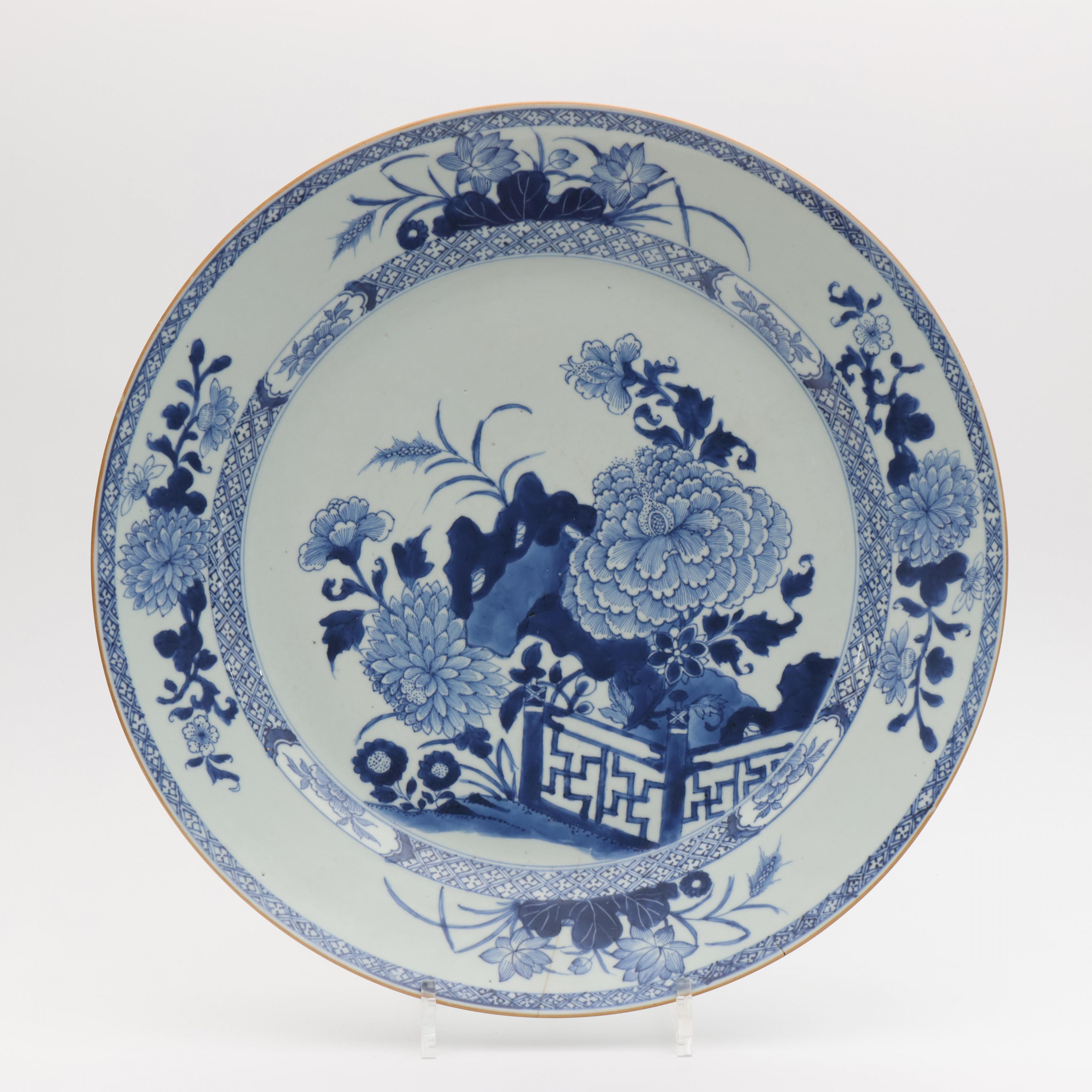 painted with large peony blooms in a fenced garden (hairline rim crack predominantly visible to the reverse of 6 cm long)