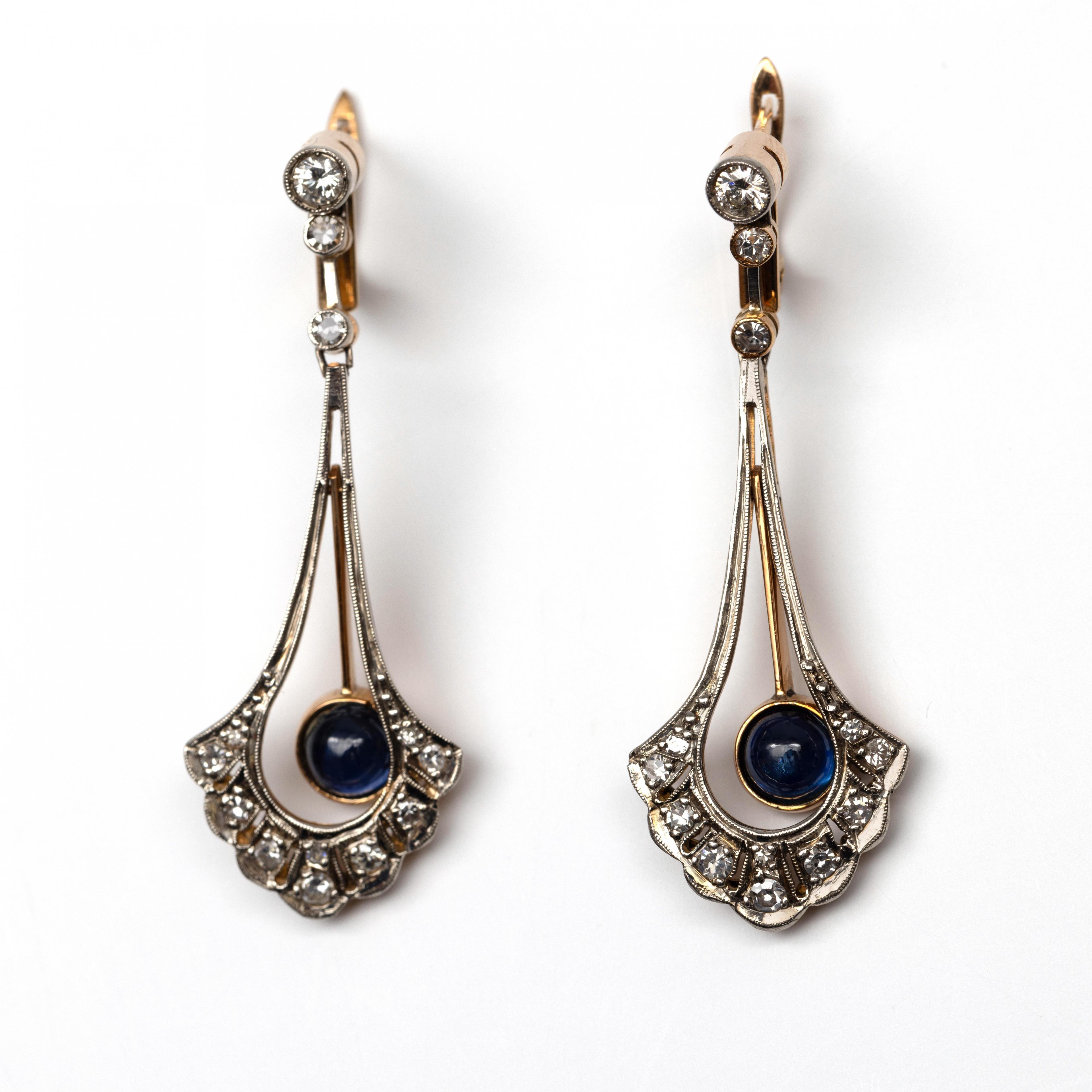 Art Deco-style 14 k. gold earrings. The bottom fan-shaped set with single-cut diamonds, with a round cabochon-cut blue sapphire dangling freely in the center. Total diamond weight: approx. 0.60 ct.