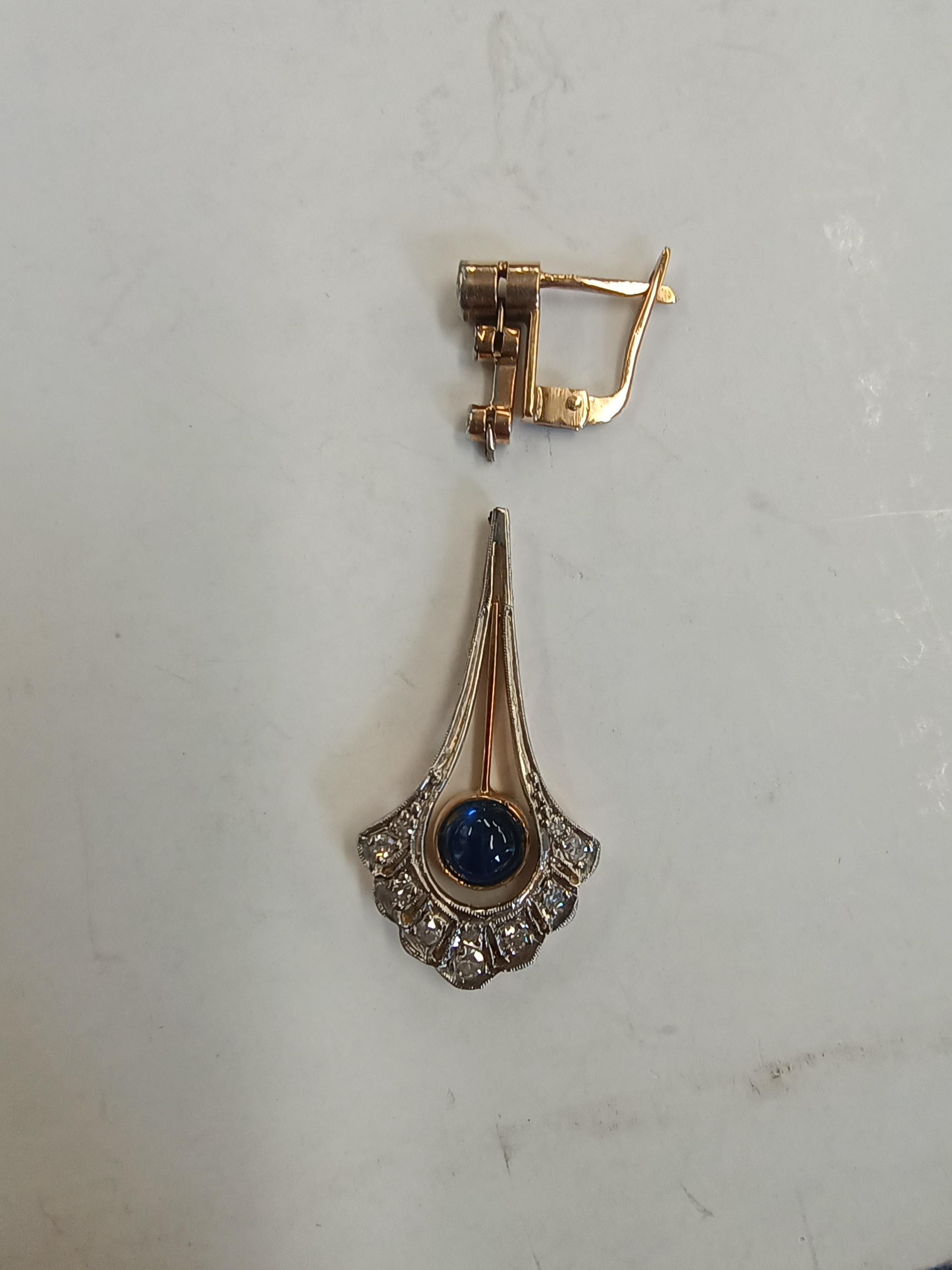 De onderzijde in de vorm van een waaier bezet met achtkant geslepen diamant, in het midden los bungelend, een ronde cabochon geslepen blauwe saffier. Totaal diamant gewicht ca. 0.60 ct.