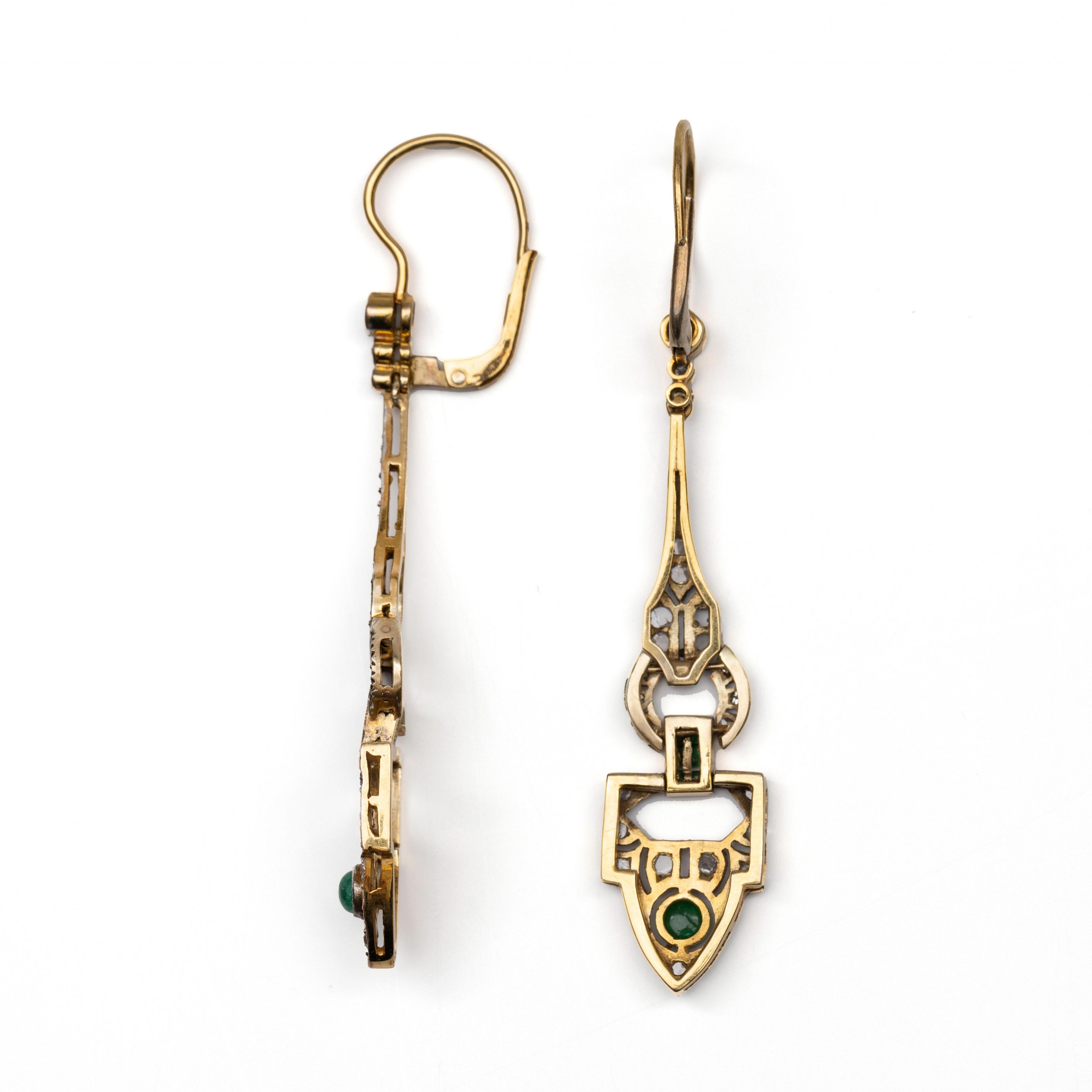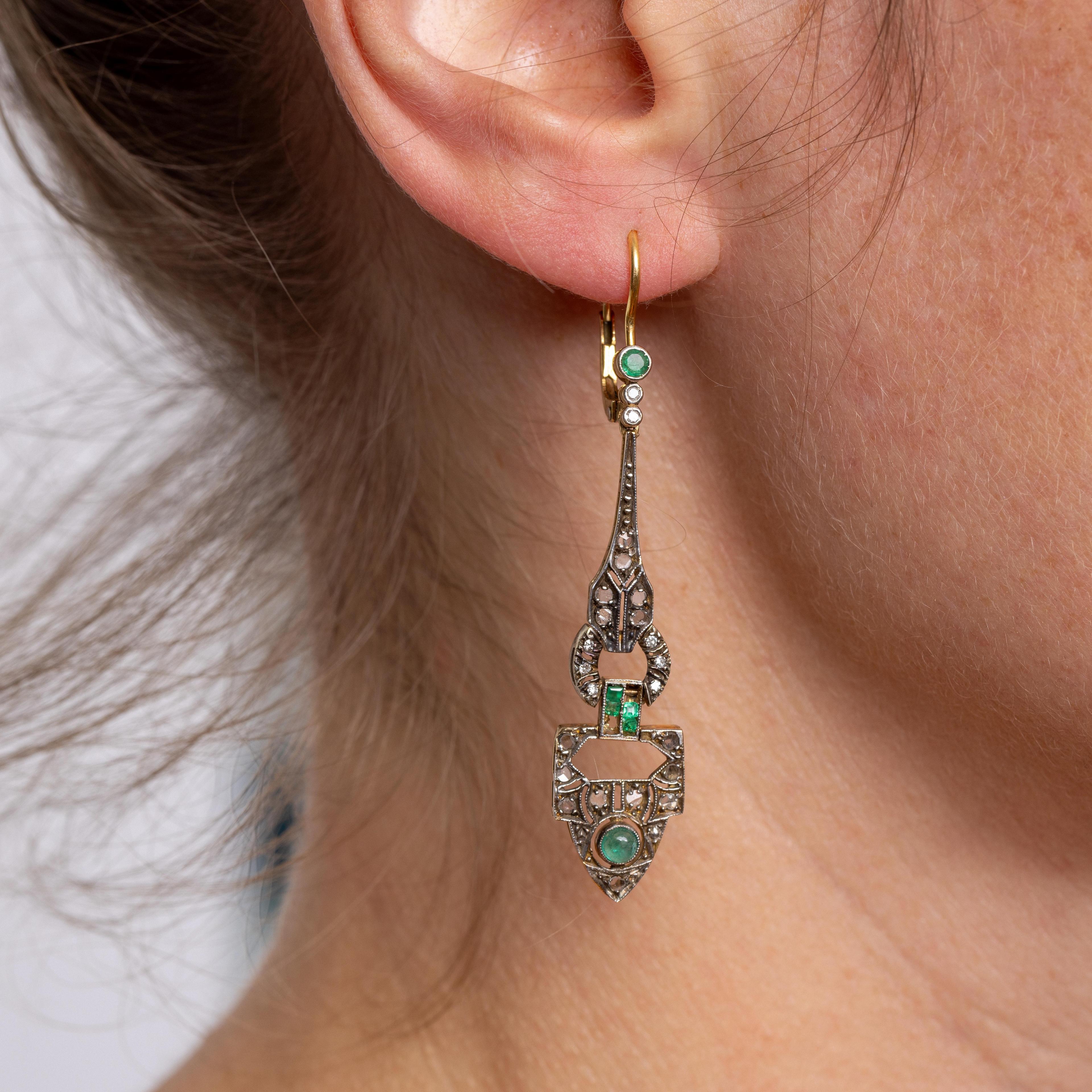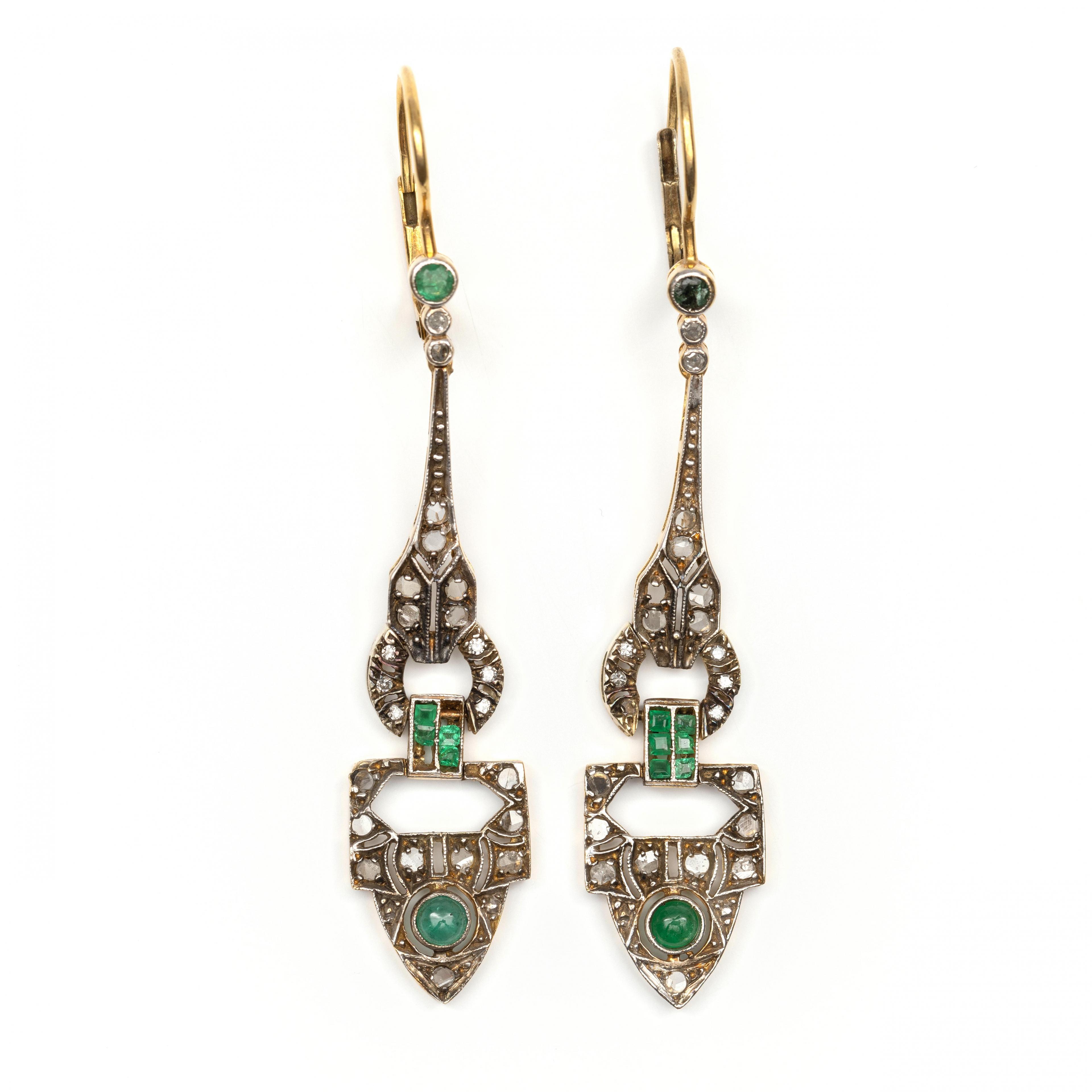 Gold and silver earrings in Art Deco style. Made up of geometric shapes, set with cabochon and square-cut emeralds and rose-cut diamonds.