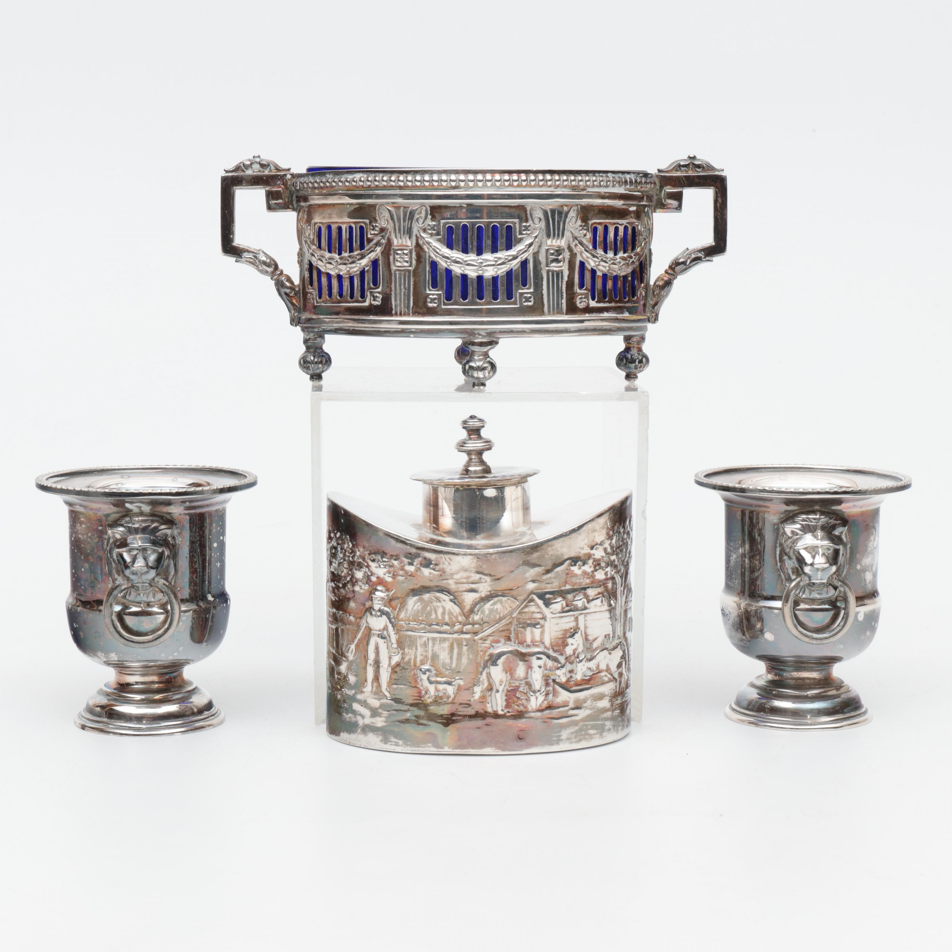 w.o. theebus en schuitvormige mand met blauw glas.